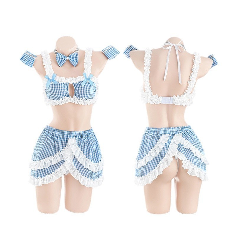 [RJ] สดสีฟ้าลายสก๊อต หวานใจ ชุดแม่บ้านชุดชั้นในเซ็กซี่คอสเพลย์ชุดแม่บ้าน