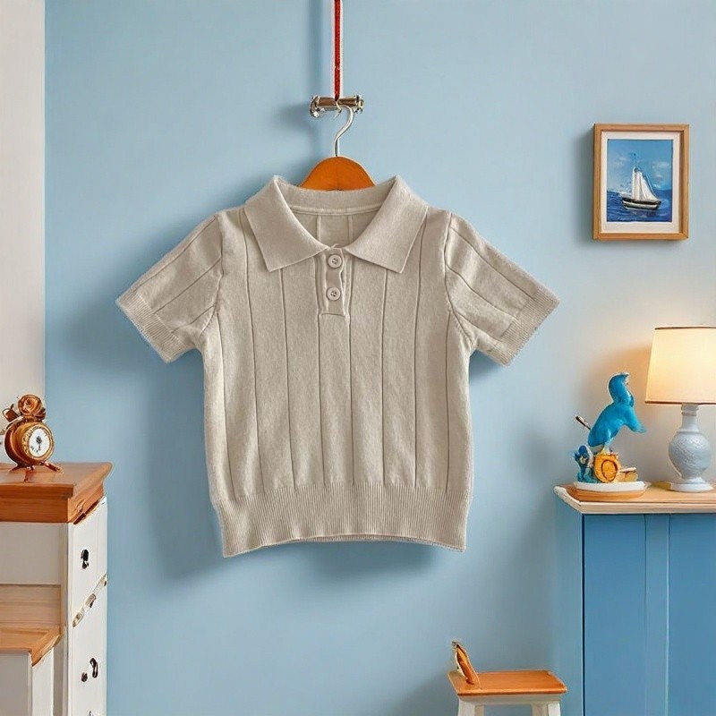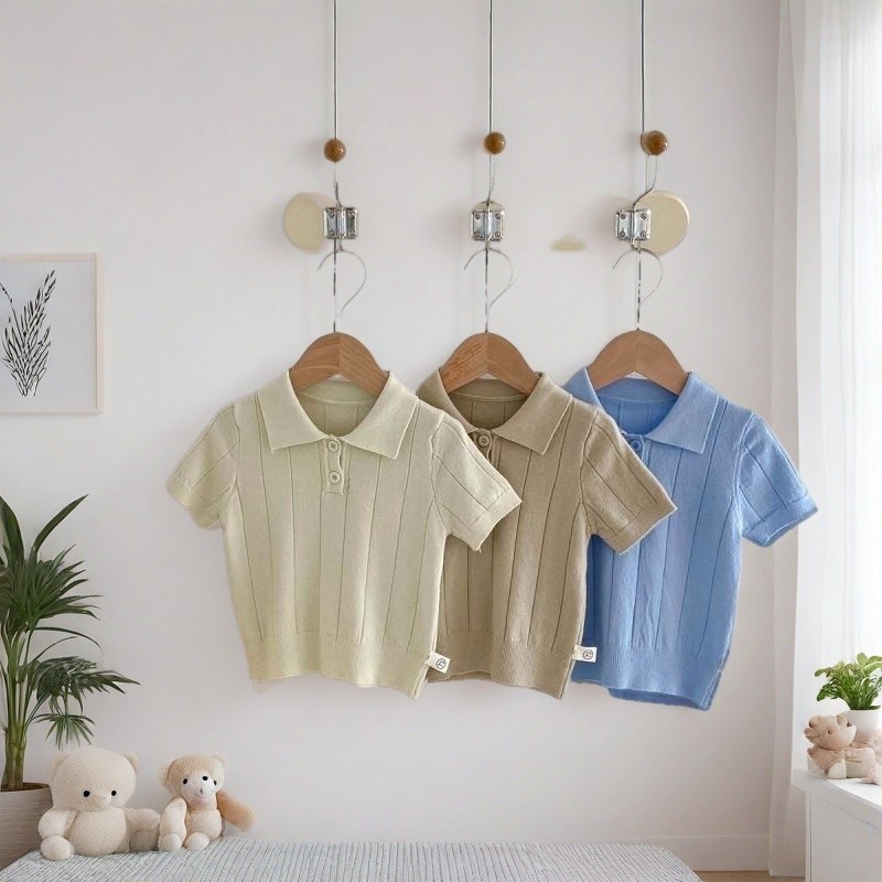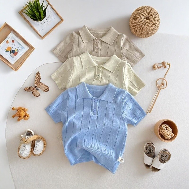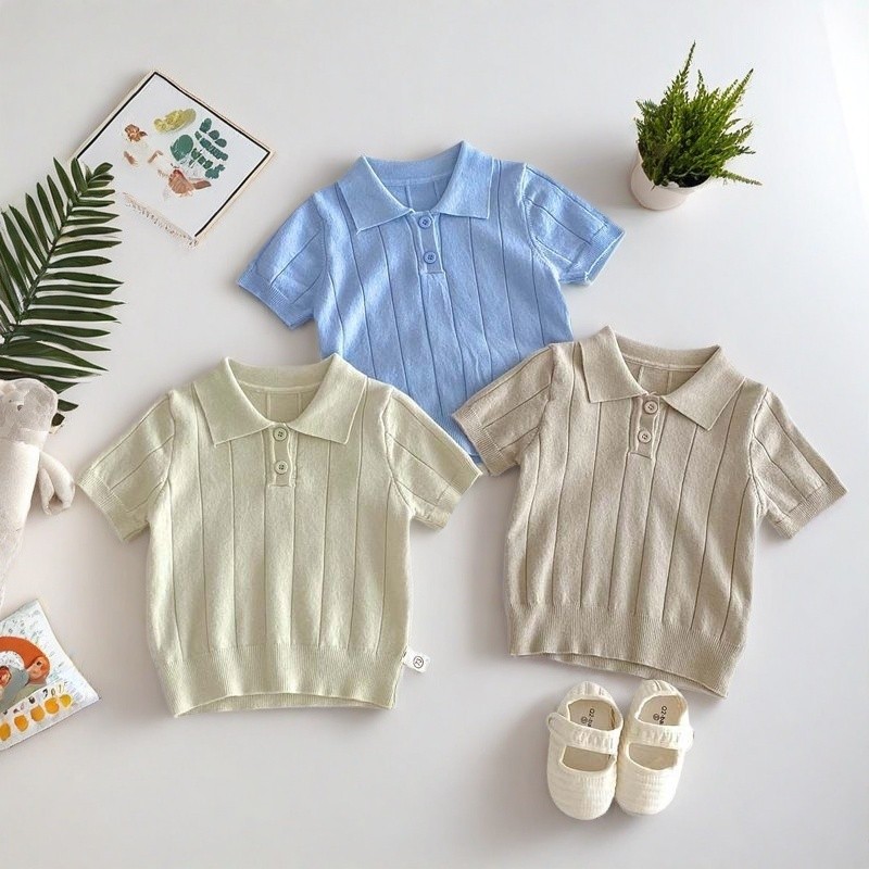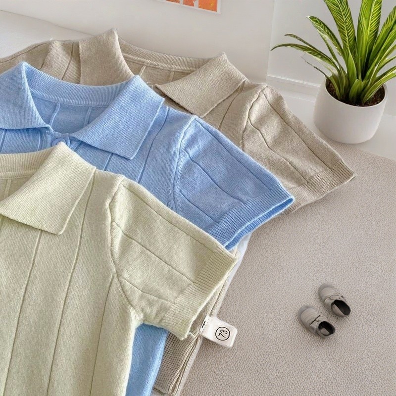 เสื้อโปโลคอปก ทารกกระโหลกสไตล์โปโลบางแขนสั้นเสื้อกันหนาวกลางเด็กใหญ่สีทึบแฟชั่นปกด้านบน4.7