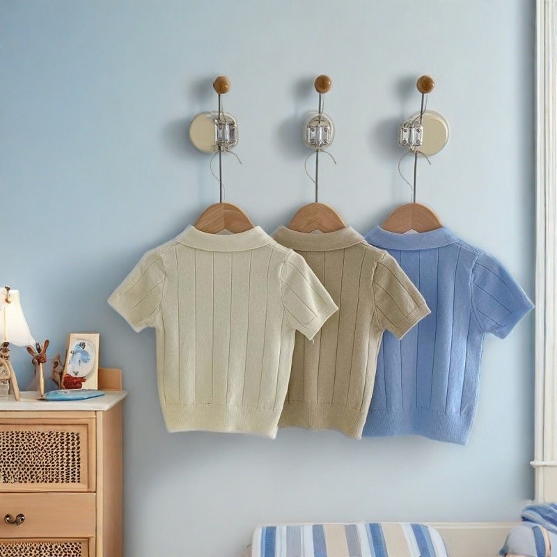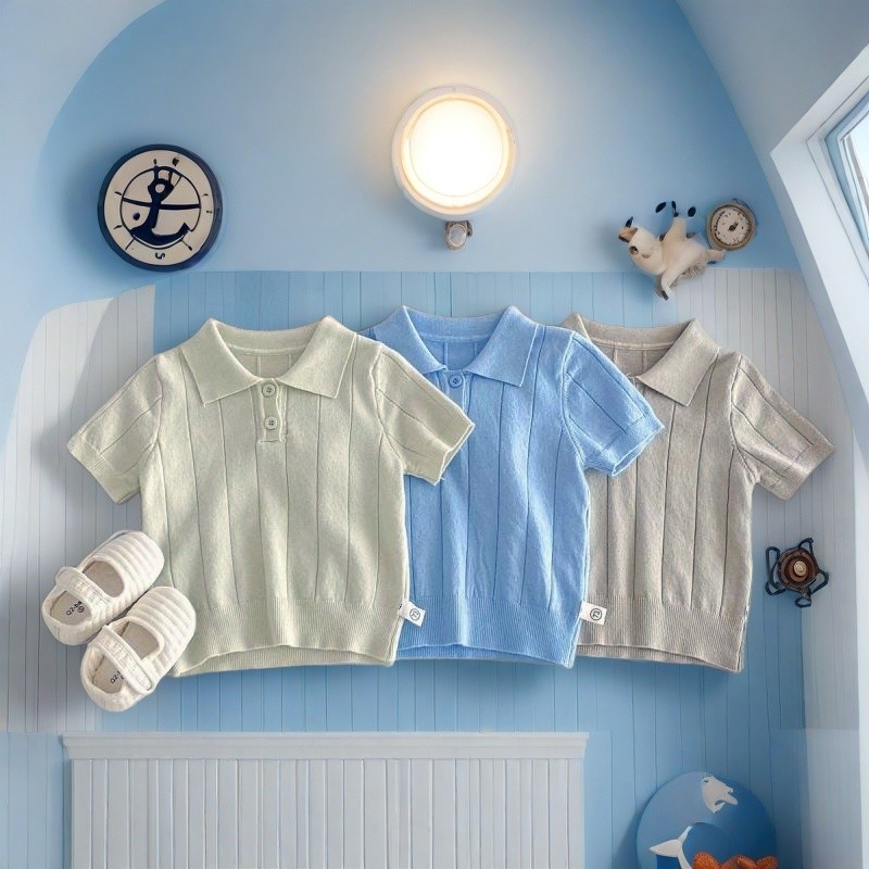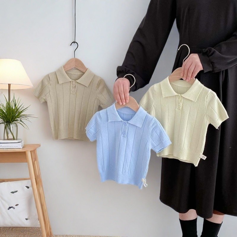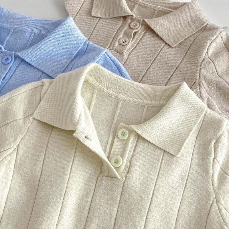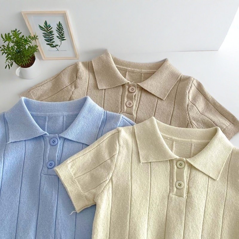 เสื้อโปโลคอปก ทารกกระโหลกสไตล์โปโลบางแขนสั้นเสื้อกันหนาวกลางเด็กใหญ่สีทึบแฟชั่นปกด้านบน4.7