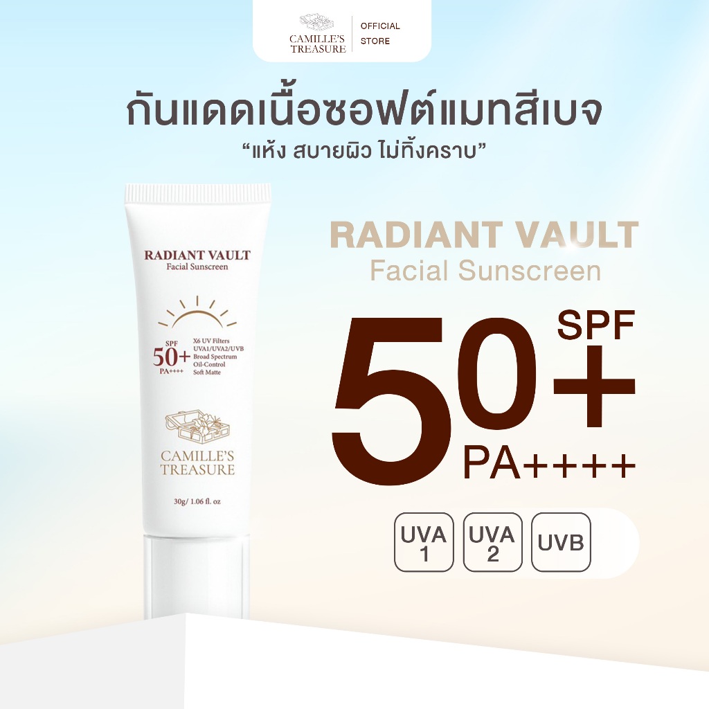 กันแดดหน้า SPF50+ PA++++ ไม่มัน ไม่วอก คุมมัน สำหรับผิวแพ้ง่าย | Camille's Treasure Radiant Vault Facial Sunscreen
