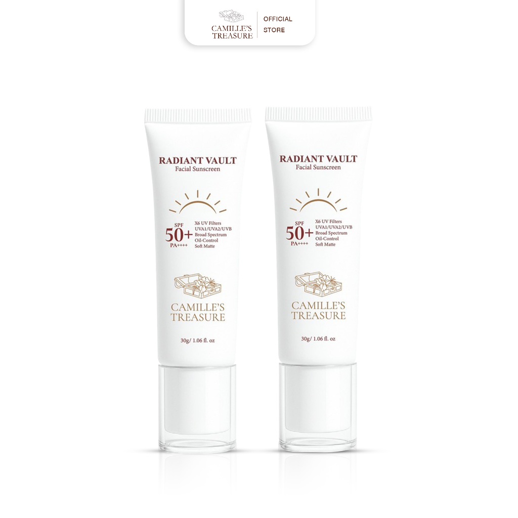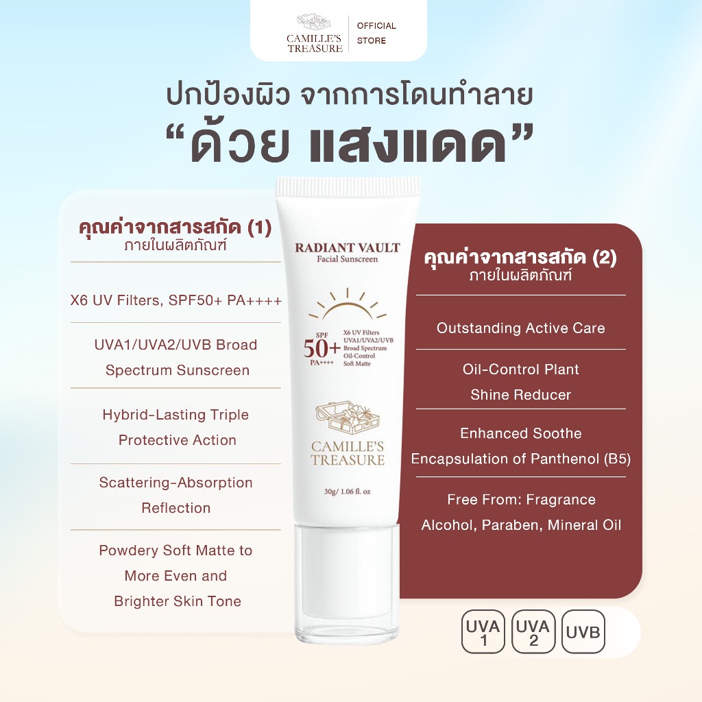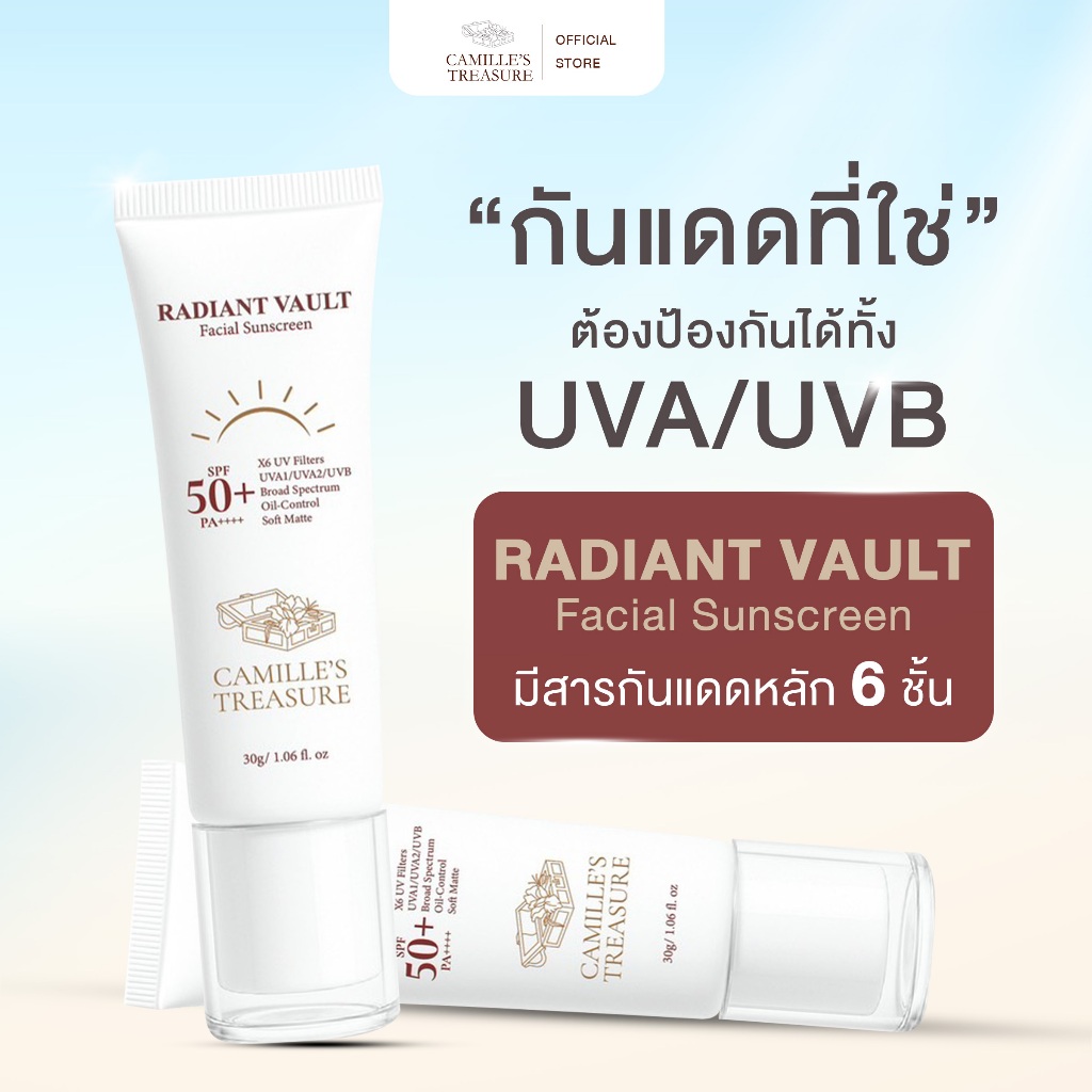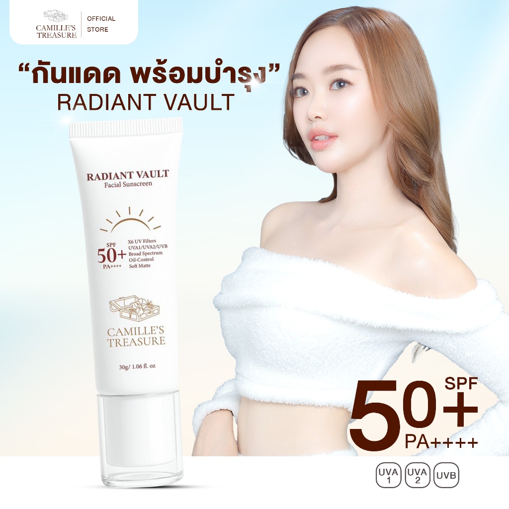 [โปรโมชั่น 2 ชิ้น!!] กันแดดหน้า SPF50+ PA++++ ไม่มัน ไม่วอก คุมมัน สำหรับผิวแพ้ง่าย | Camille's Treasure Radiant Vault