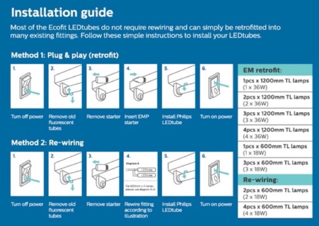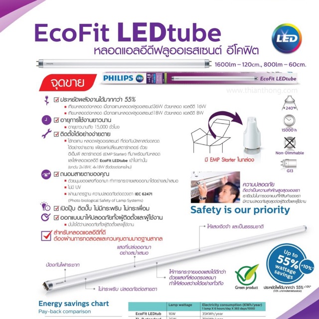 (ยาว120cm) Philips Ecofit 18W หลอดนีออน ฟิลิปส์ LEDtube Mycare T8 18วัตต์ แสง Daylight ไฟเข้าทางเดียว แถมฟรี EMP Starter