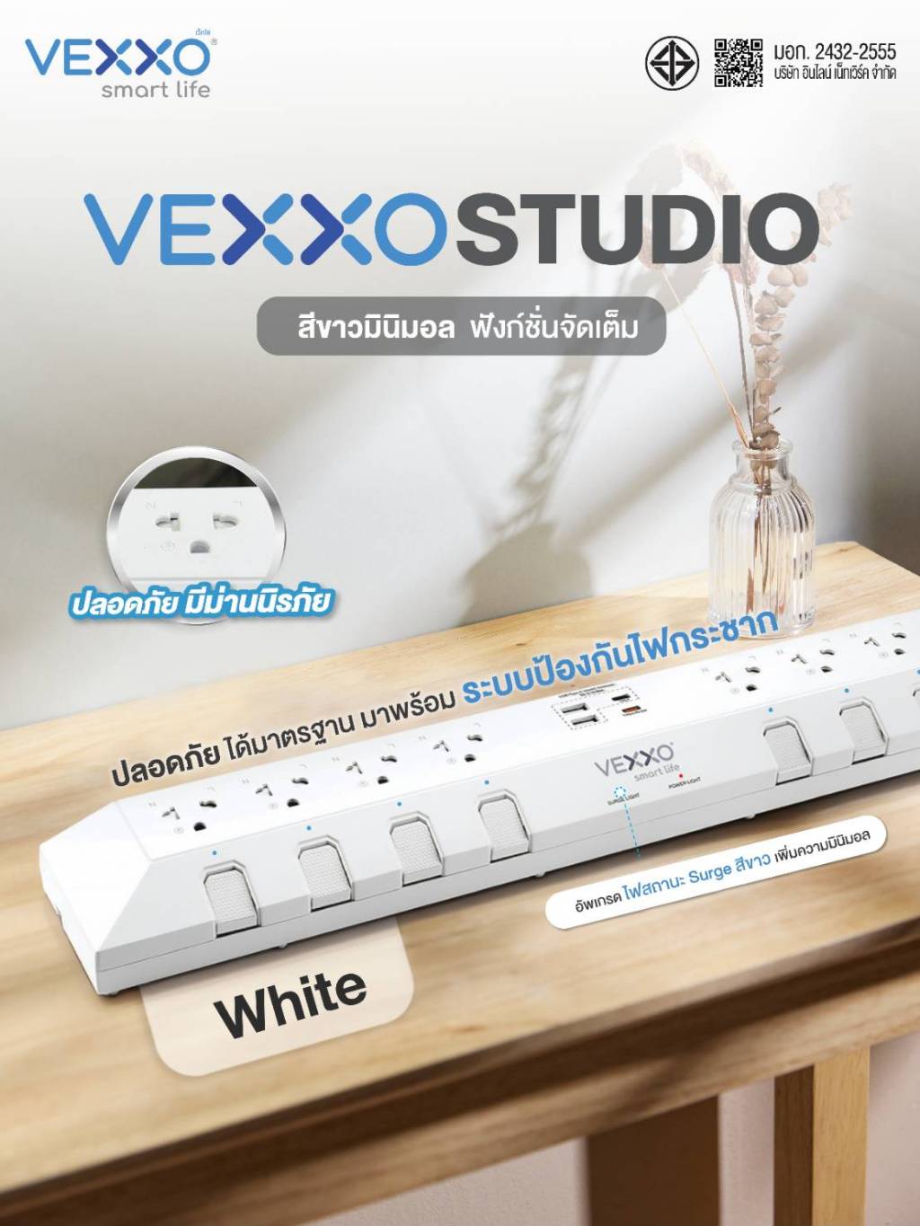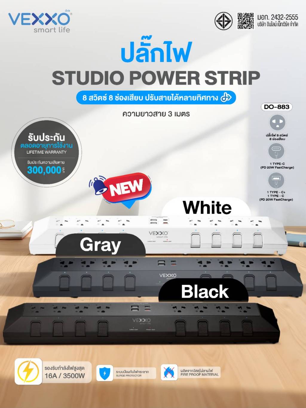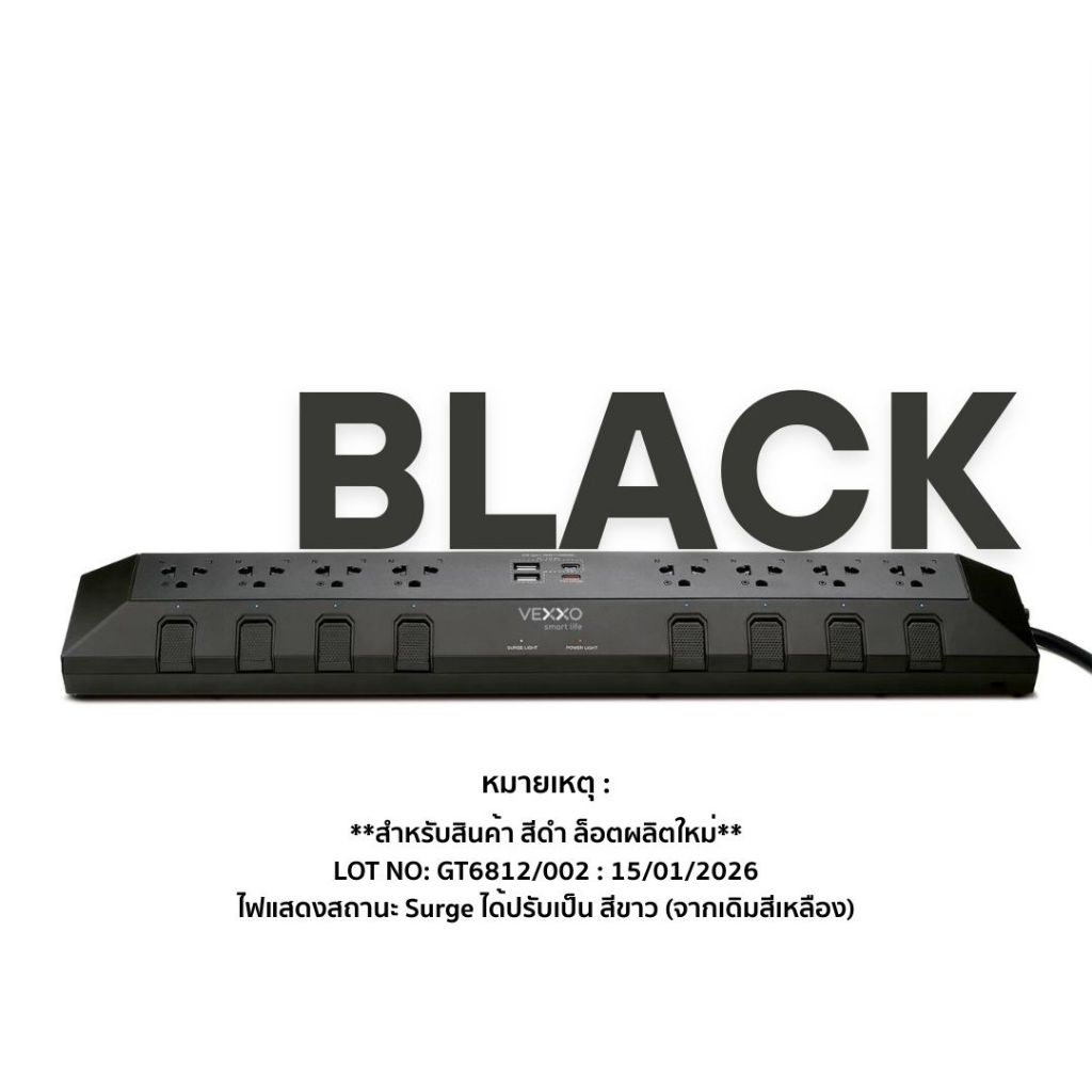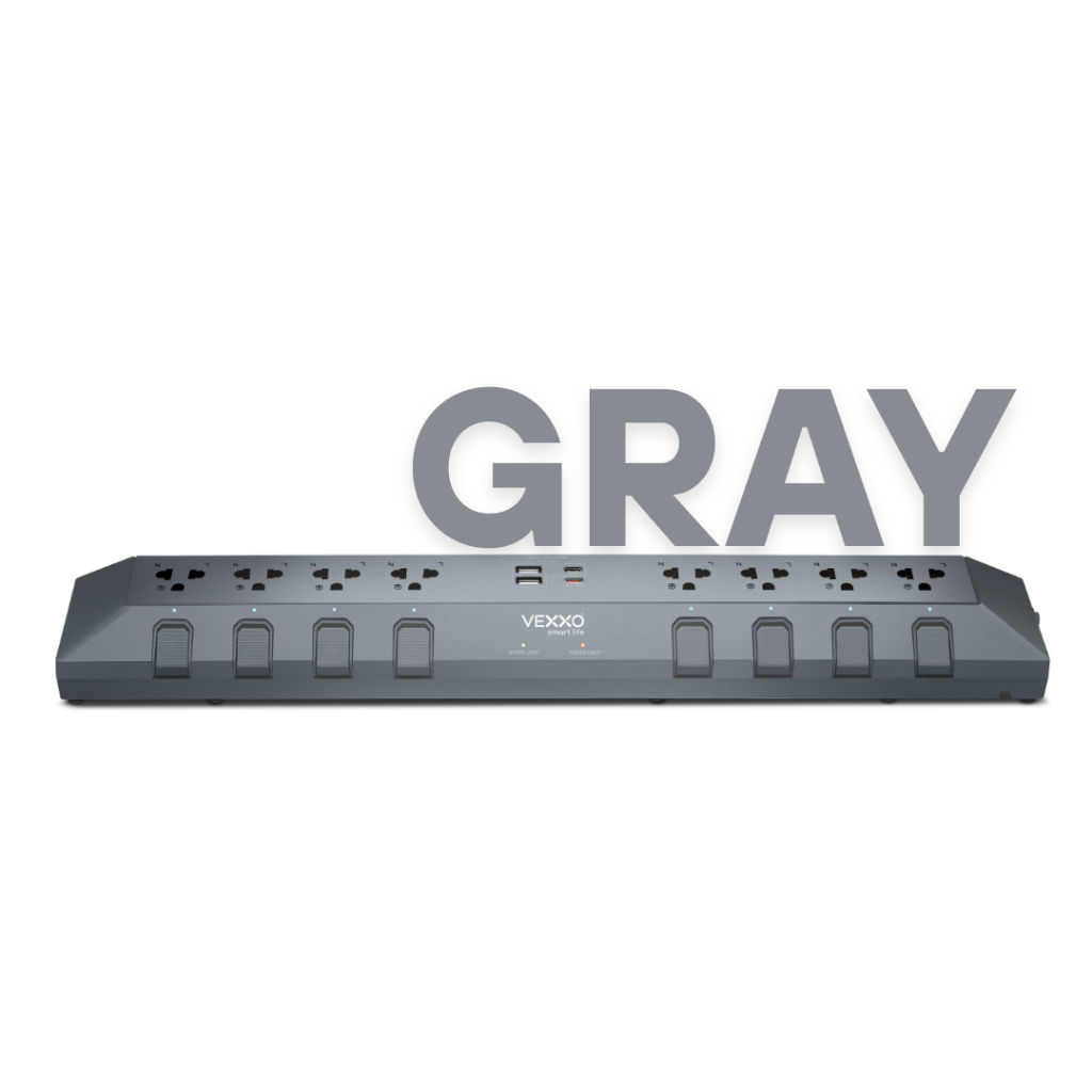 VEXXO StudioPowerStrip ปลั๊กไฟสตูดิโอ มีระบบกันไฟกระชาก ปลั๊กไฟมอก. 8ช่อง8สวิตซ์ (สีเทา/สีดำ/สีขาว)