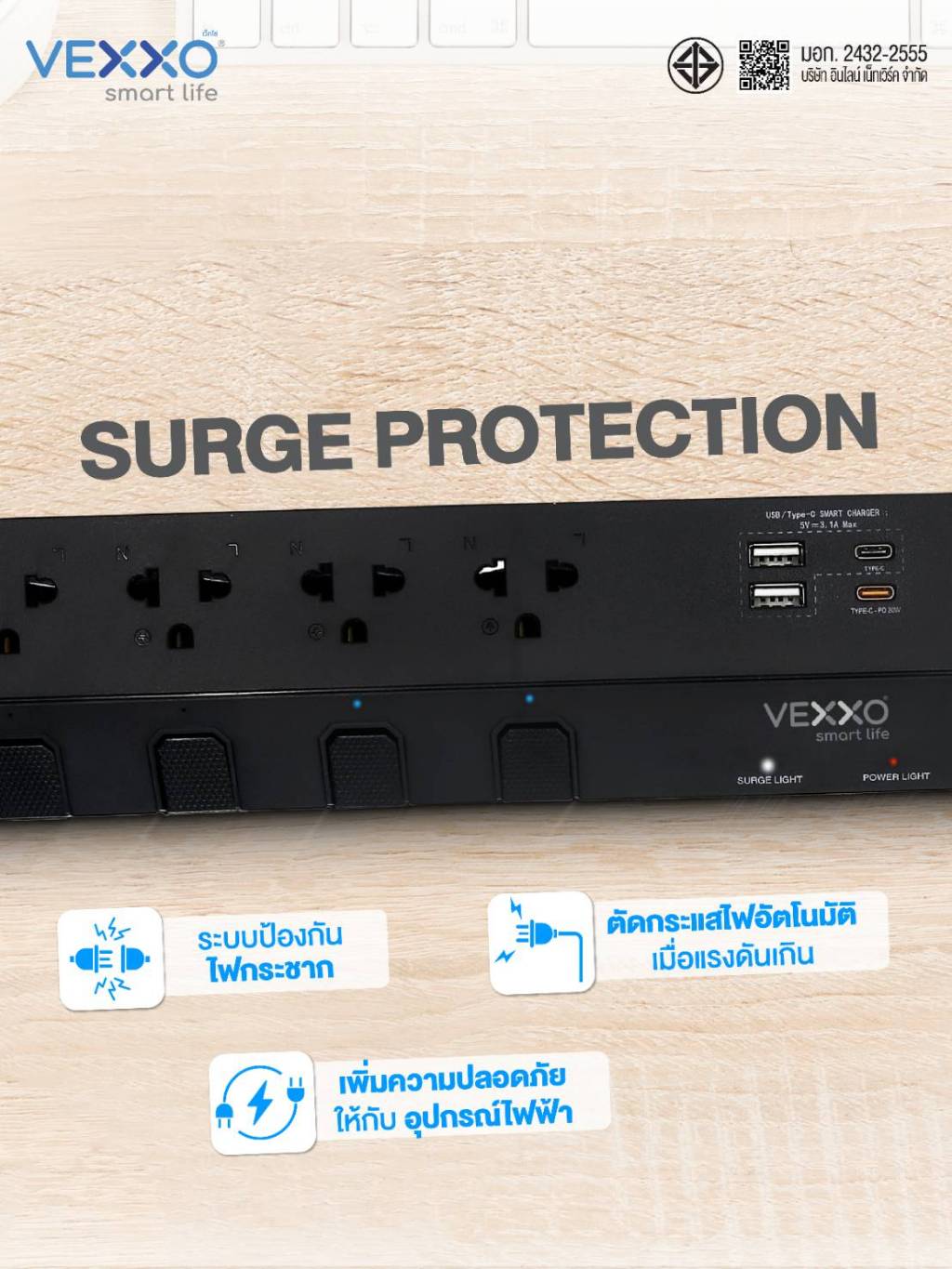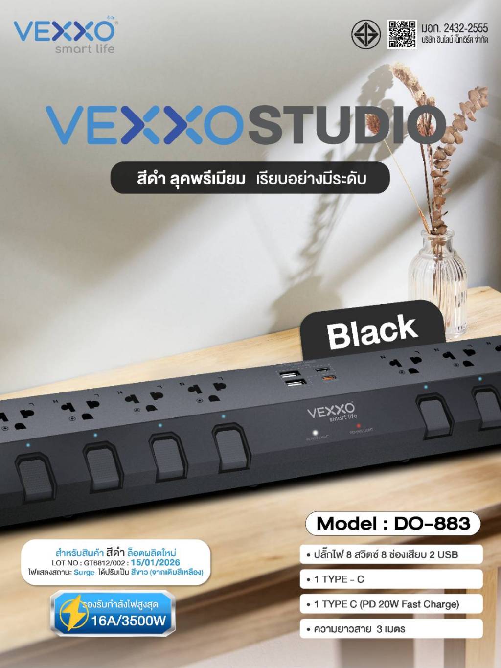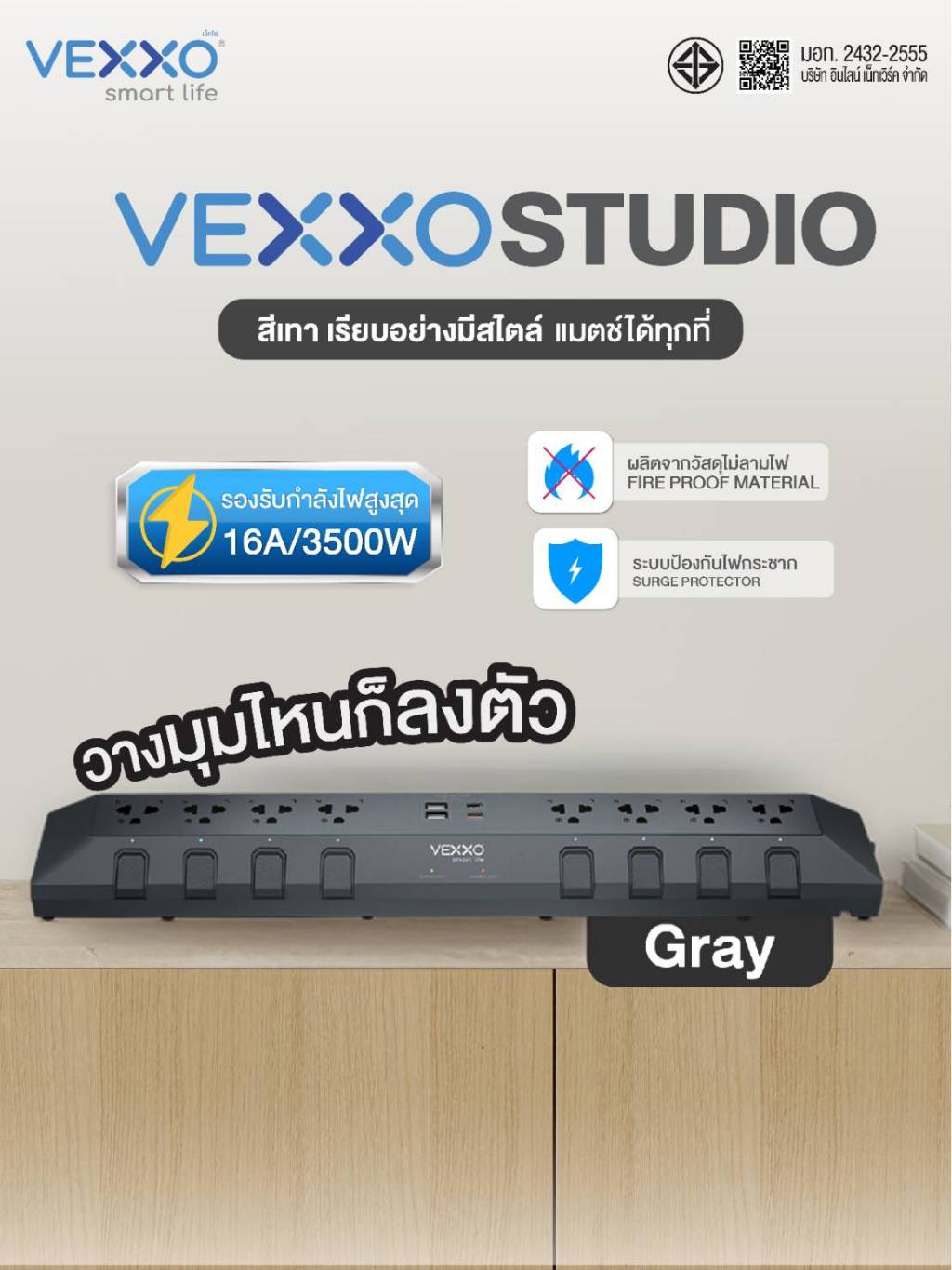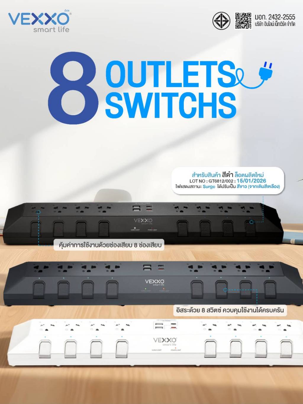 VEXXO StudioPowerStrip ปลั๊กไฟสตูดิโอ มีระบบกันไฟกระชาก ปลั๊กไฟมอก. 8ช่อง8สวิตซ์ (สีเทา/สีดำ/สีขาว)