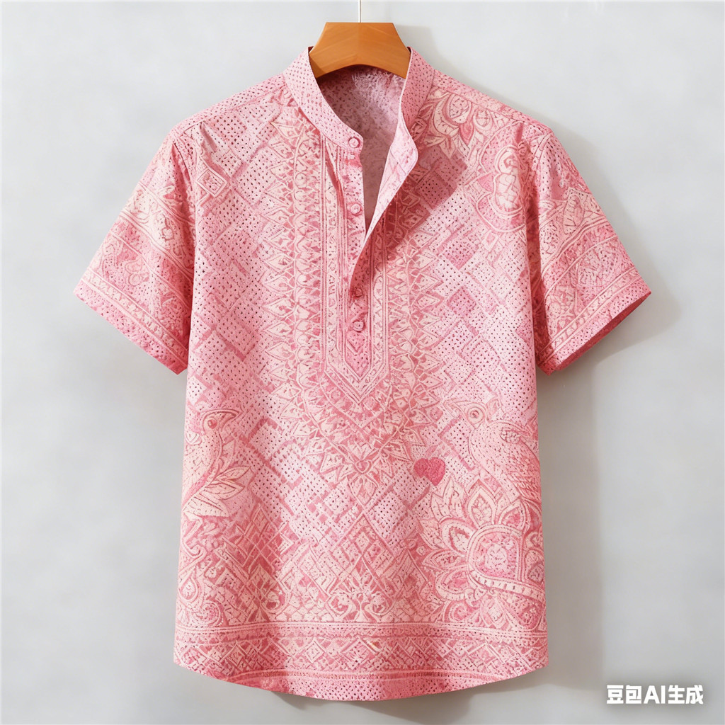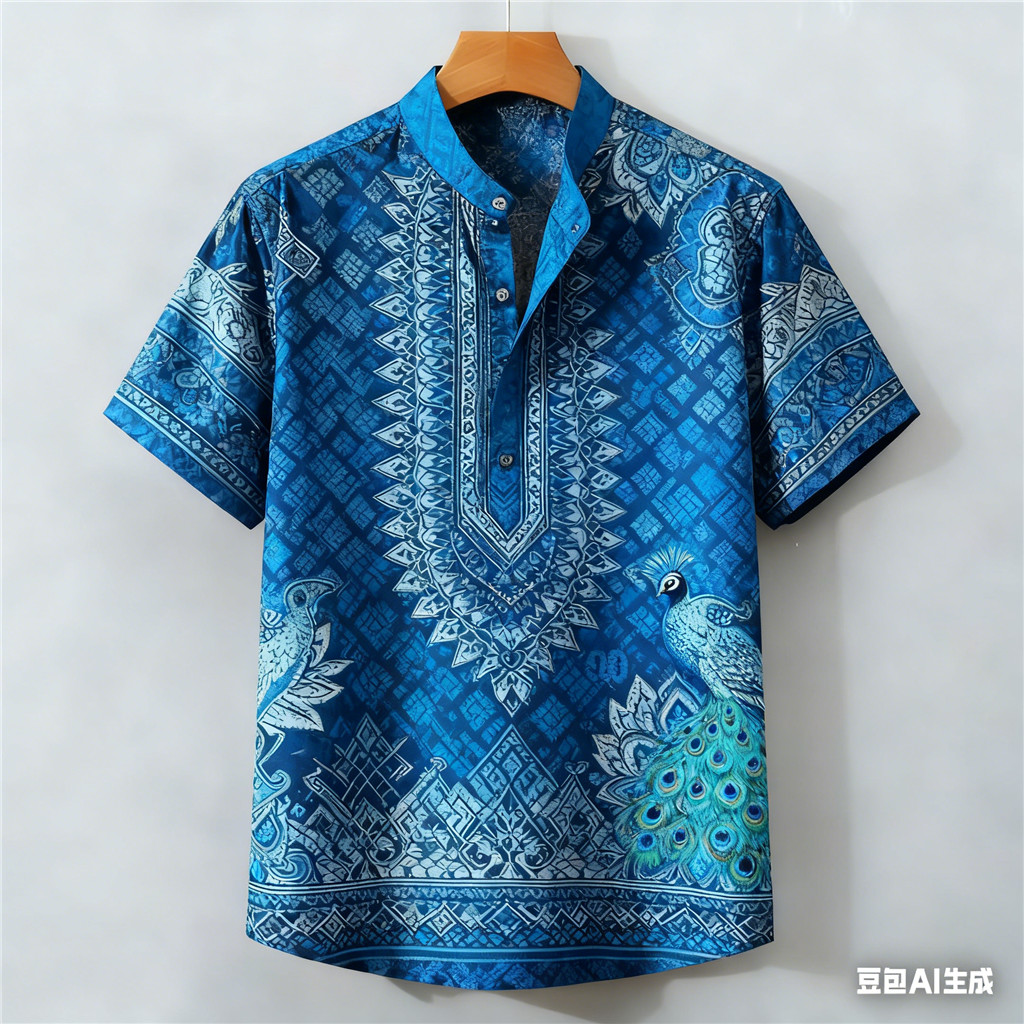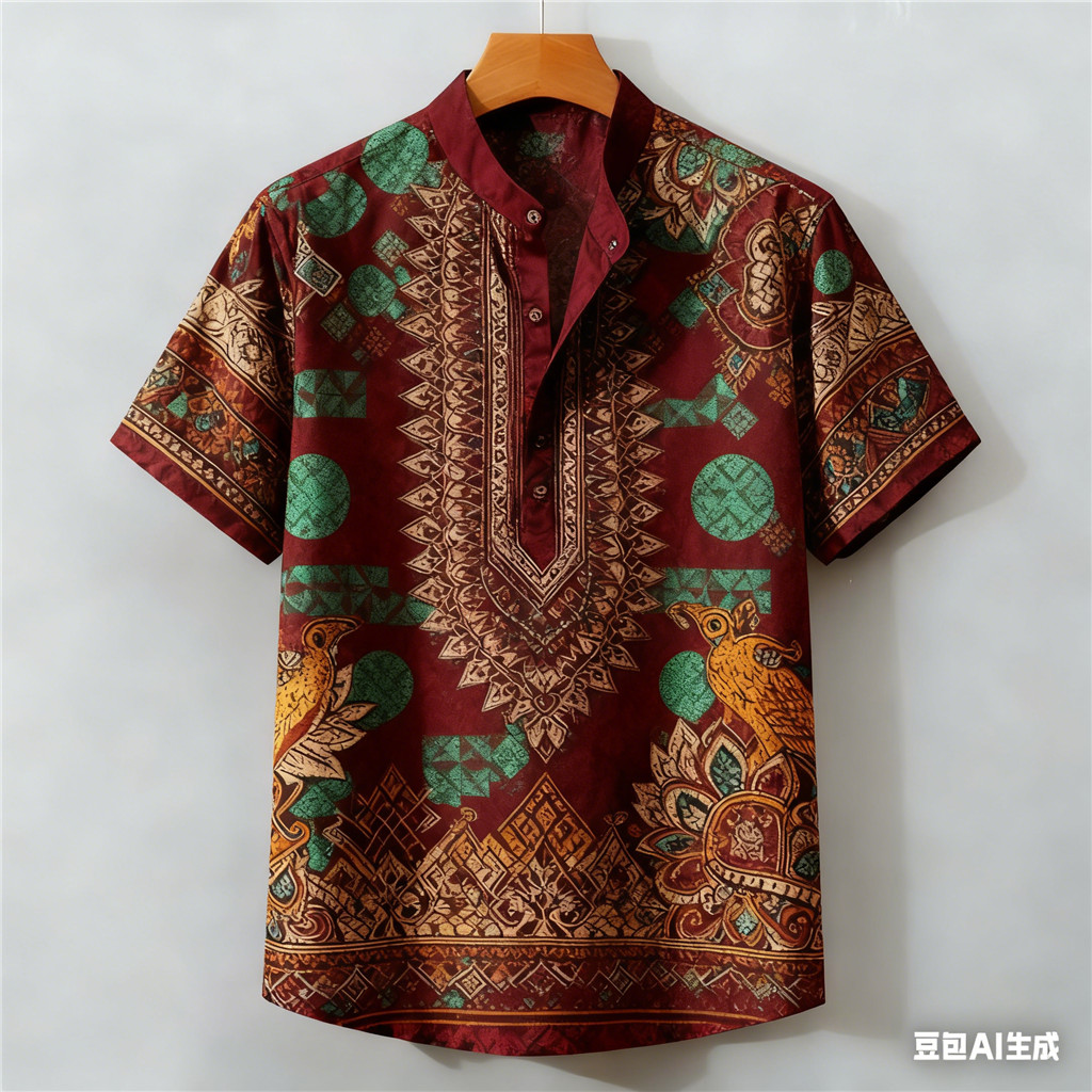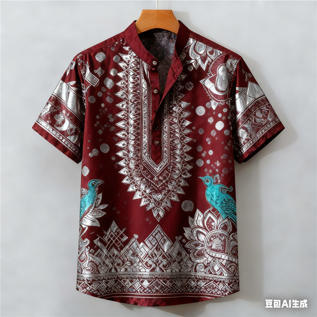 เสื้อเชิ้ตแขนสั้นพิมพ์ลายชาติพันธุ์สำหรับผู้ชาย ผสมผสานสไตล์โบฮีเมียนย้อนยุค กับภาพวาดนกและเรขาคณิต มีหลากหลายสีให้เลือก พร้อมคอนเซปต์ลำลองวินเทจในฤดูร้อน