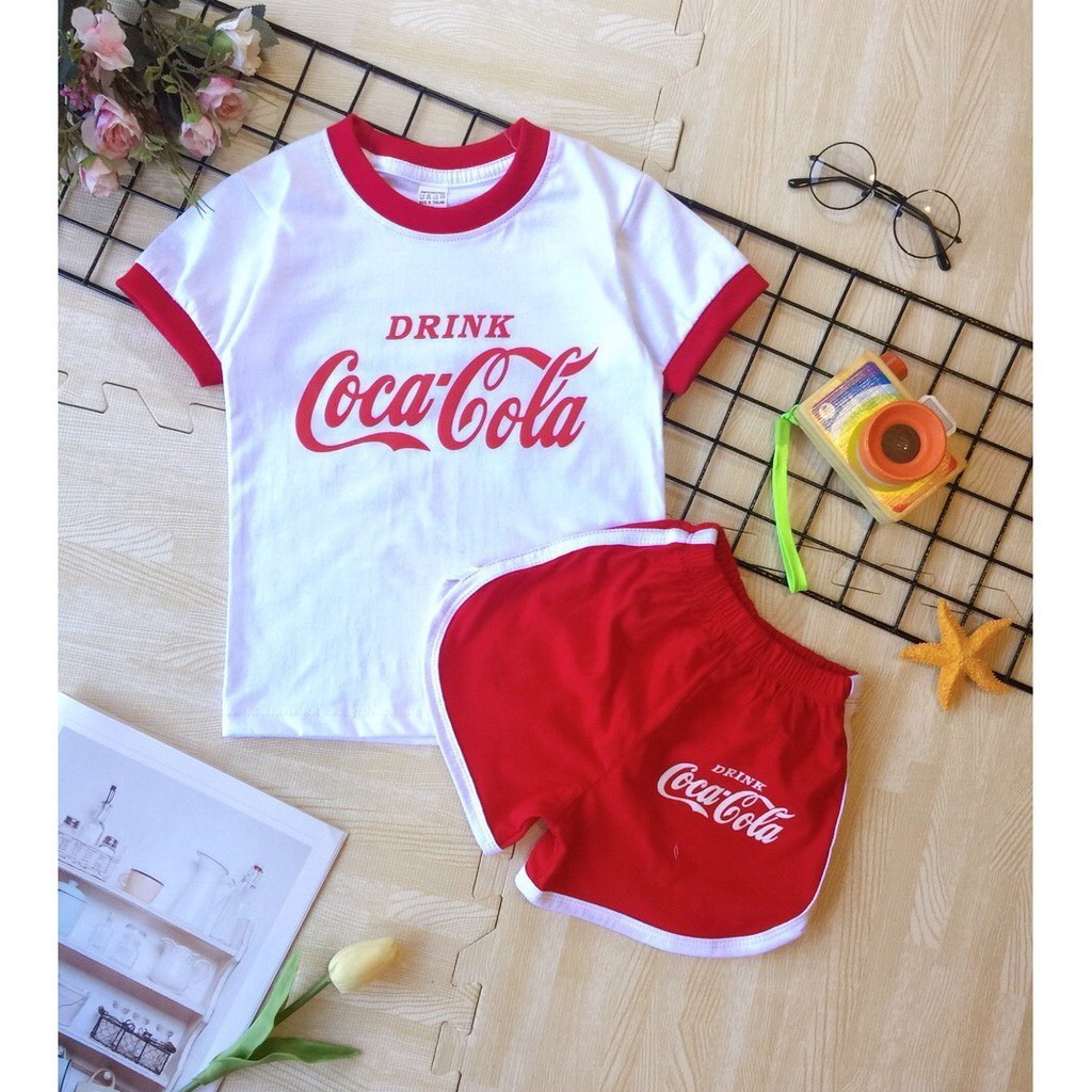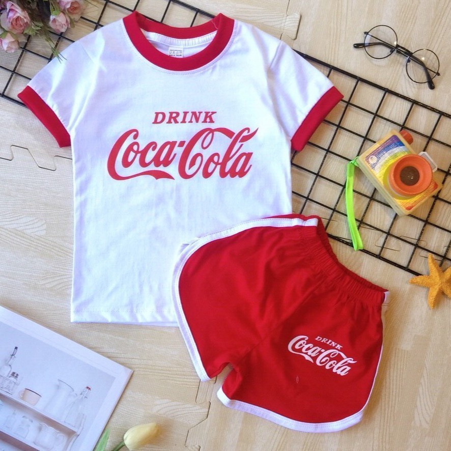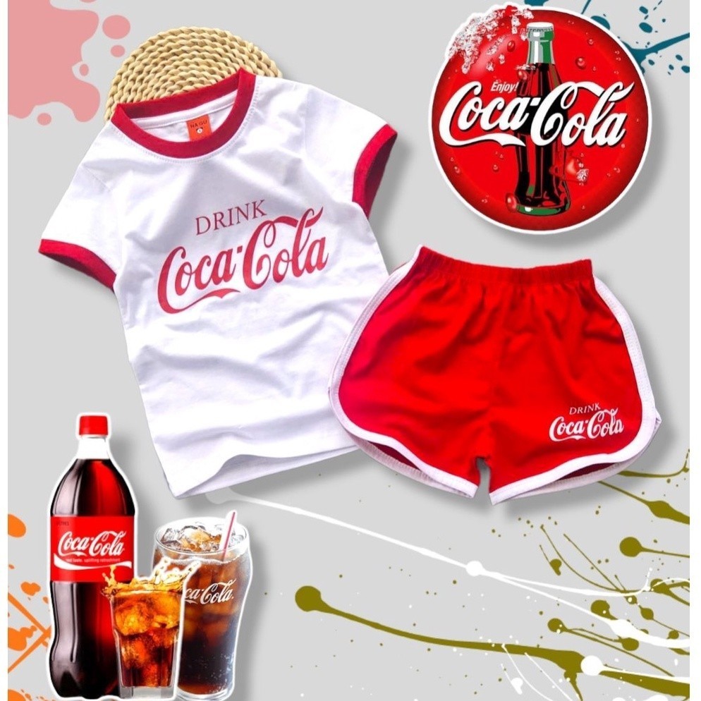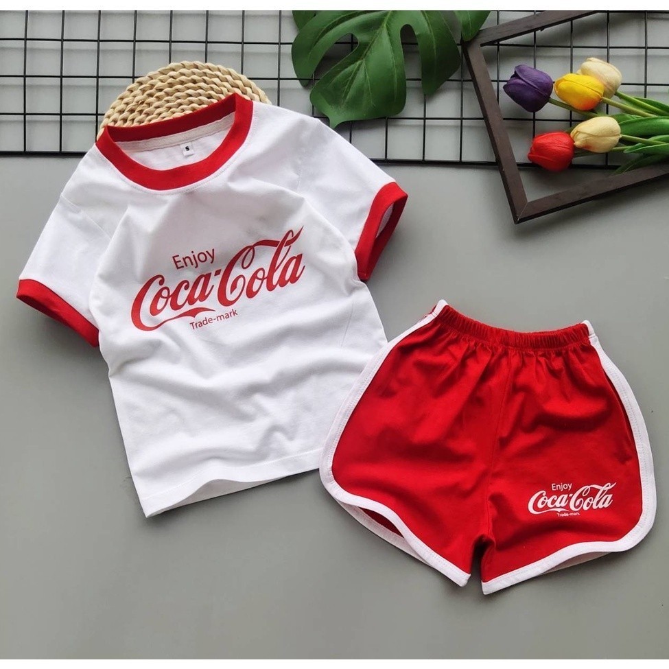B003 ชุดเซ็ตเด็ก ชุดนอนเด็ก งานสกรีน ลายโลโก้สินค้า โคคา โคล่า สีขาว แดง (เสื้อยืดแขนสั้น+กางเกงขาสั้น) แฟชั่น ชุดเด็ก