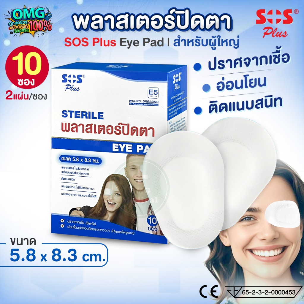 SOS Plus Sterile Eye Pad E5 พลาสเตอร์ปิดตา ขนาดใหญ่ สำหรับผู้ใหญ่ แผ่นปิดตา ปิดแผลรอบดวงตา [ยกกล่อง 10 ซอง]