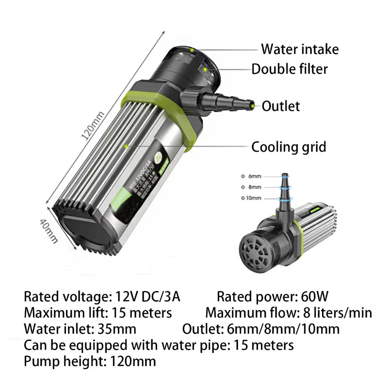 12V 60W 8L/min 15m DC Water Pump Water Circulation Submersible Water Pumps 3 Stage Water Inlets