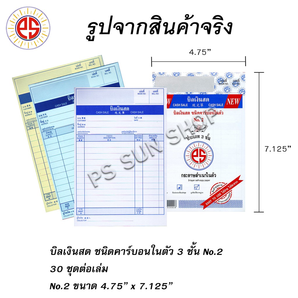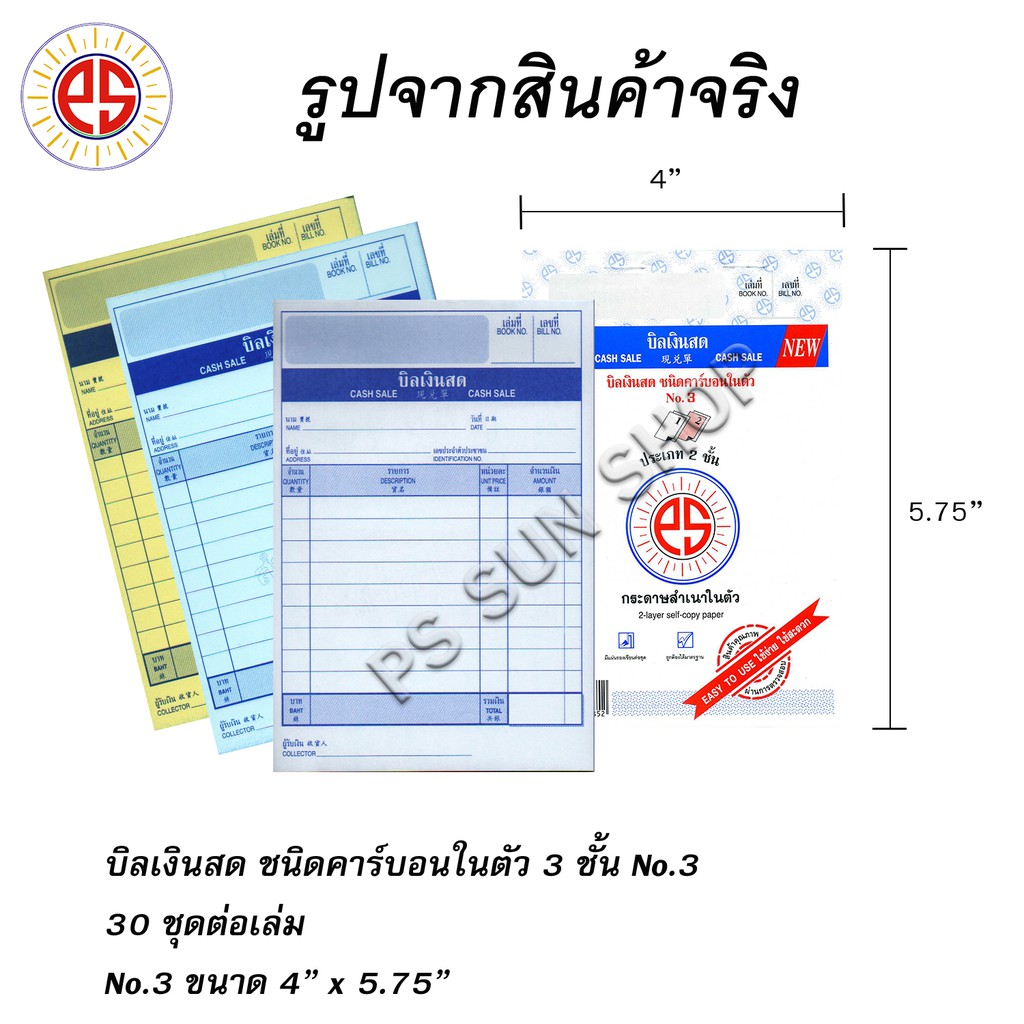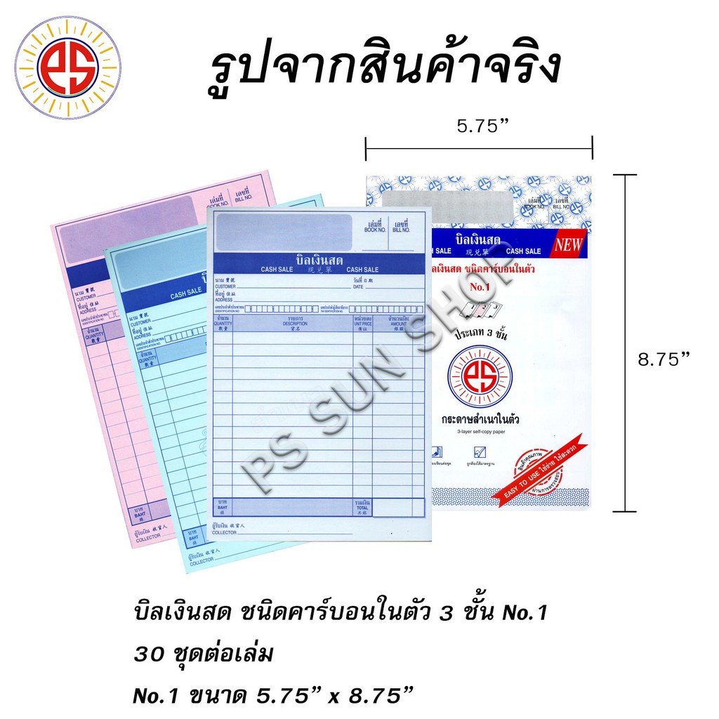 บิลเงินสด คาร์บอนในตัว 3 ชั้น No.1,2,3 PS SUN (1 เล่ม)
