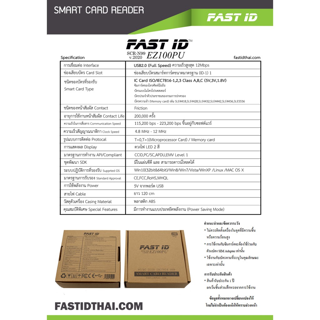 FAST ID เครื่องอ่านบัตรประชาชน/Smart Card Reader/SCR-N99 รุ่น EZ100PU ยอดนิยม ICT2567 แถมฟรีโปรแกรม