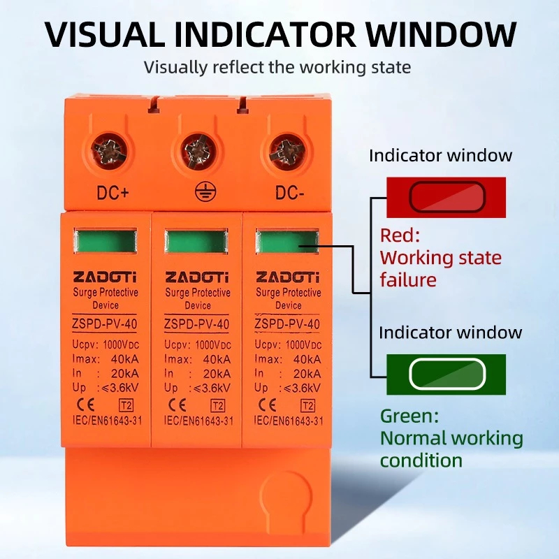 ตัวกันฟ้าผ่าโซล่าเซลล์ DC SPD 2P 1500V/1000V 40KA อุปกรณ์ป้องกันไฟกระชากสำหรับระบบโซลาร์เซลล์