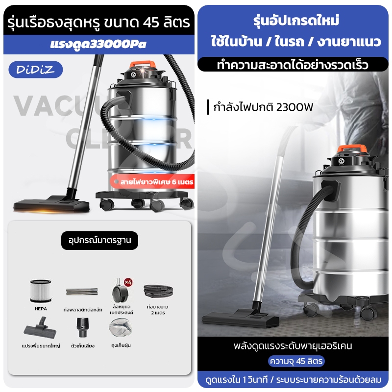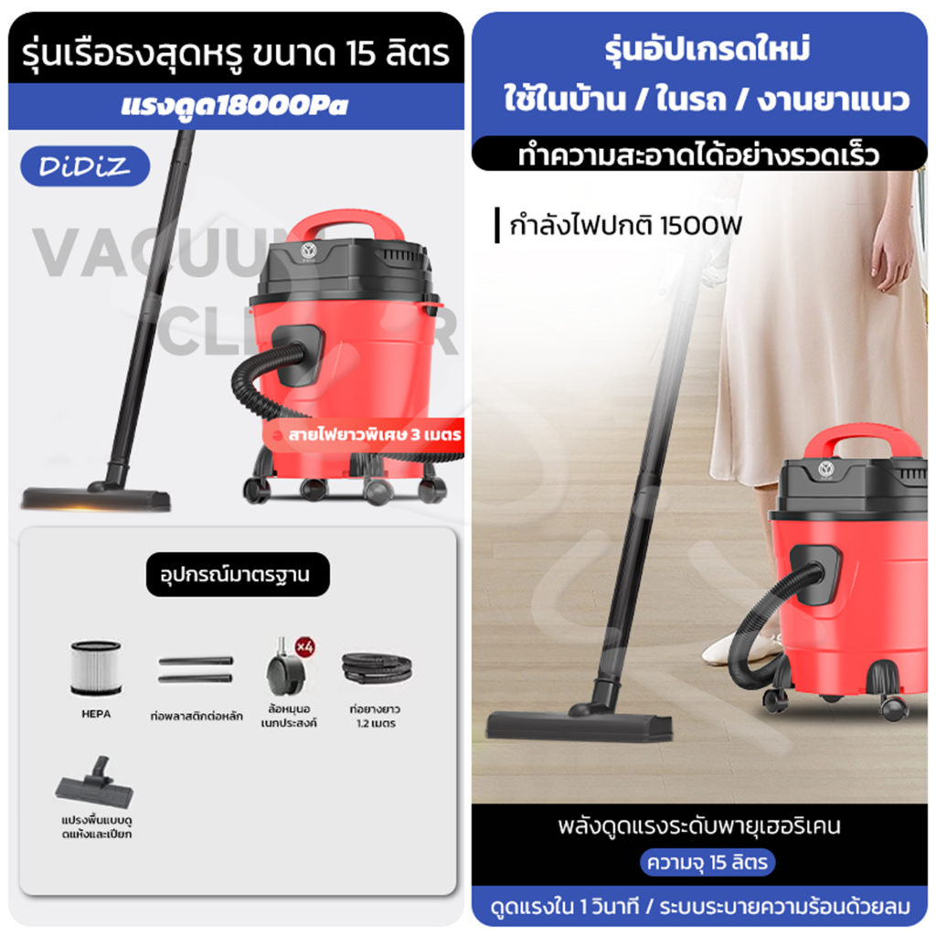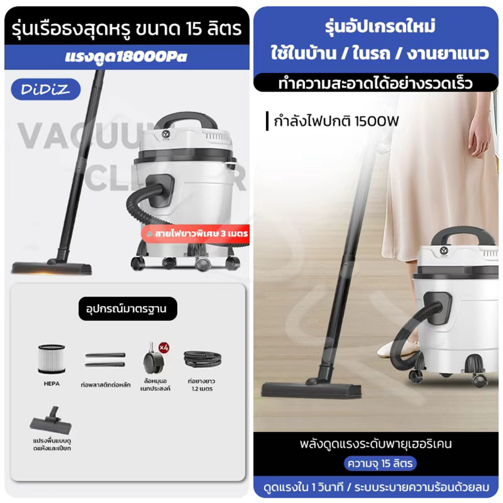 DiDiZ เครื่องดูดฝุ่นดูดเปียกแห้ง 15L 1500W แรงดูด18kPa ถังสแตนเลส 3-in-1 ใช้ในบ้านและงานช่าง