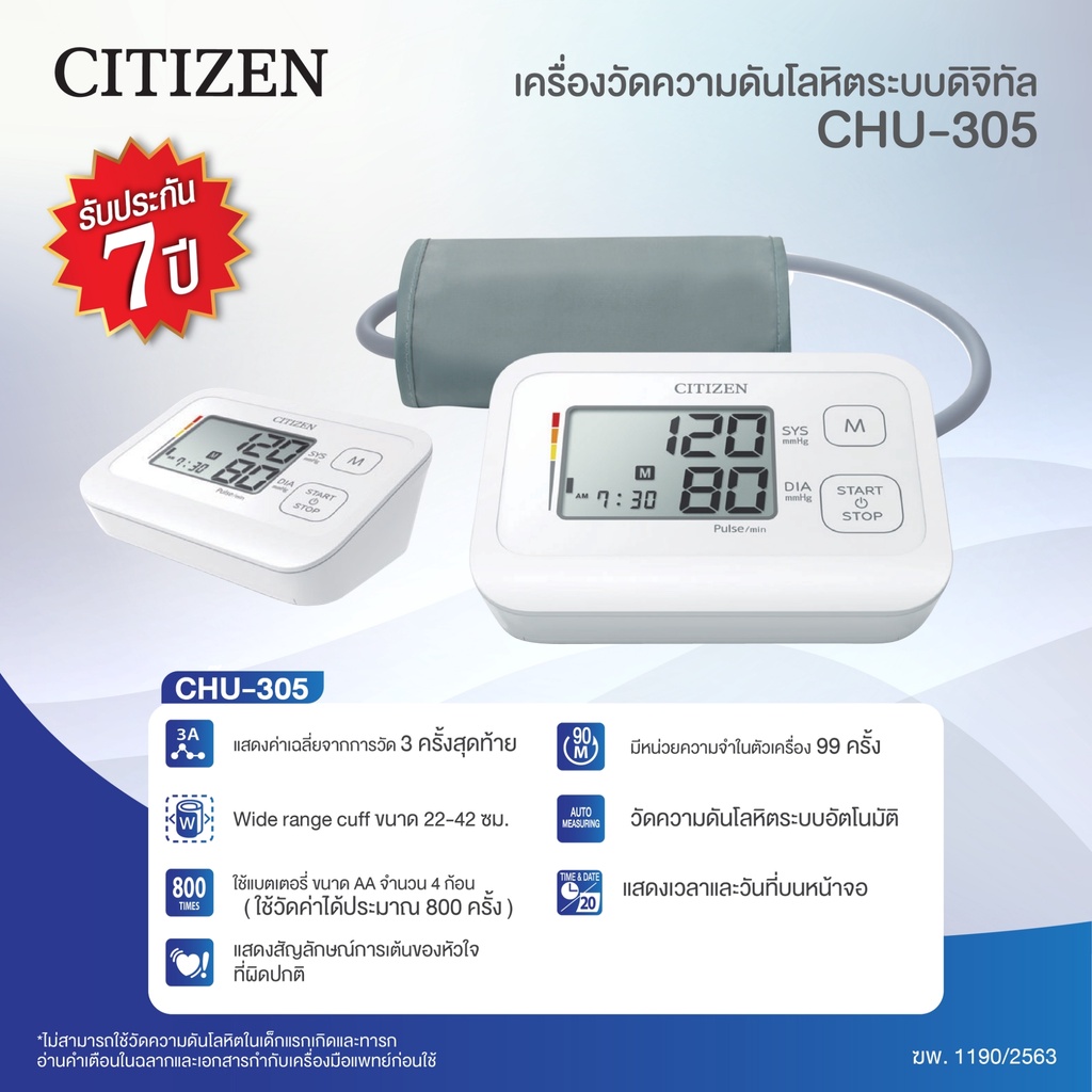 เครื่องวัดความดันโลหิต CITIZEN รุ่น CHU-305 วัดแม่นยำ มาตราฐานญี่ปุ่น (รับประกันสินค้า 7 ปี)