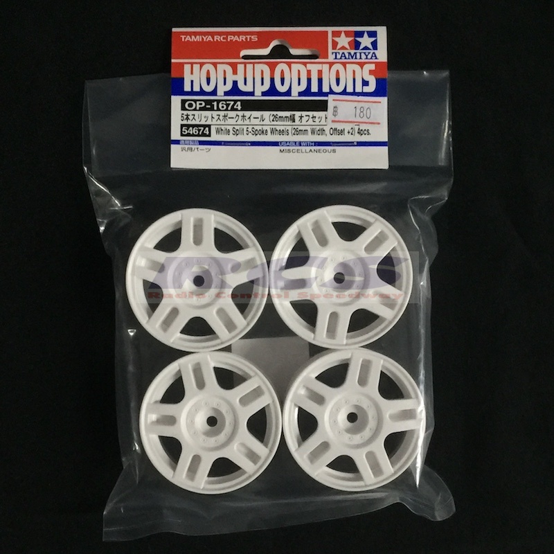 TAMIYA 54674 WHITE SPLIT 5-SPOKE WHEELS (26mm WIDTH, OFFSET +2) 4PCS.