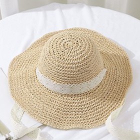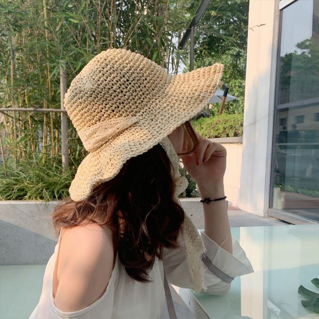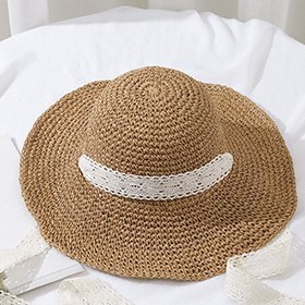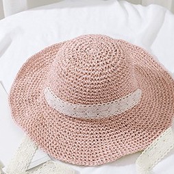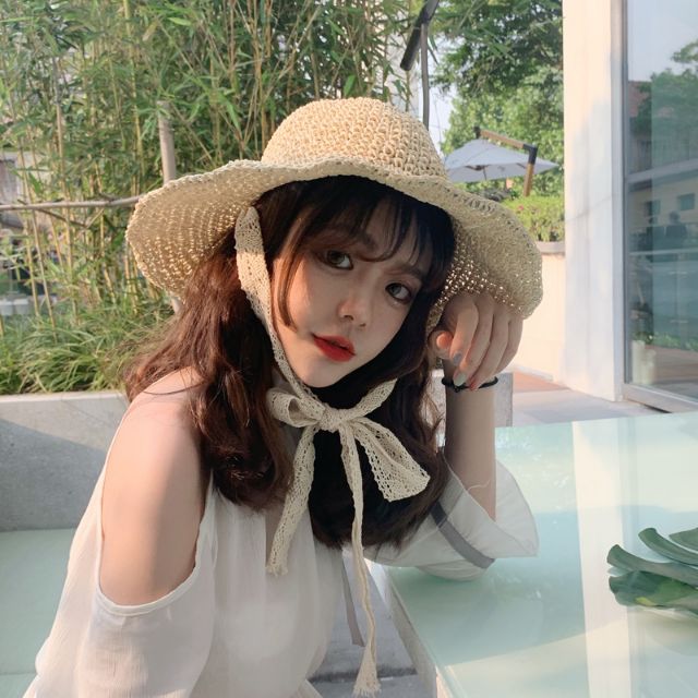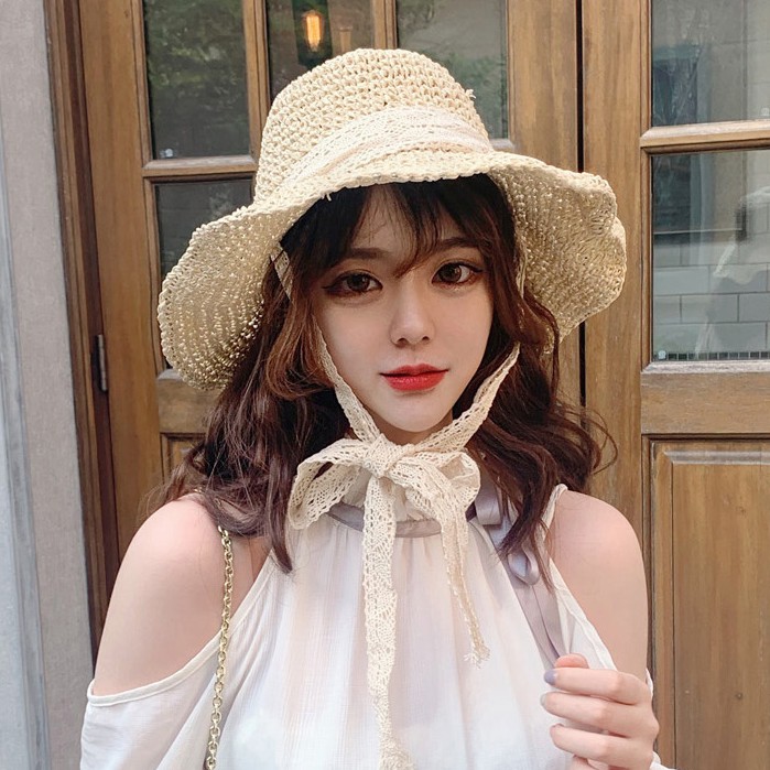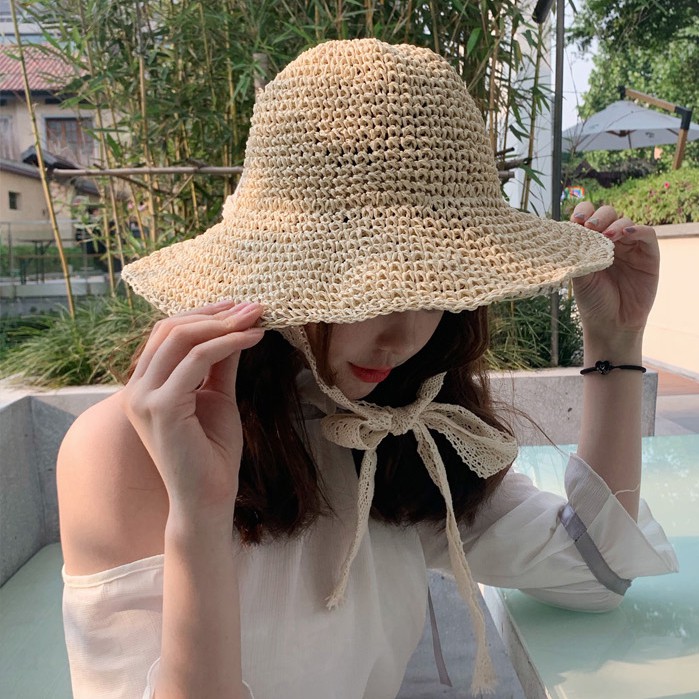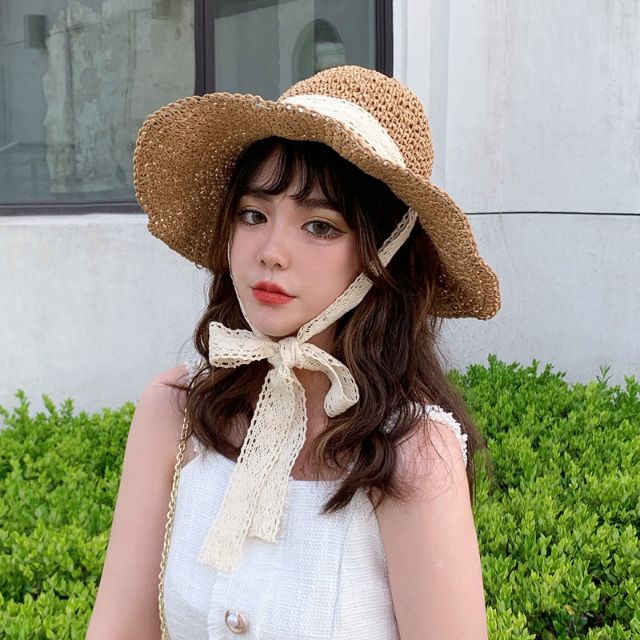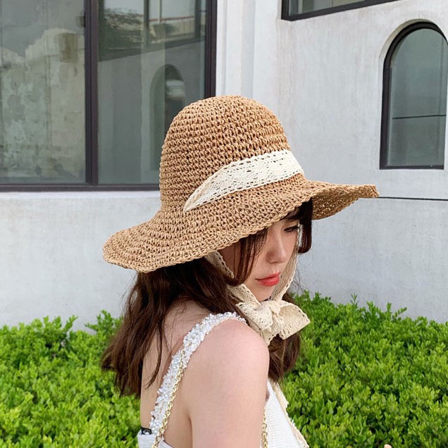 หมวกสาน บัคเก็ต แฮนด์เมด สไตล์วินเทจ ผลิตจากวัสดุธรรมชาติ แบบมีสายริบบิ้นลูกไม้ SH001