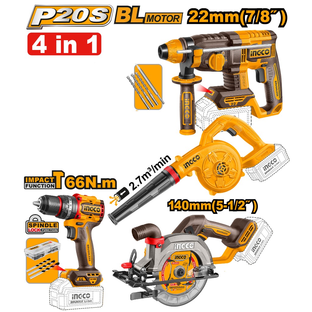 INGCO Combo set ชุดเครื่องมือไร้สาย 4 in 1 20V BL Motor รุ่น COSLI250695