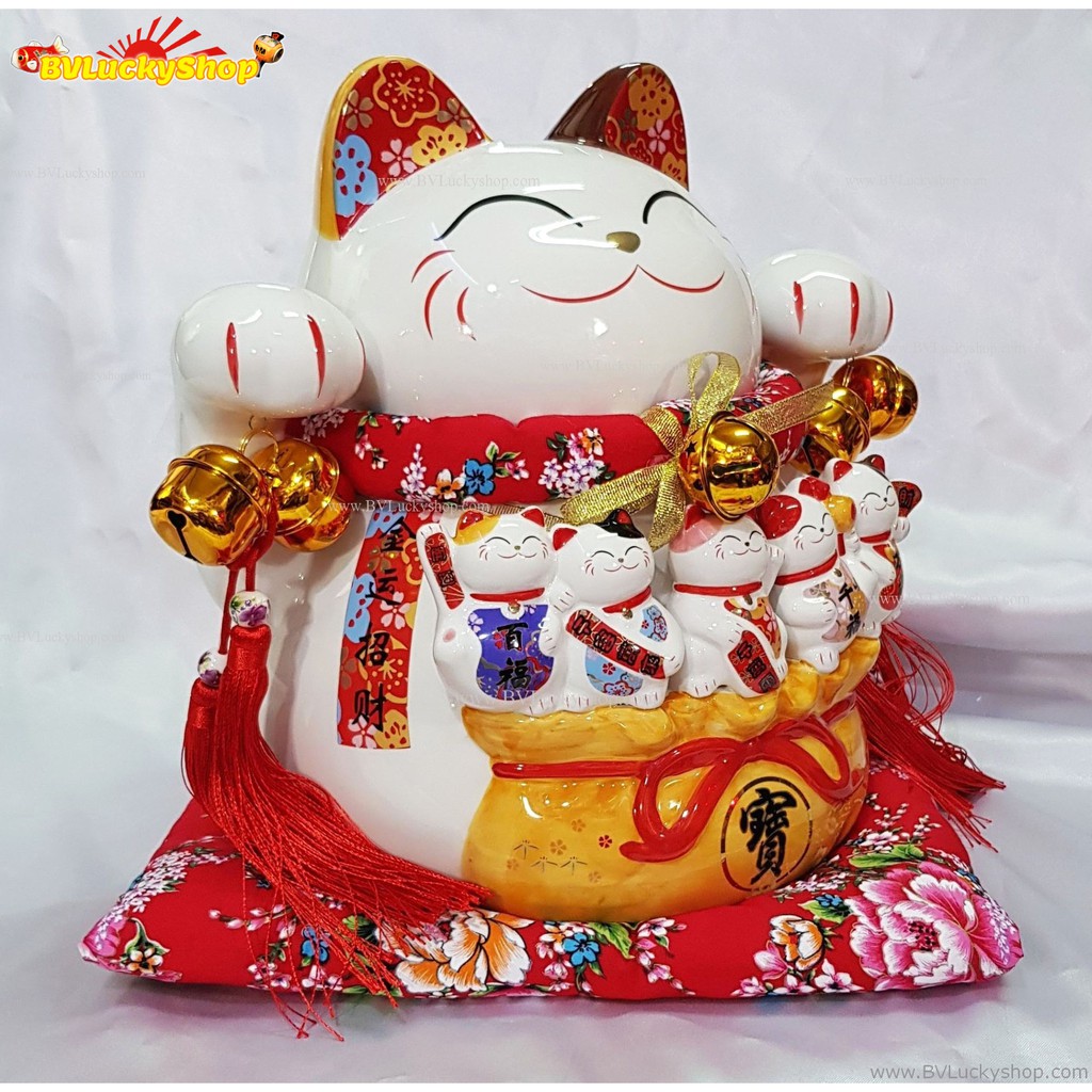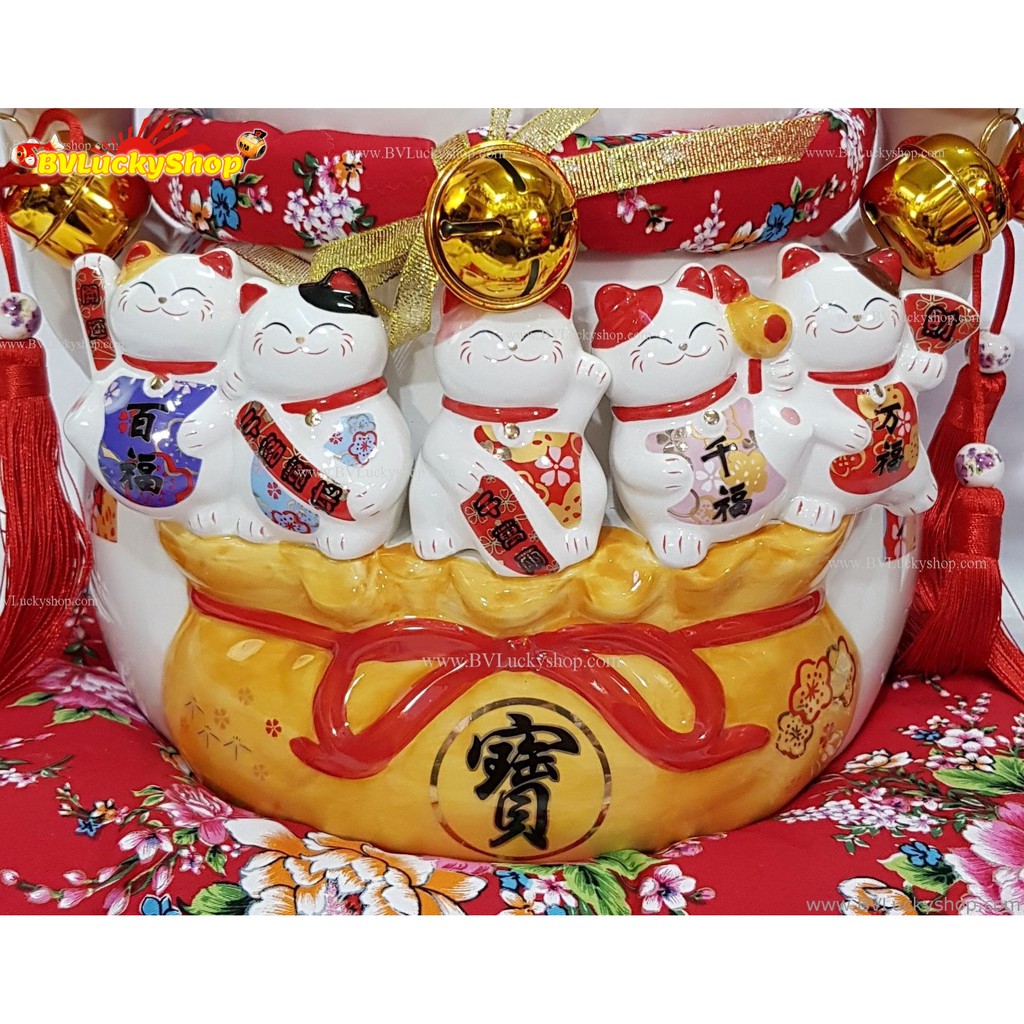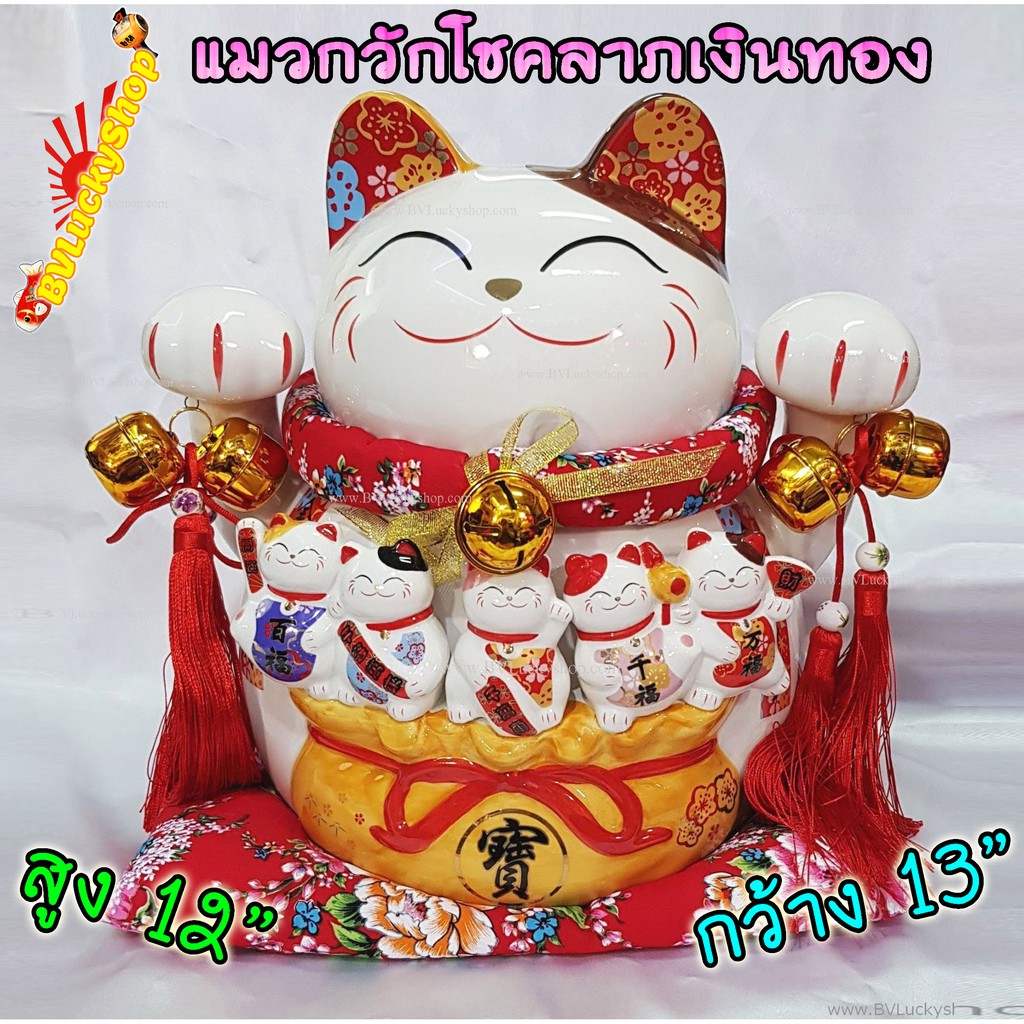 แมวกวัก แมวนำโชค ไซส์ใหญ่ สูง 12 นิ้ว และลูกๆแมวบนถุงสมบัติเงินทอง -เซรามิค [14-12bag]
