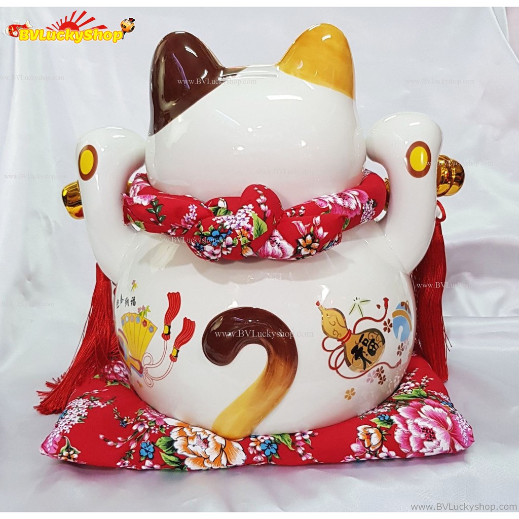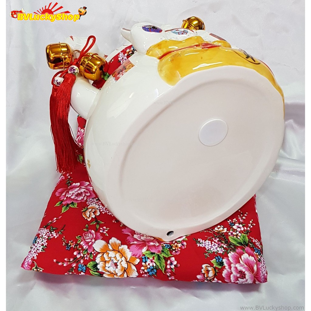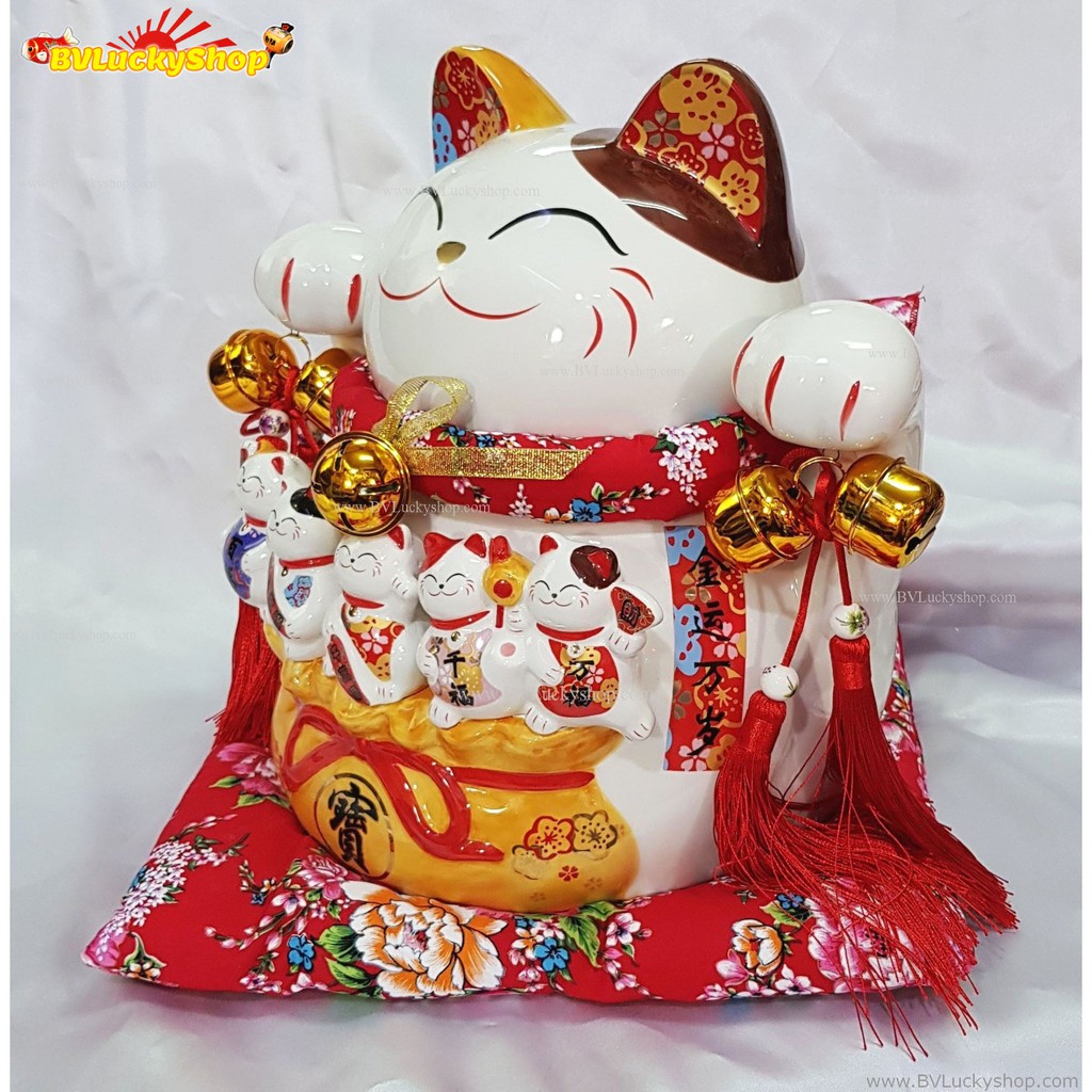 แมวกวัก แมวนำโชค ไซส์ใหญ่ สูง 12 นิ้ว และลูกๆแมวบนถุงสมบัติเงินทอง -เซรามิค [14-12bag]