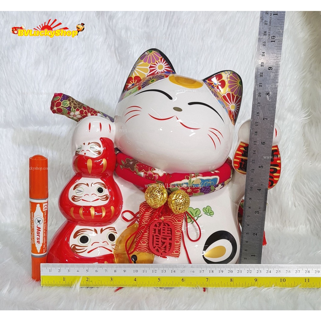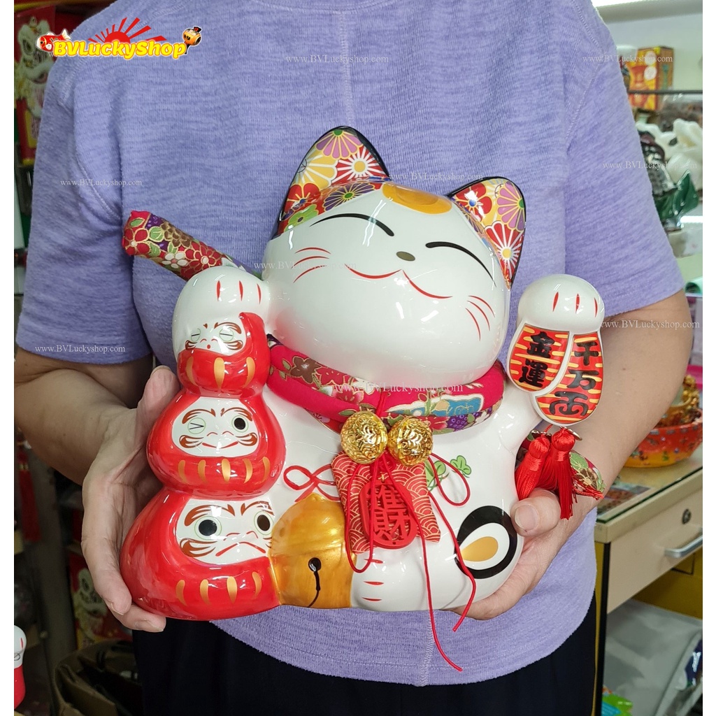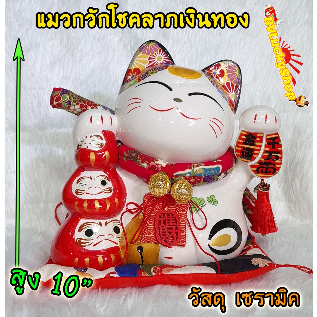 แมวกวัก แมวนำโชค แมวสไตล์ญี่ปุ่น สูง 10 นิ้ว ถือเหรียญทองและดารุมะ กวักเงินกวักทอง- เซรามิค [LM0908]