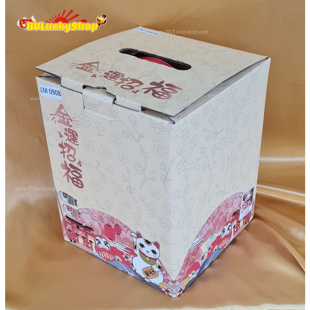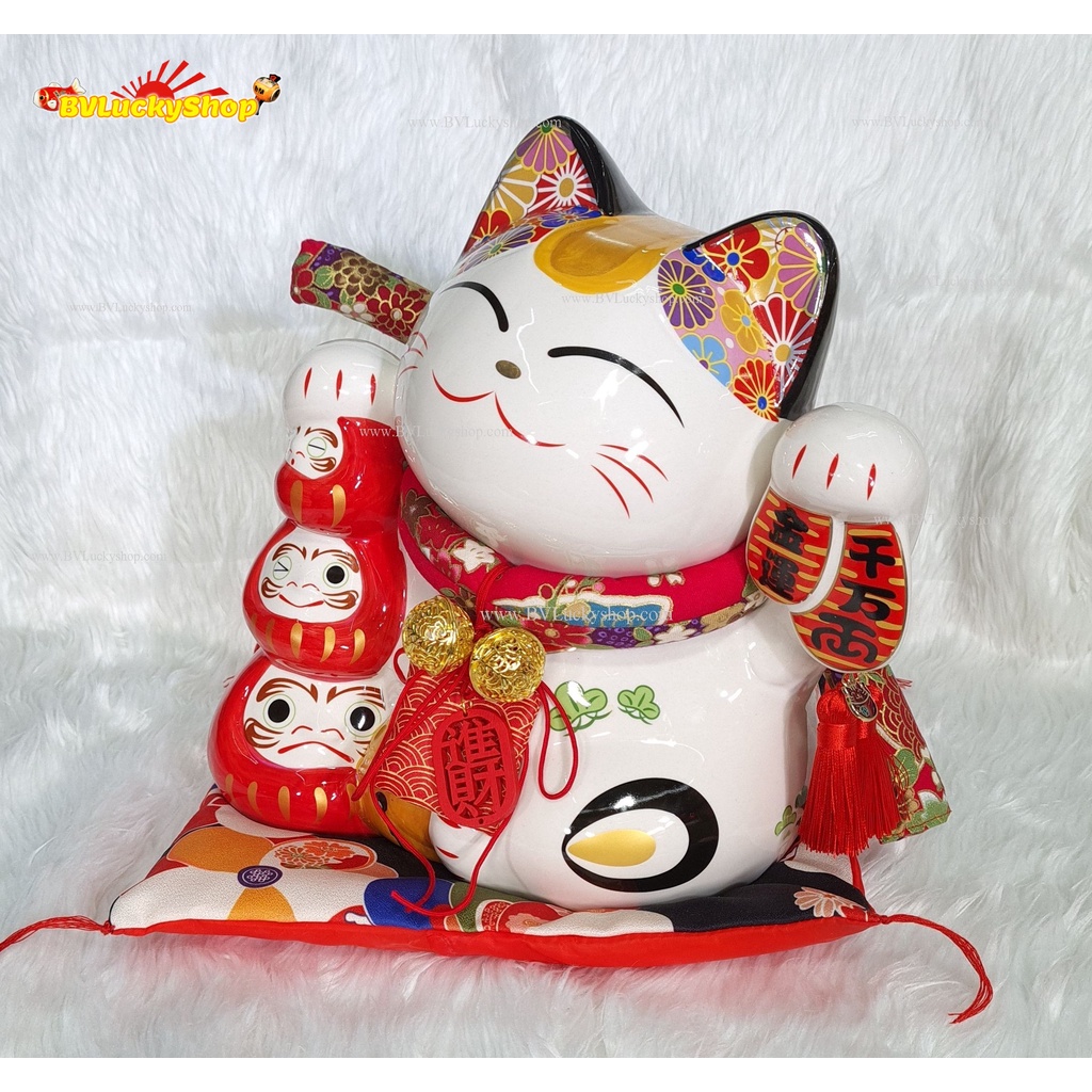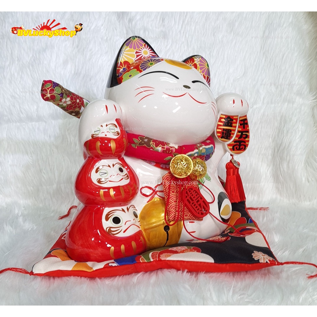 แมวกวัก แมวนำโชค แมวสไตล์ญี่ปุ่น สูง 10 นิ้ว ถือเหรียญทองและดารุมะ กวักเงินกวักทอง- เซรามิค [LM0908]