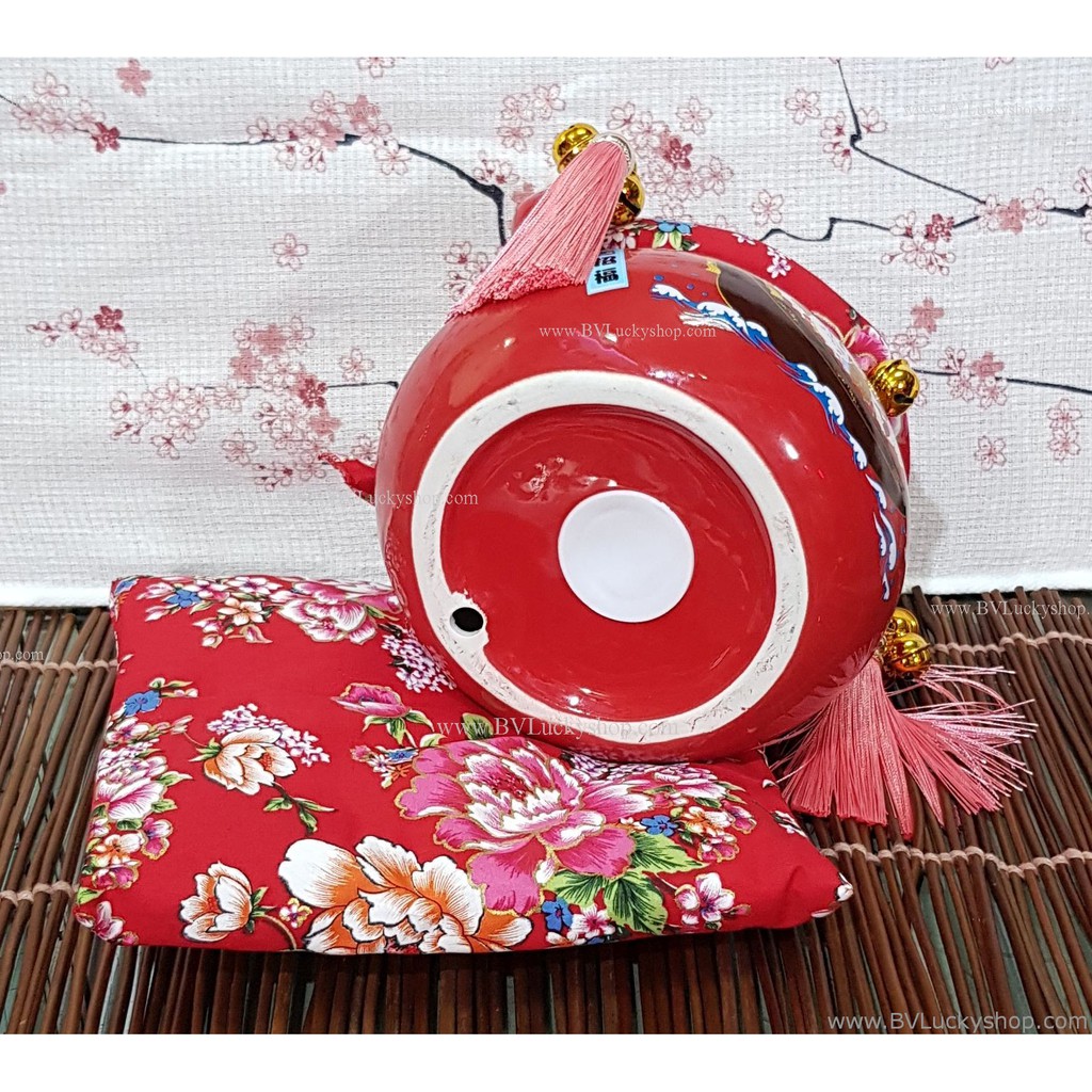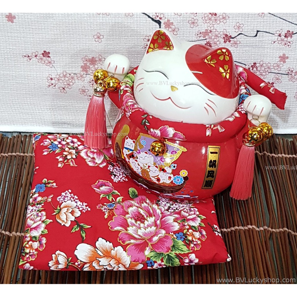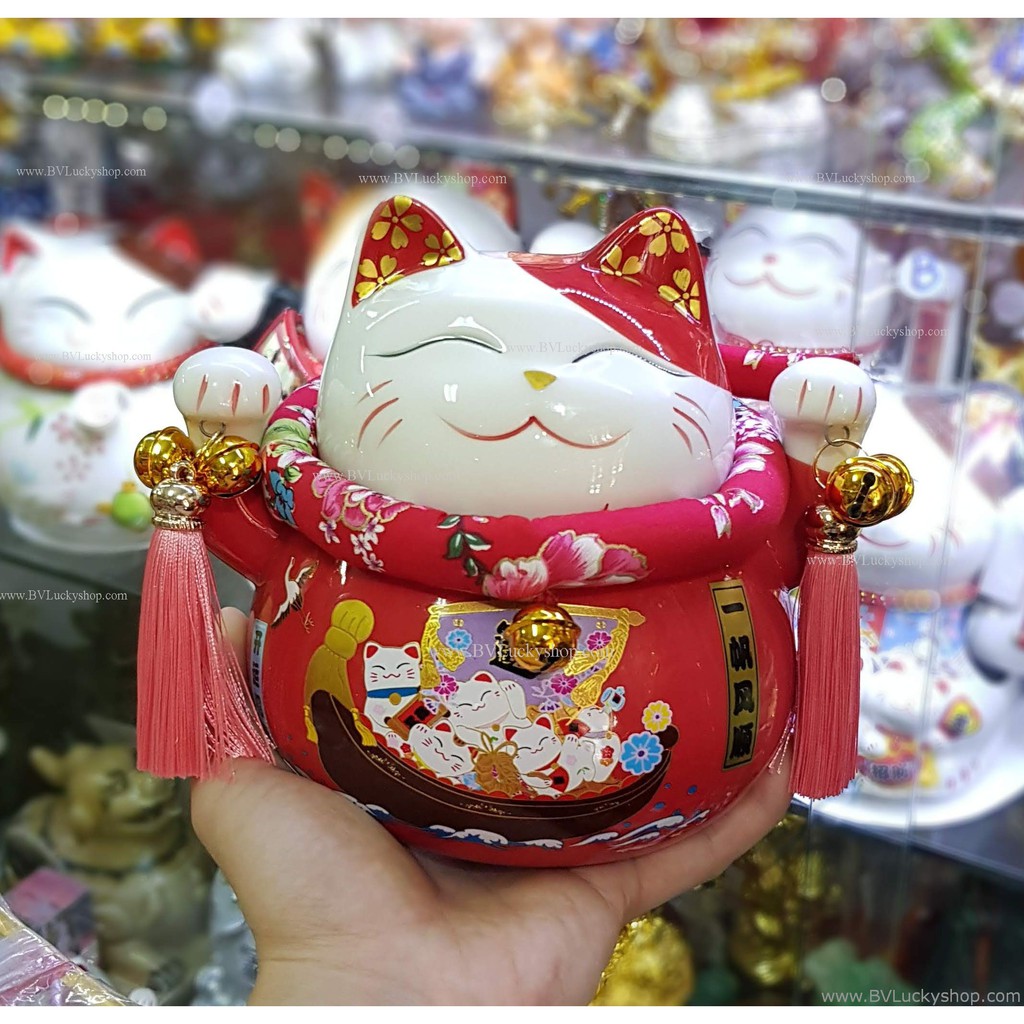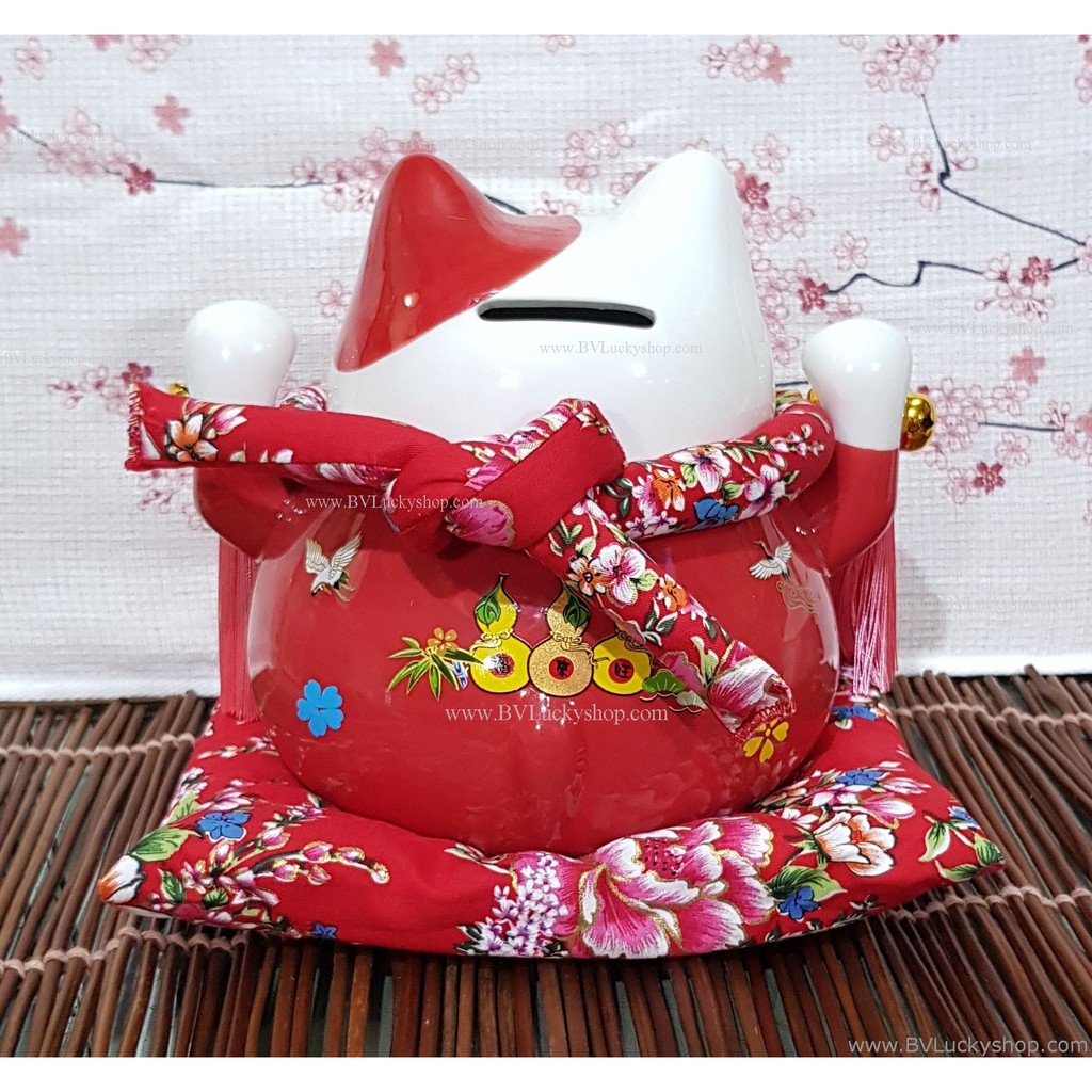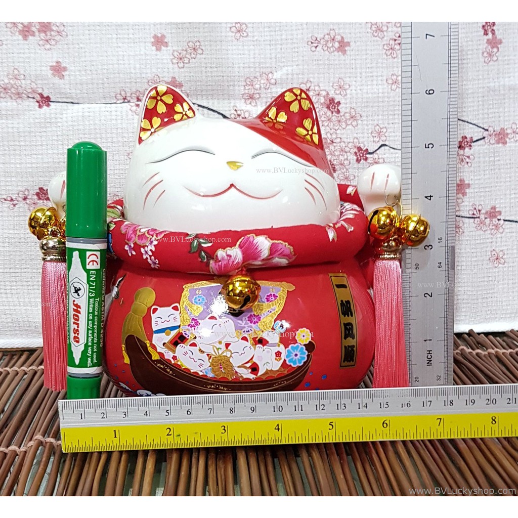 แมวกวัก แมวนำโชค แมวสไตล์ญี่ปุ่น สูง 6.5นิ้ว กวักโชคลาภเงินทอง เรียกลูกค้า - เซรามิค สีแด ง [16051-3]