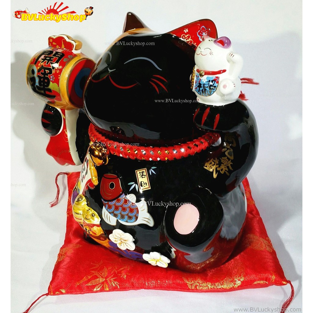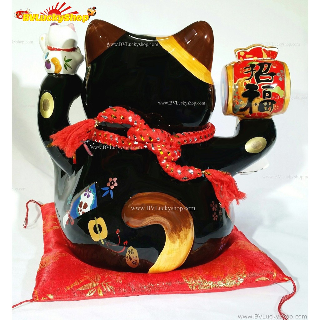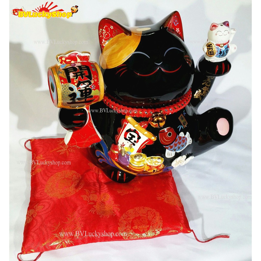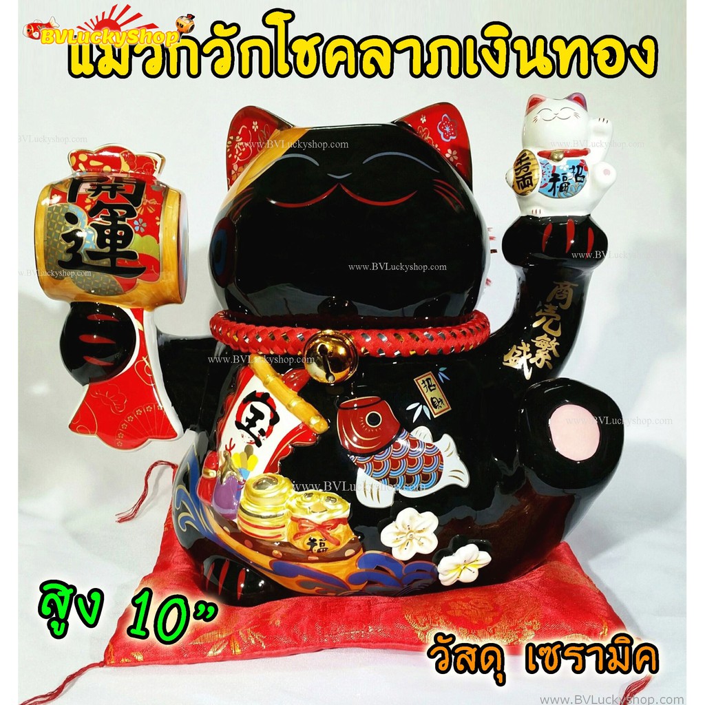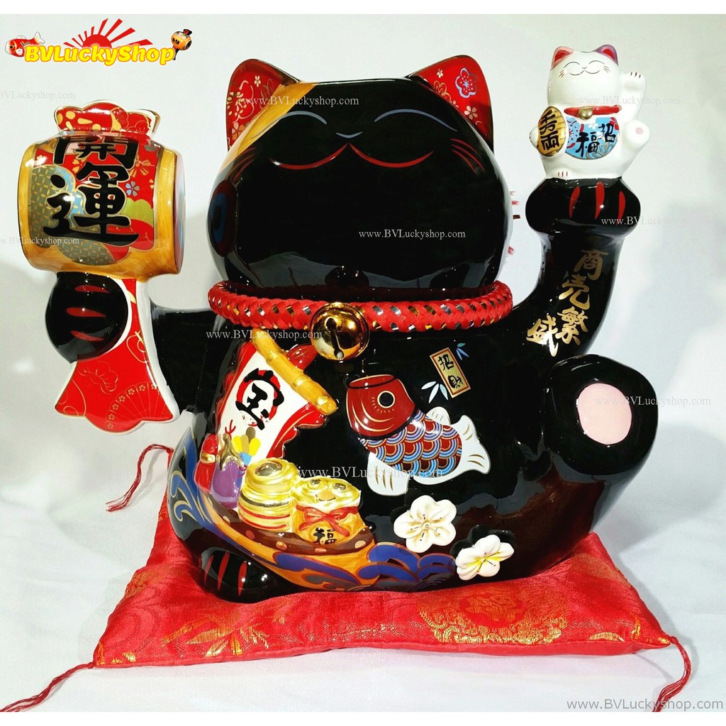 แมวกวัก แมวนำโชค สูง 10 นิ้ว ถือค้อนให้โชคลาภ และชูลูกแมว - เซรามิค , สีดำ [35932]