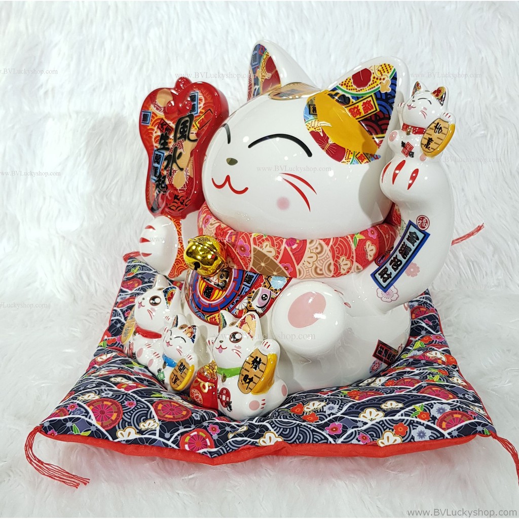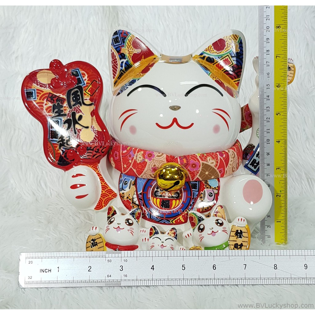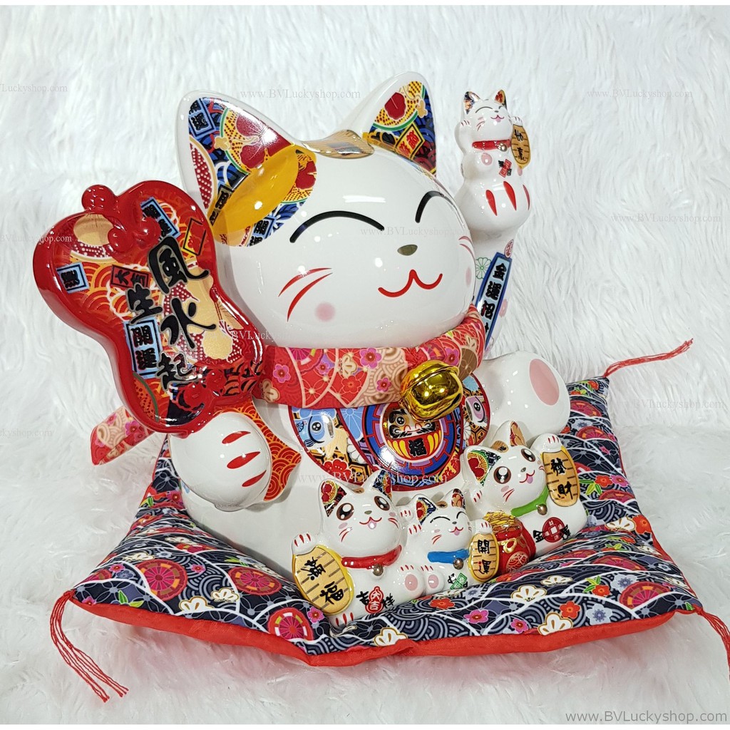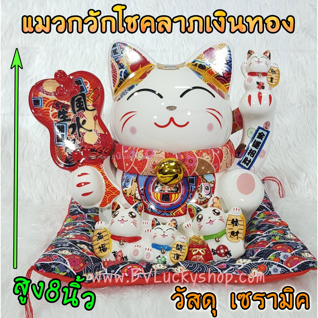 แมวกวัก แมวนำโชค ครอบครัวแมว สูง 8 นิ้ว ถือพัด -เซรามิค [86686]