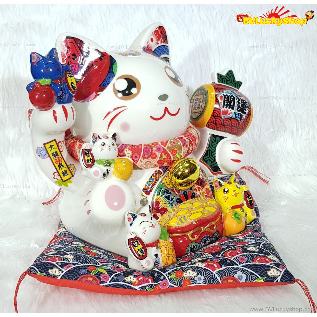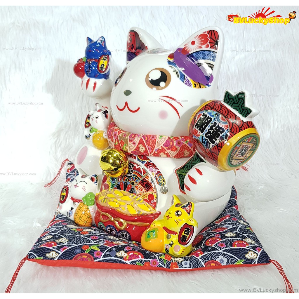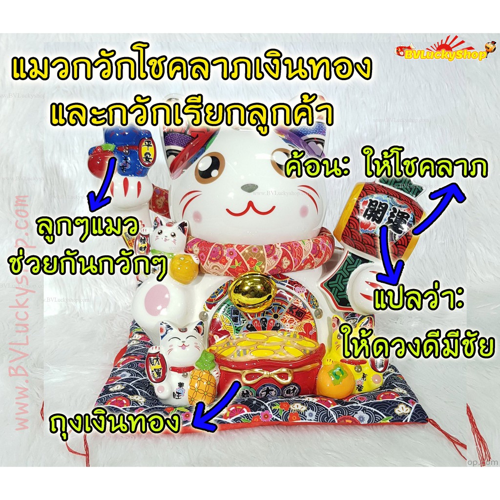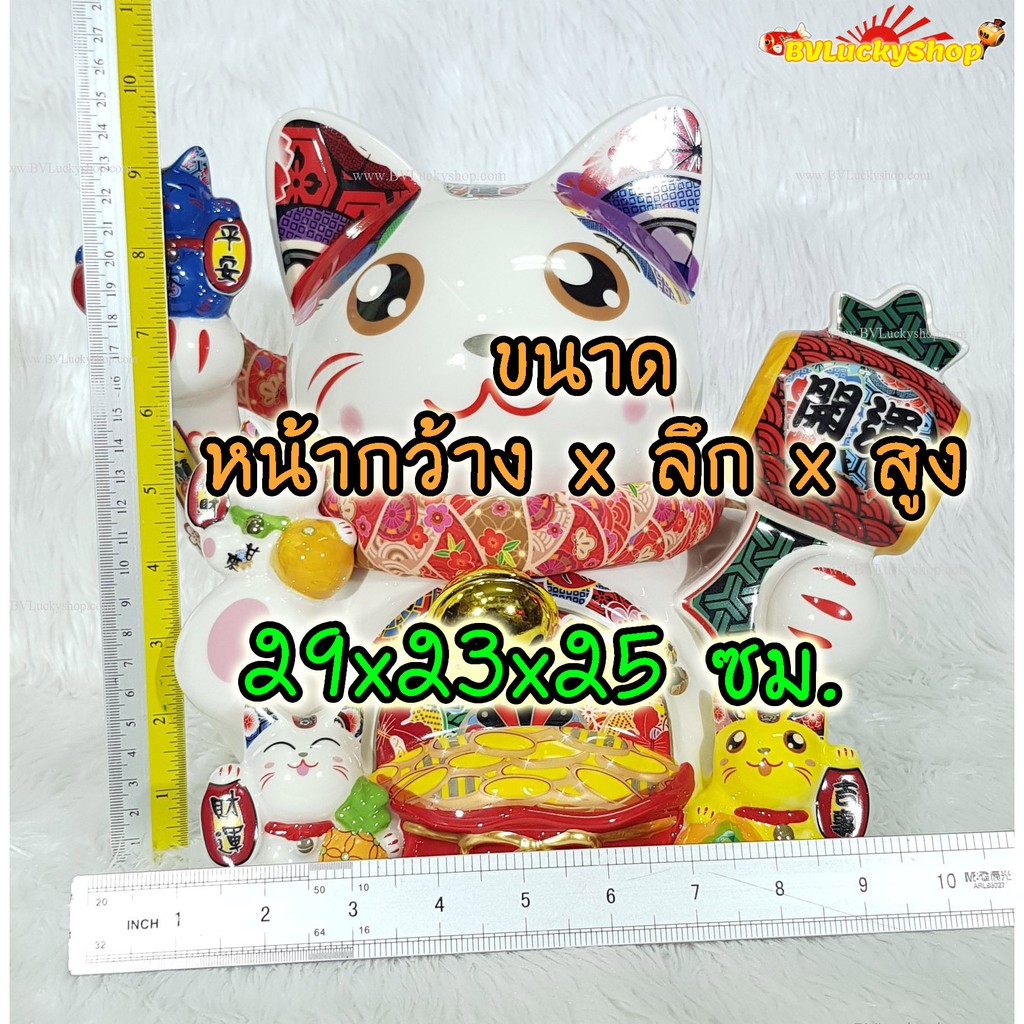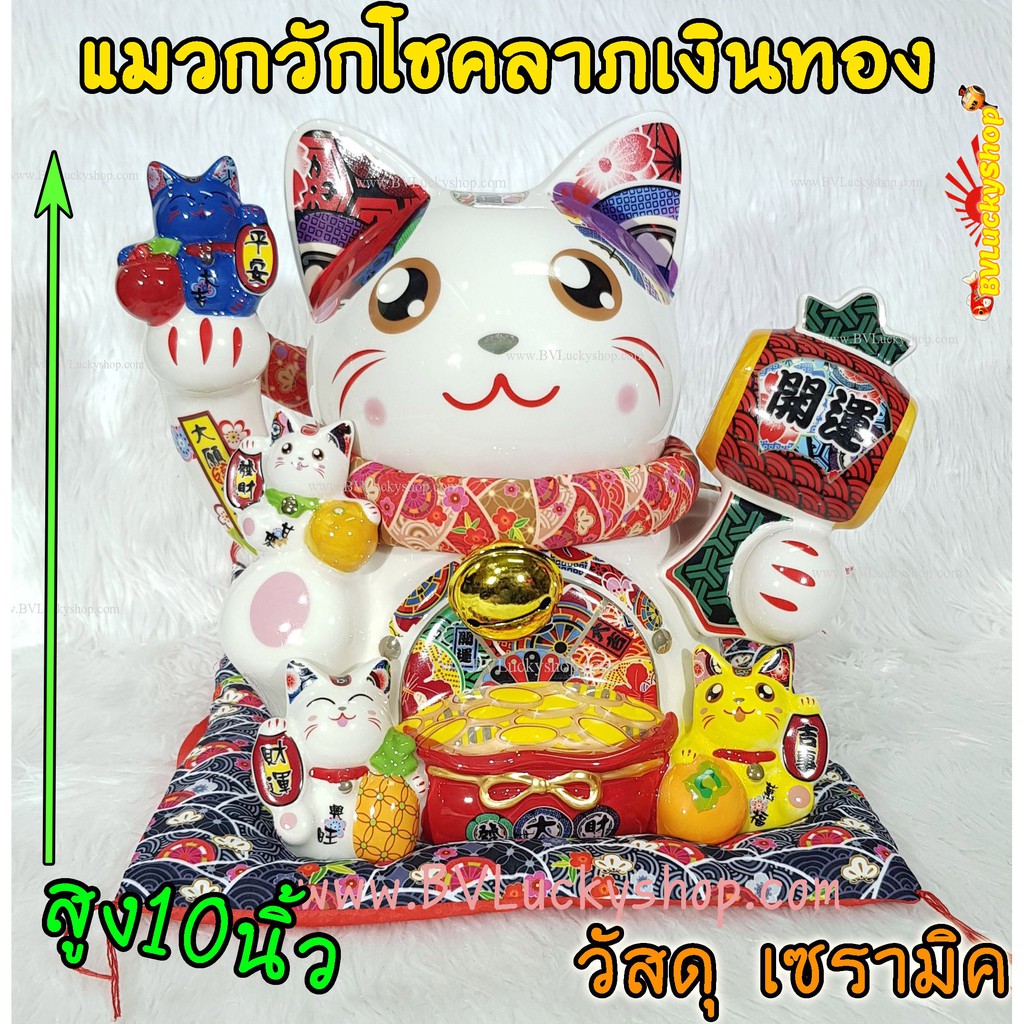 แมวกวัก แมวนำโชค ครอบครัวแมว สูง 10 นิ้ว ถือค้อนให้โชคลาภ -เซรามิค [ 86894 ]