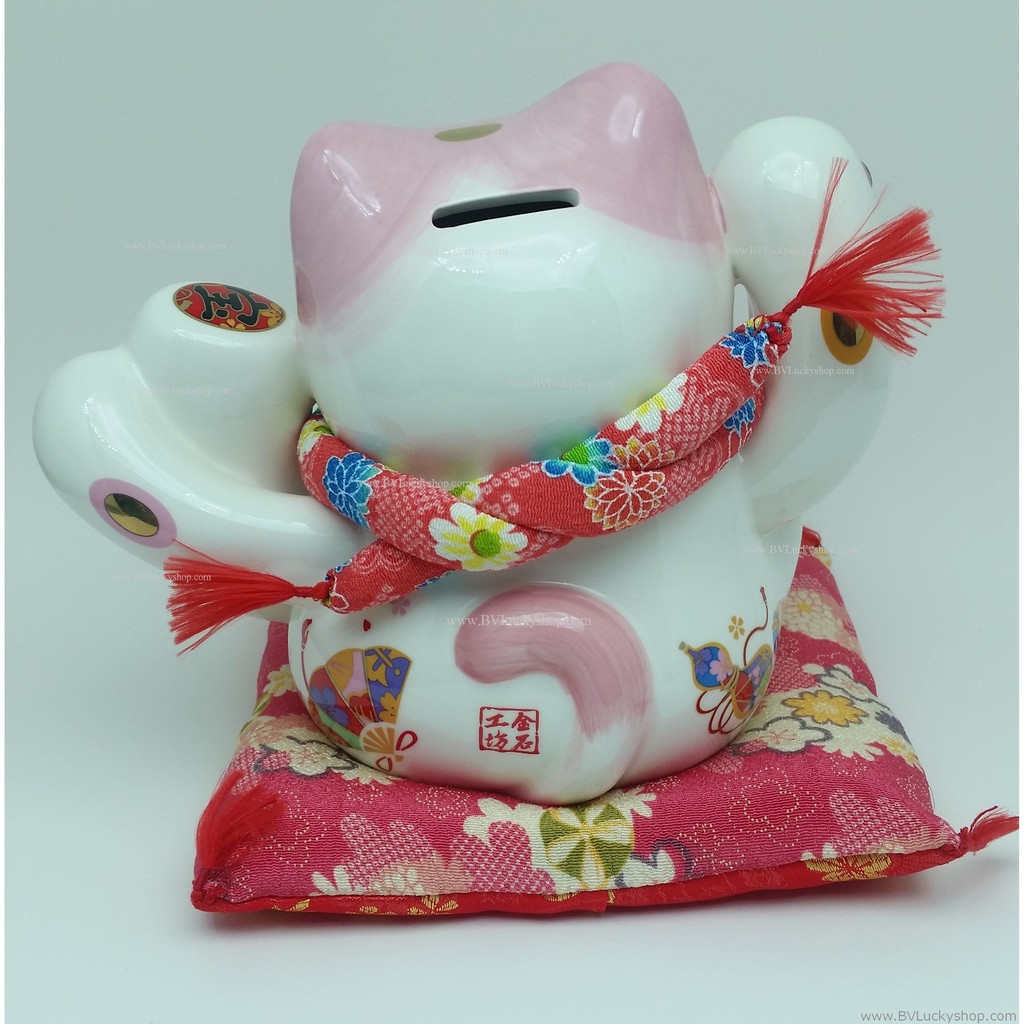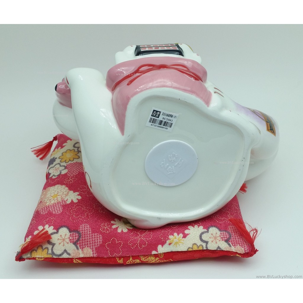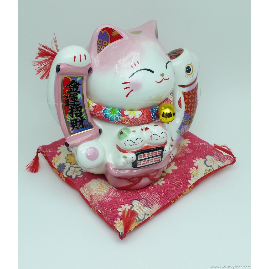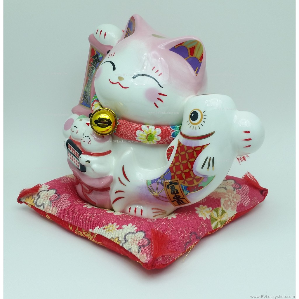 แมวกวัก แมวนำโชค สูง 7 นิ้ว ถือป้ายอวยพร และปลาคาร์พ - เซรามิค [SC2061]