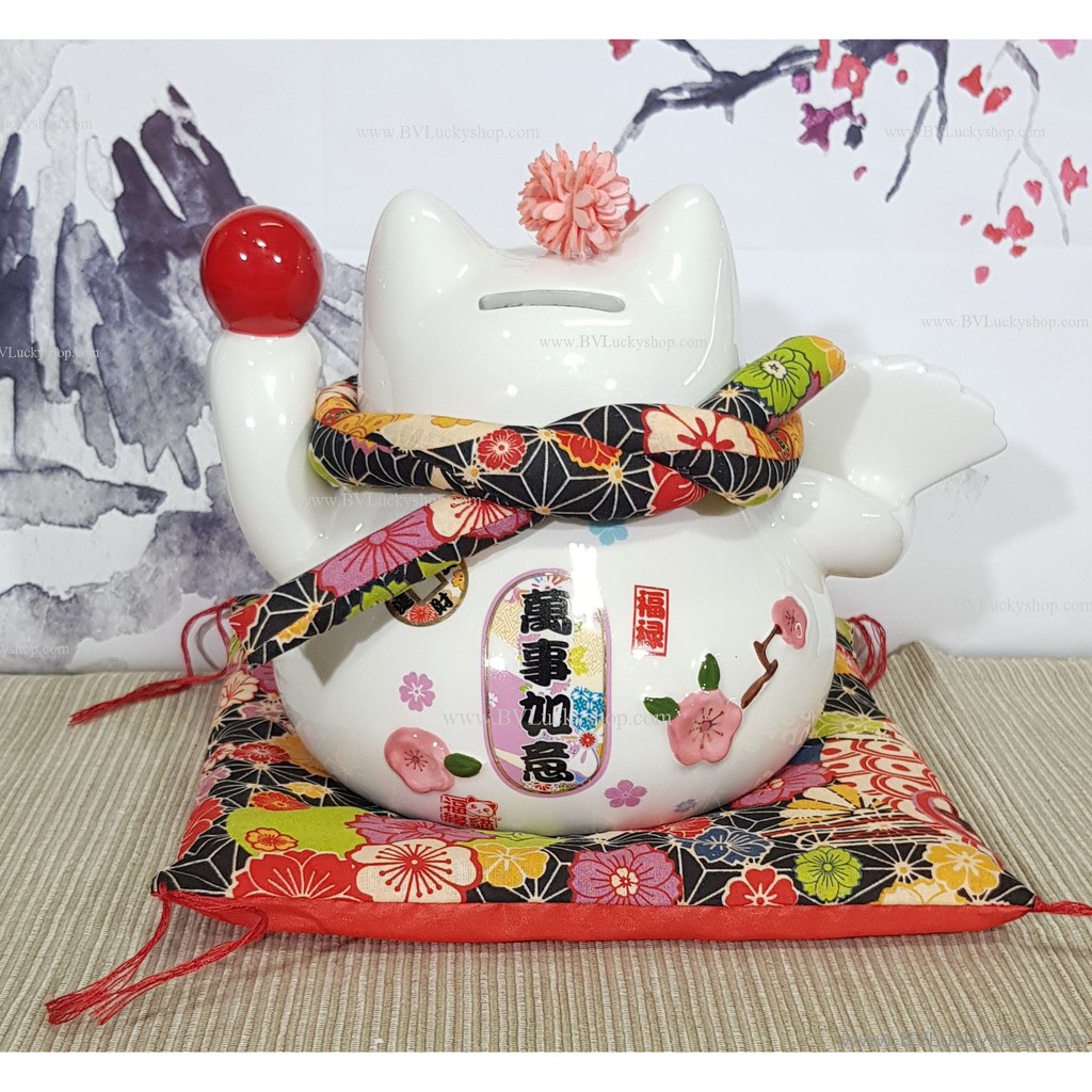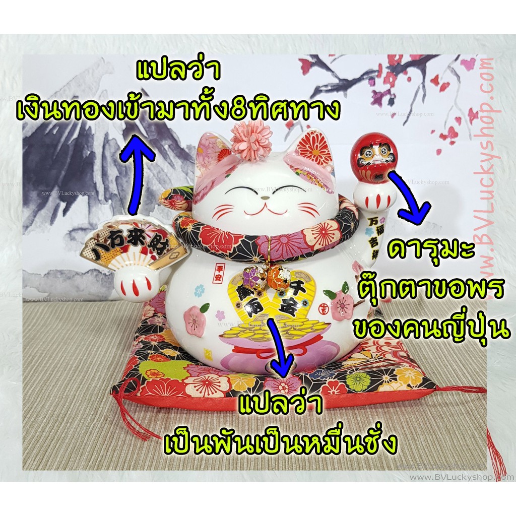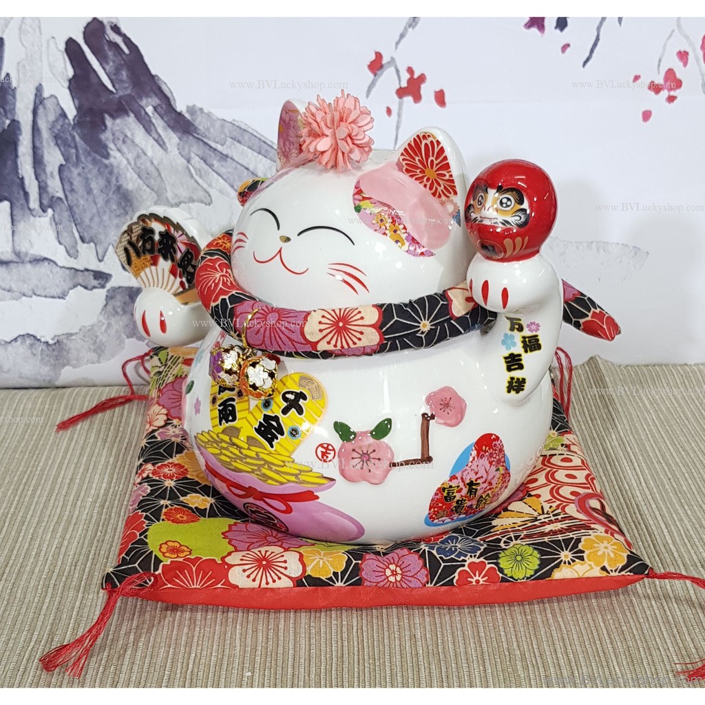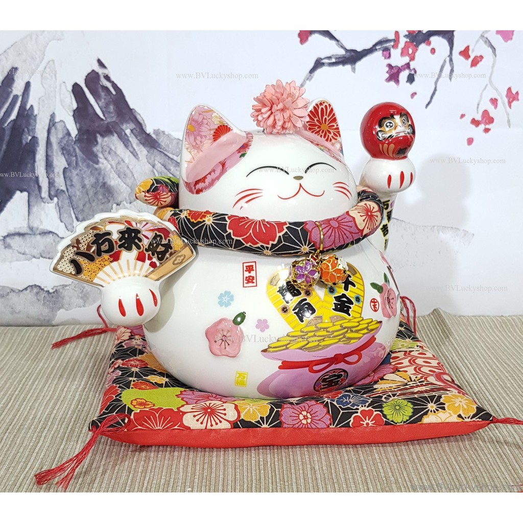 แมวกวัก แมวนำโชค สูง 5.5 นิ้ว ถือพัดและดารุมะ กวักเงินทองโชคลาภ -เซรามิค [86561]