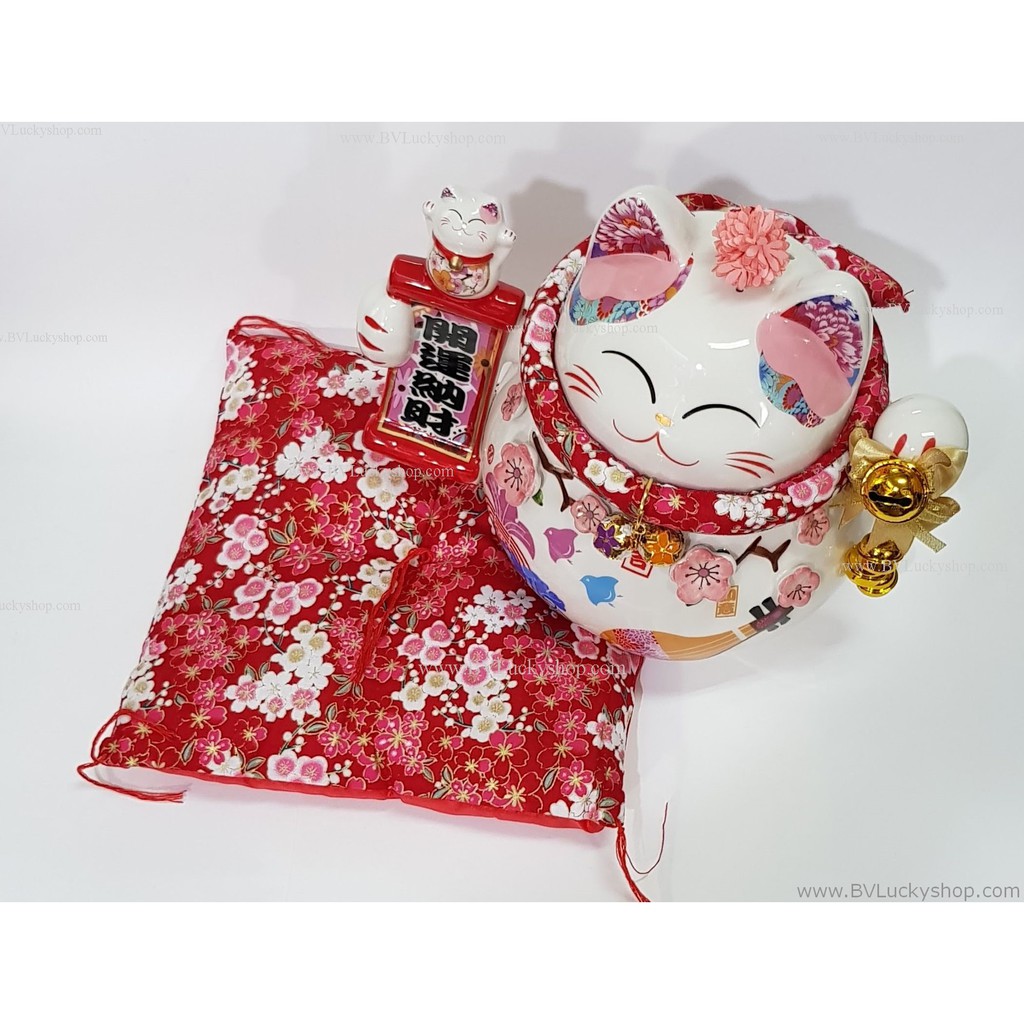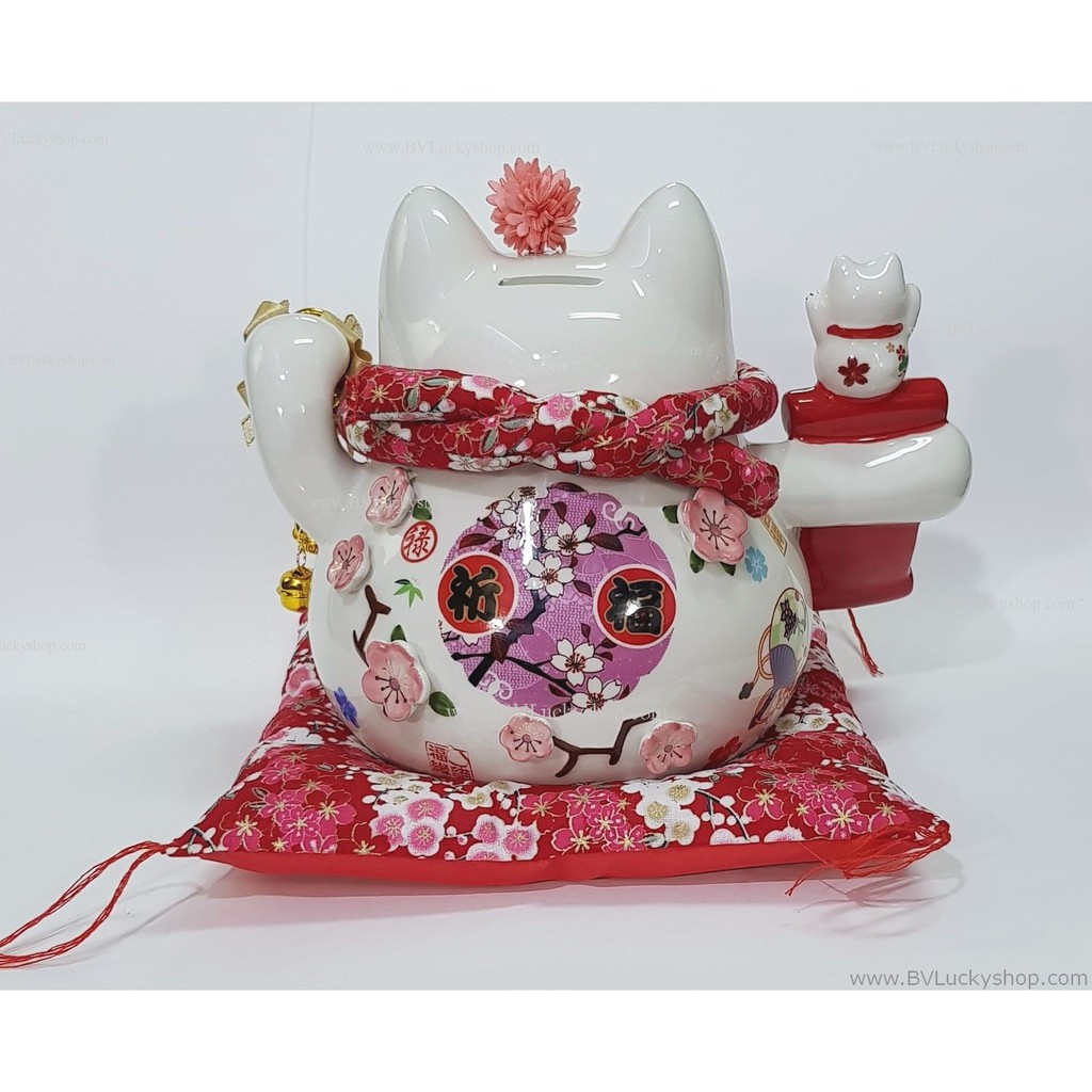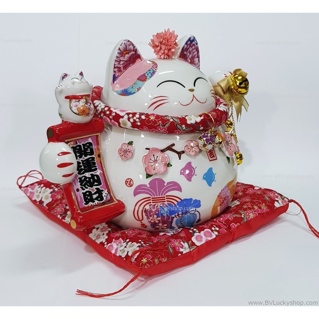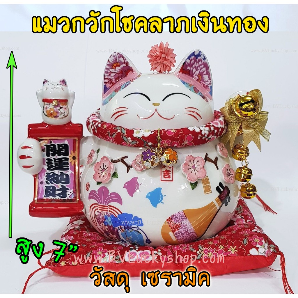 แมวกวัก แมวนำโชค สูง 7 นิ้ว ถือป้ายอวยพร กวักโชคลาภเงินทอง - เซรามิค [86880]