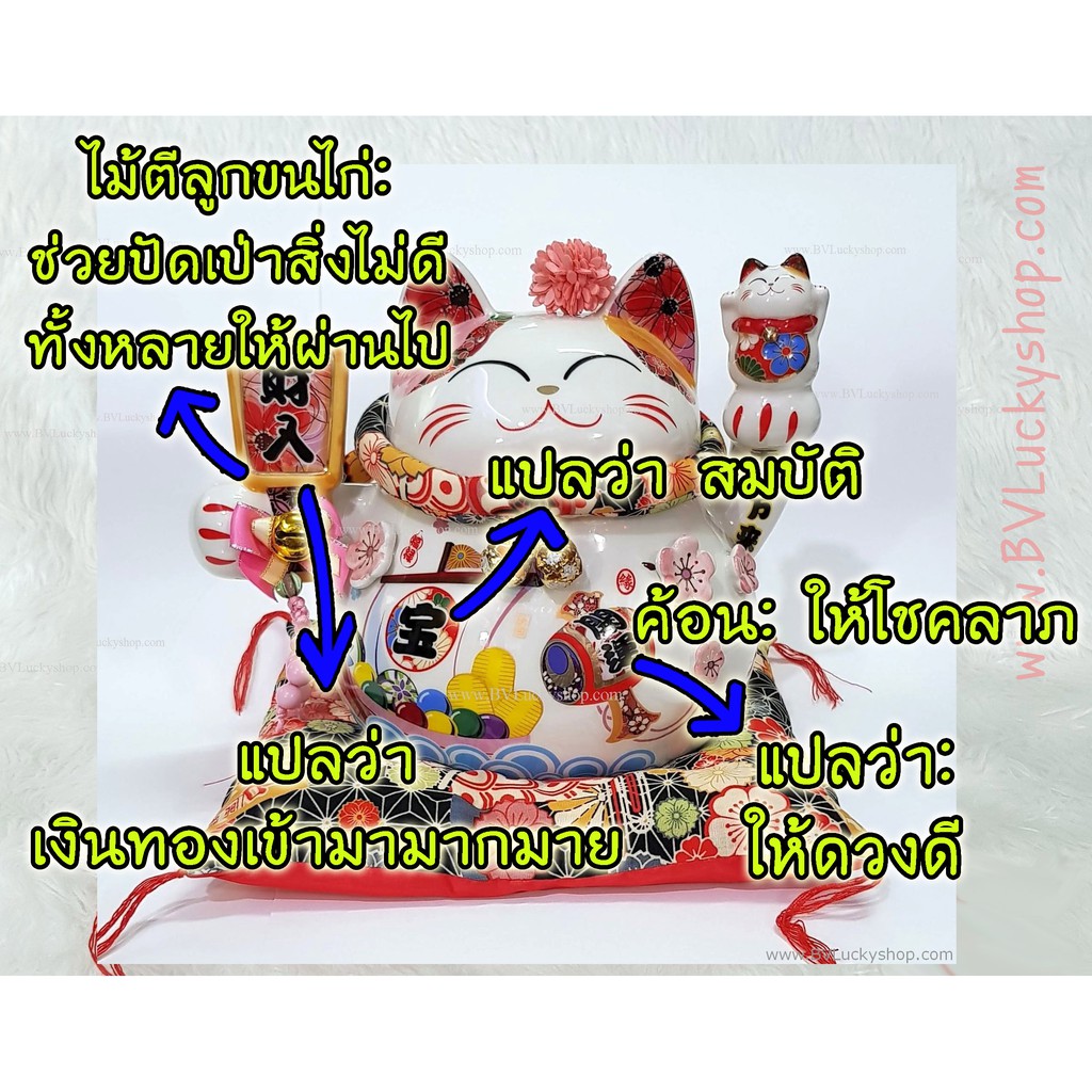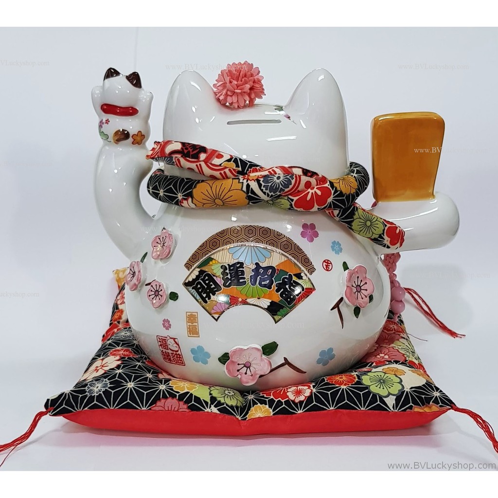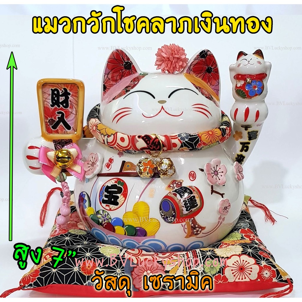 แมวกวัก แมวนำโชค สูง 7 นิ้ว ถือไม้ตีลูกขนไก่ กวักโชคลาภเงินทอง - เซรา มิค [86882]