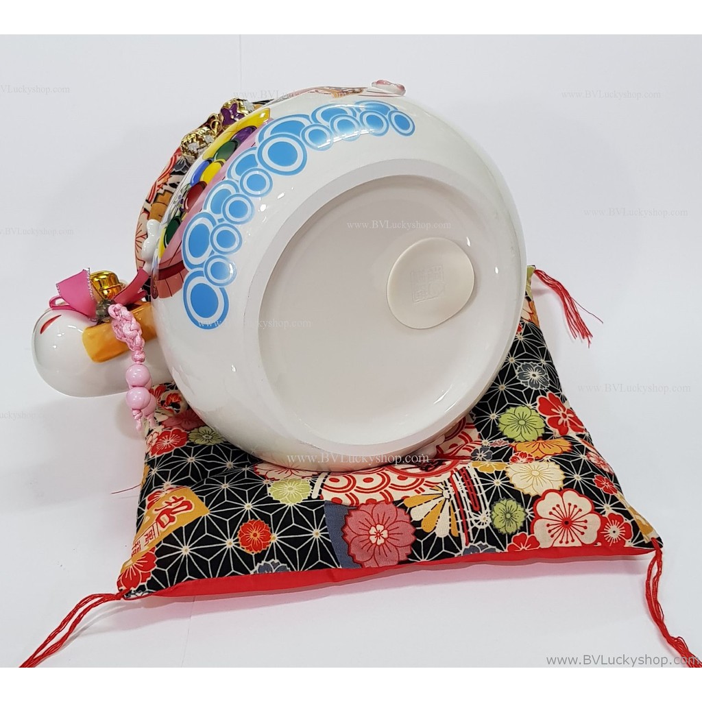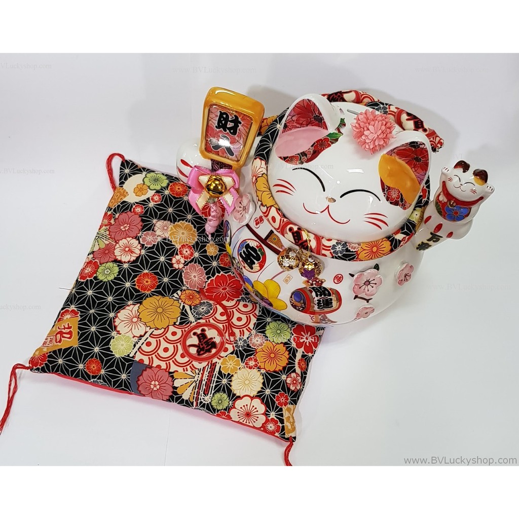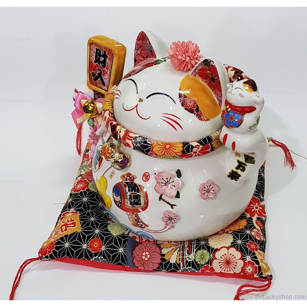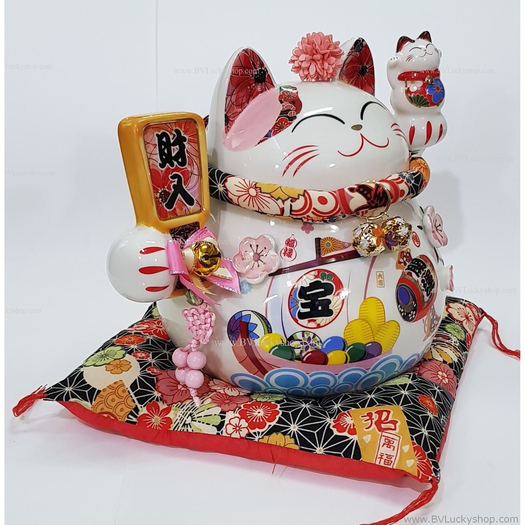 แมวกวัก แมวนำโชค สูง 7 นิ้ว ถือไม้ตีลูกขนไก่ กวักโชคลาภเงินทอง - เซรา มิค [86882]