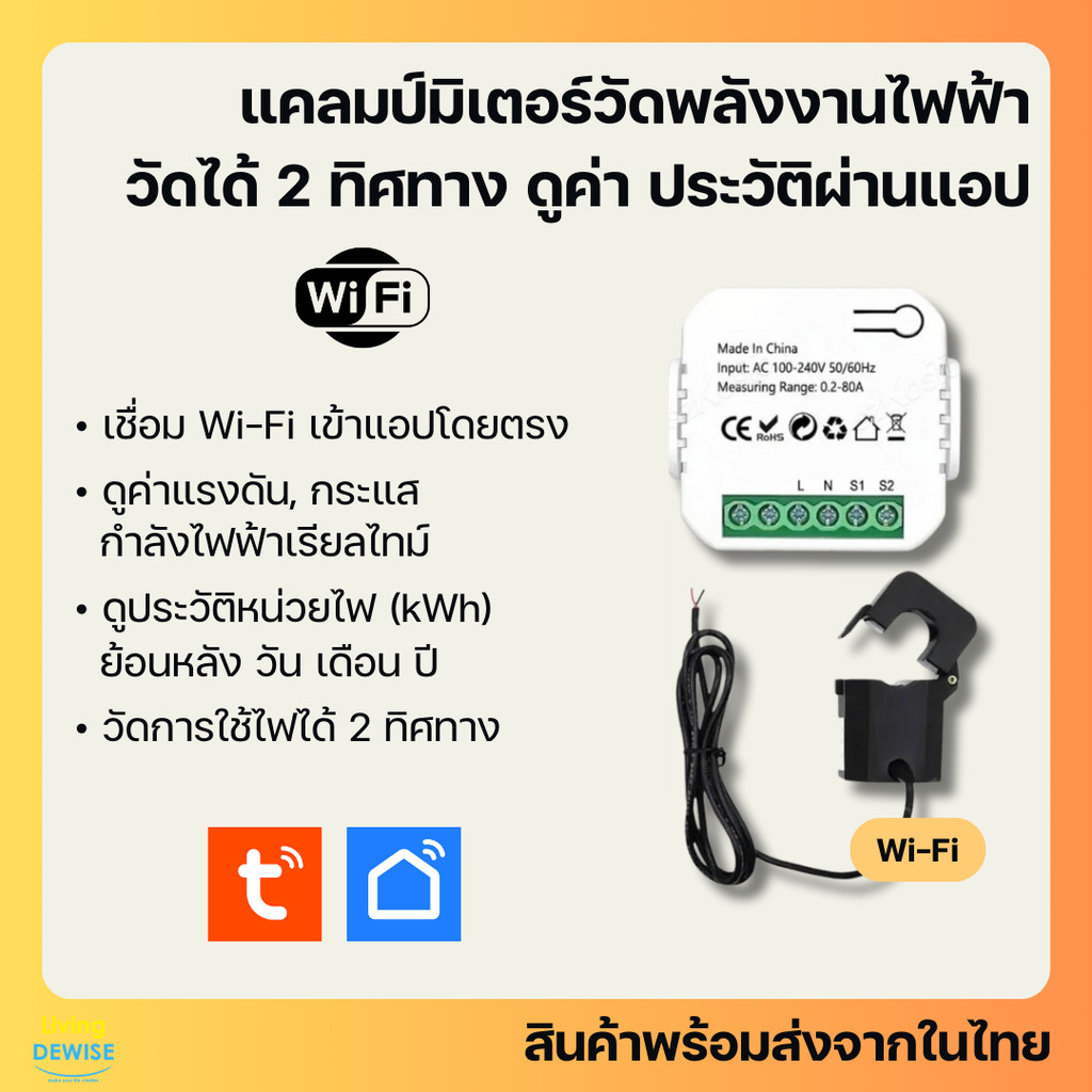 Tuya แคลมป์มิเตอร์ Wi-Fi (รุ่น PJ) วัดพลังงานไฟฟ้าได้ 2 ทิศทาง ขนาด 80A ดูค่าและประวัติผ่านแอป-Clamp Meter