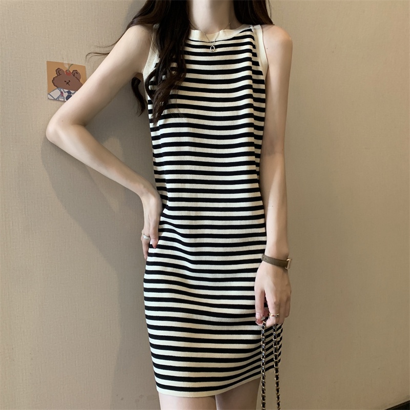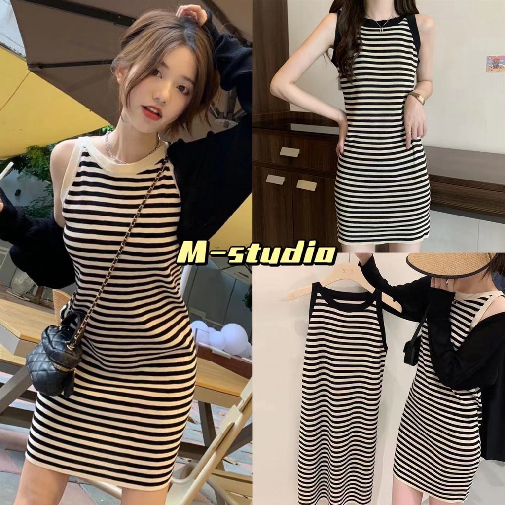 Maze*พร้อมส่ง*มินิเดรสคอกลม แขนกุดลายทางเซ็กซี่ดูหรูหราผ้าดีมาก(25053-1)