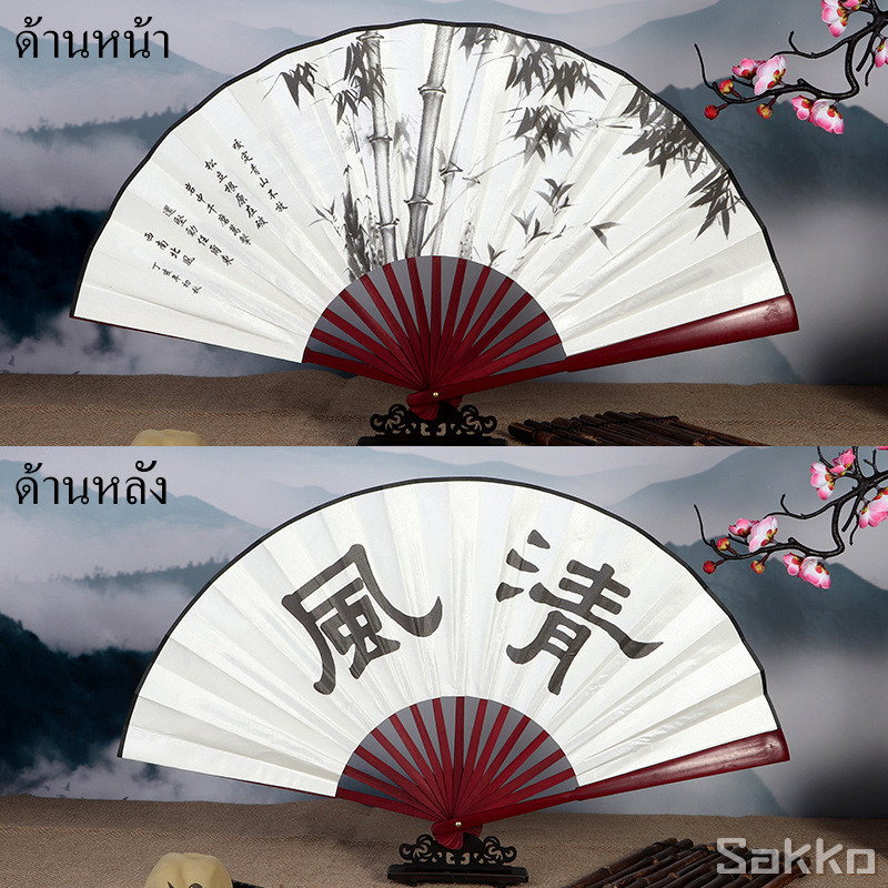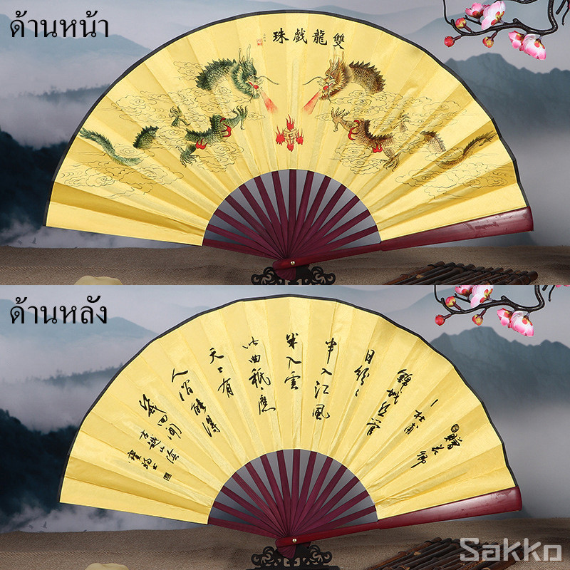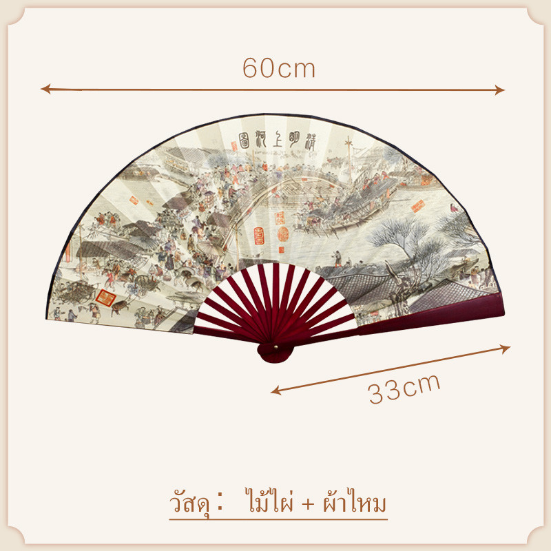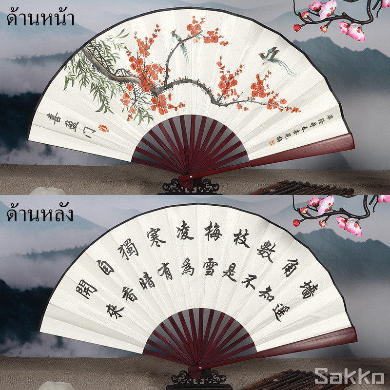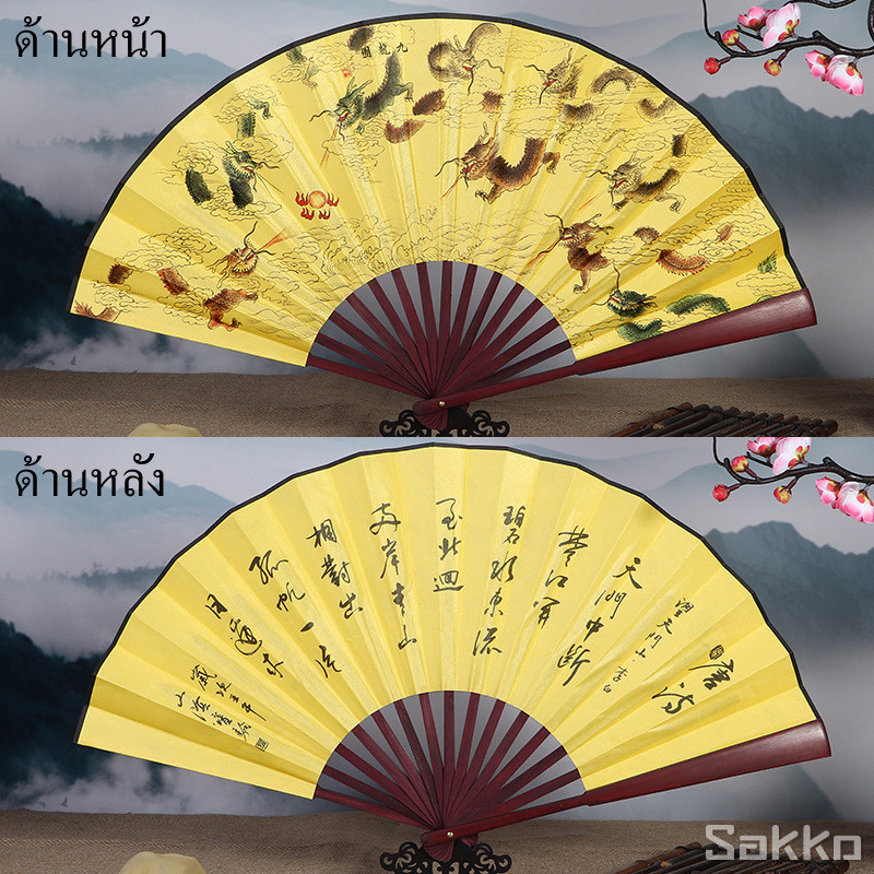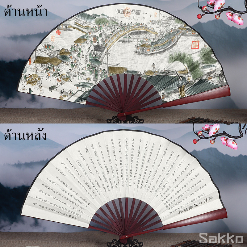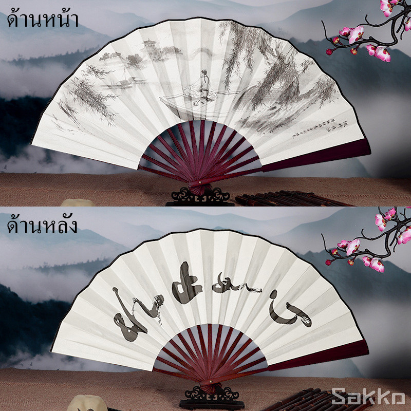 พัดจีนโบราณแบบพับได้ 13 นิ้ว ไม้ไผ่แท้+ผ้าคลาสสิก พกพาสะดวก งานหัตถกรรมประณีต