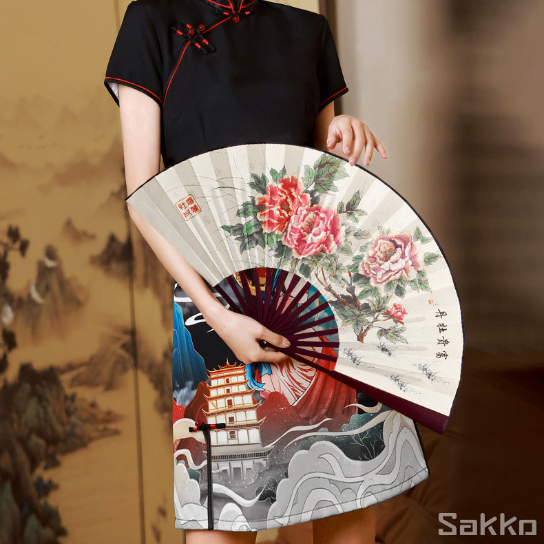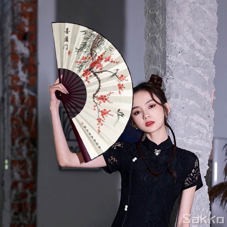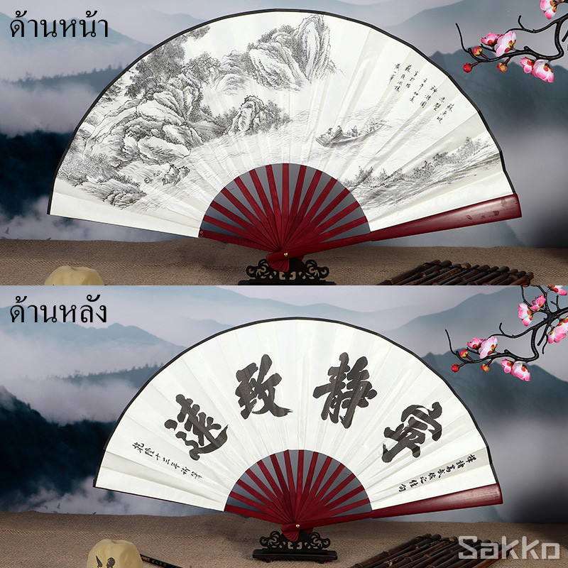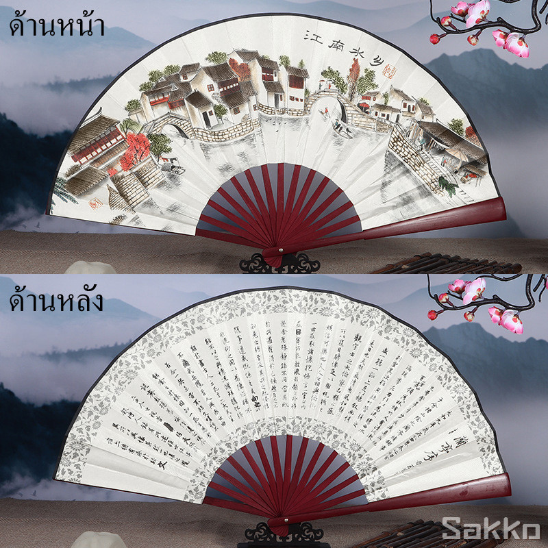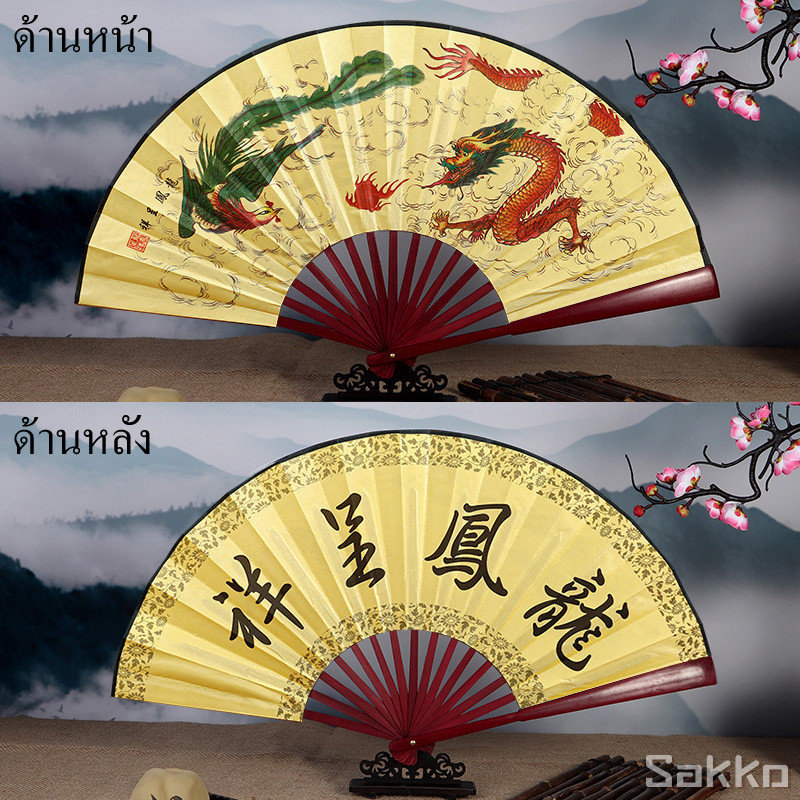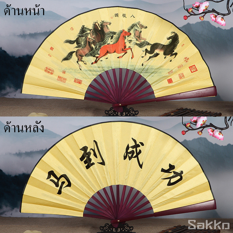 พัดจีนโบราณแบบพับได้ 13 นิ้ว ไม้ไผ่แท้+ผ้าคลาสสิก พกพาสะดวก งานหัตถกรรมประณีต
