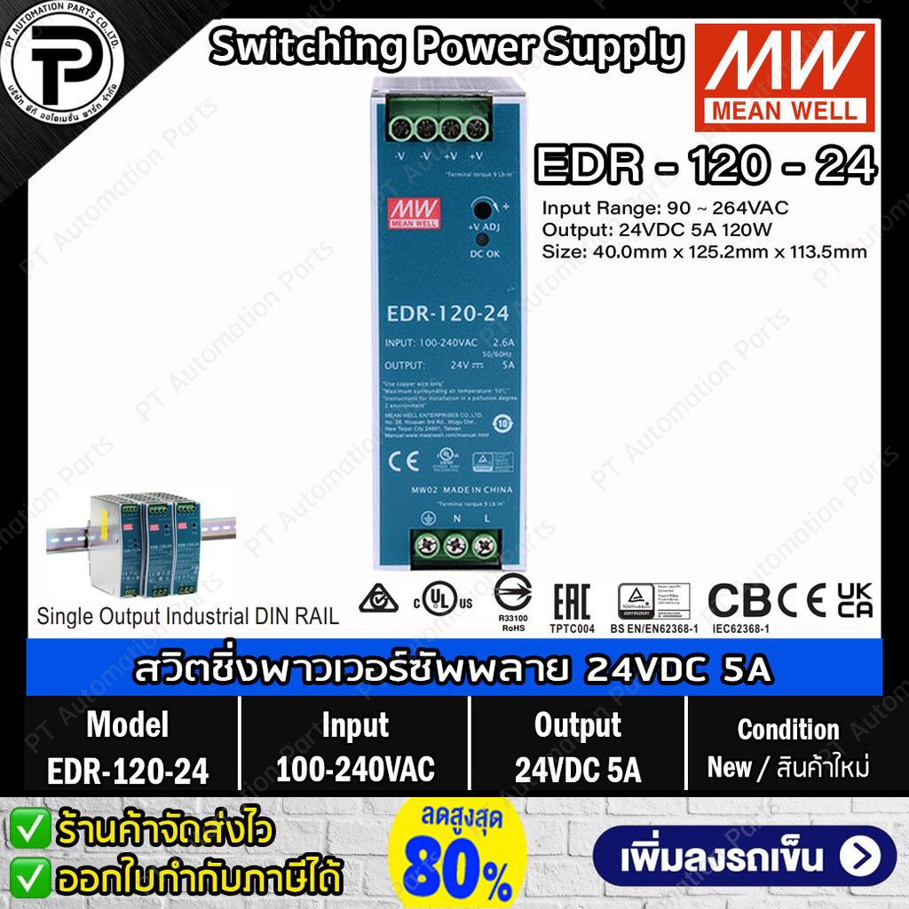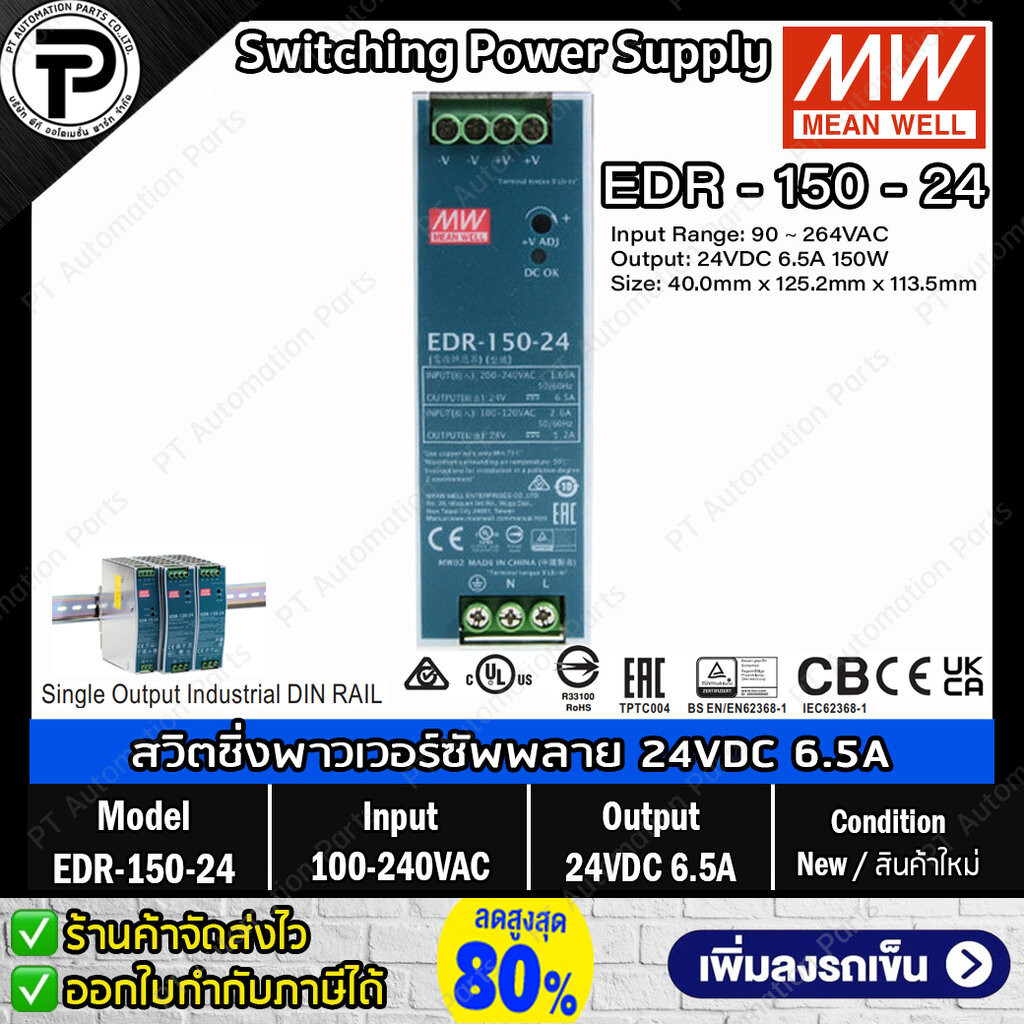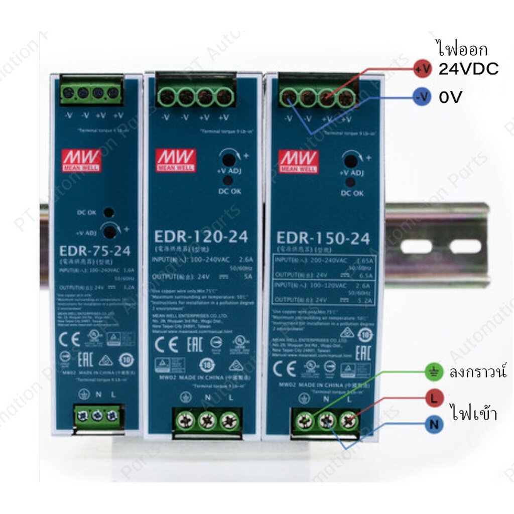 Switching Power Supply MEAN WELL EDR-75-24 EDR-120-24 EDR-150-24, 24VDC 3.2A 5A 6.5A 75W~150W AC to DC DIN RAIL สวิตช...