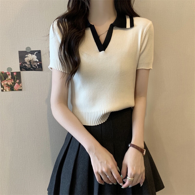Gakki เสื้อยืดโปโลครอปทรงสลิมฟิตแขนสั้น POLO เสื้อไหมพรม ผ้านิ่มใส่สบาย ฟรีไซส์ พร้อมส่ง 1590#