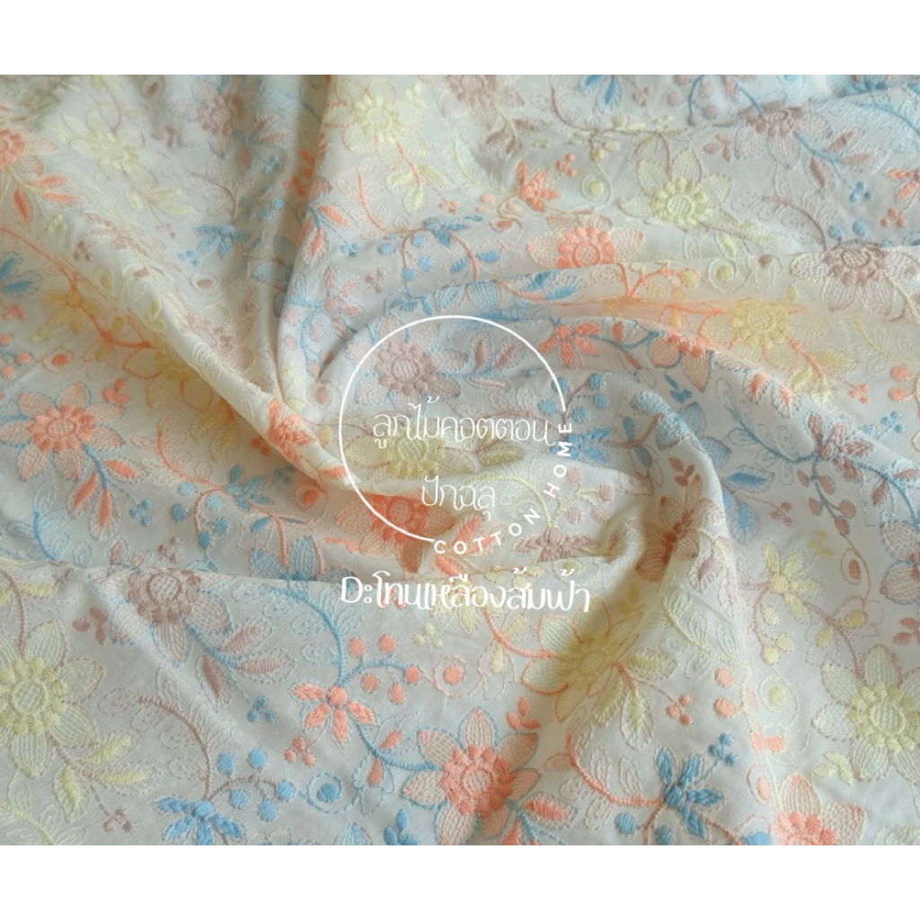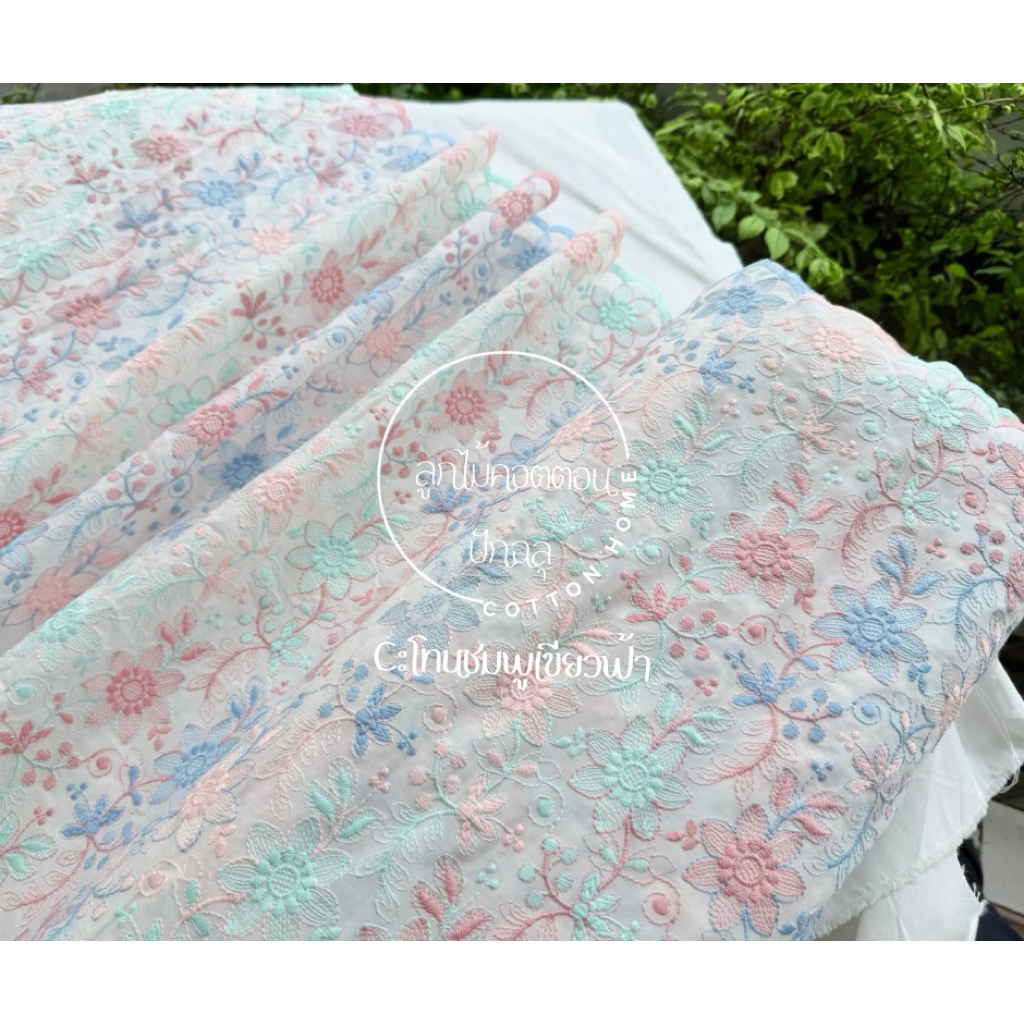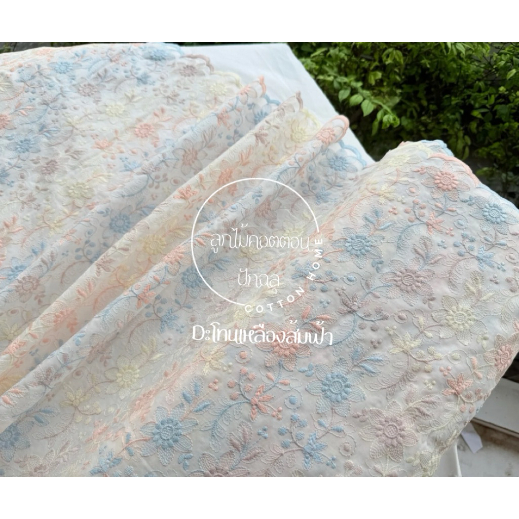 ผ้าตัดชุด ลูกไม้ปัก ผ้าป่านปักลายดอกไม้ สีสวน หน้ากว้าง40-42นิ้ว พร้อมส่ง
