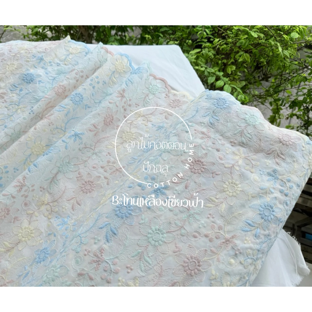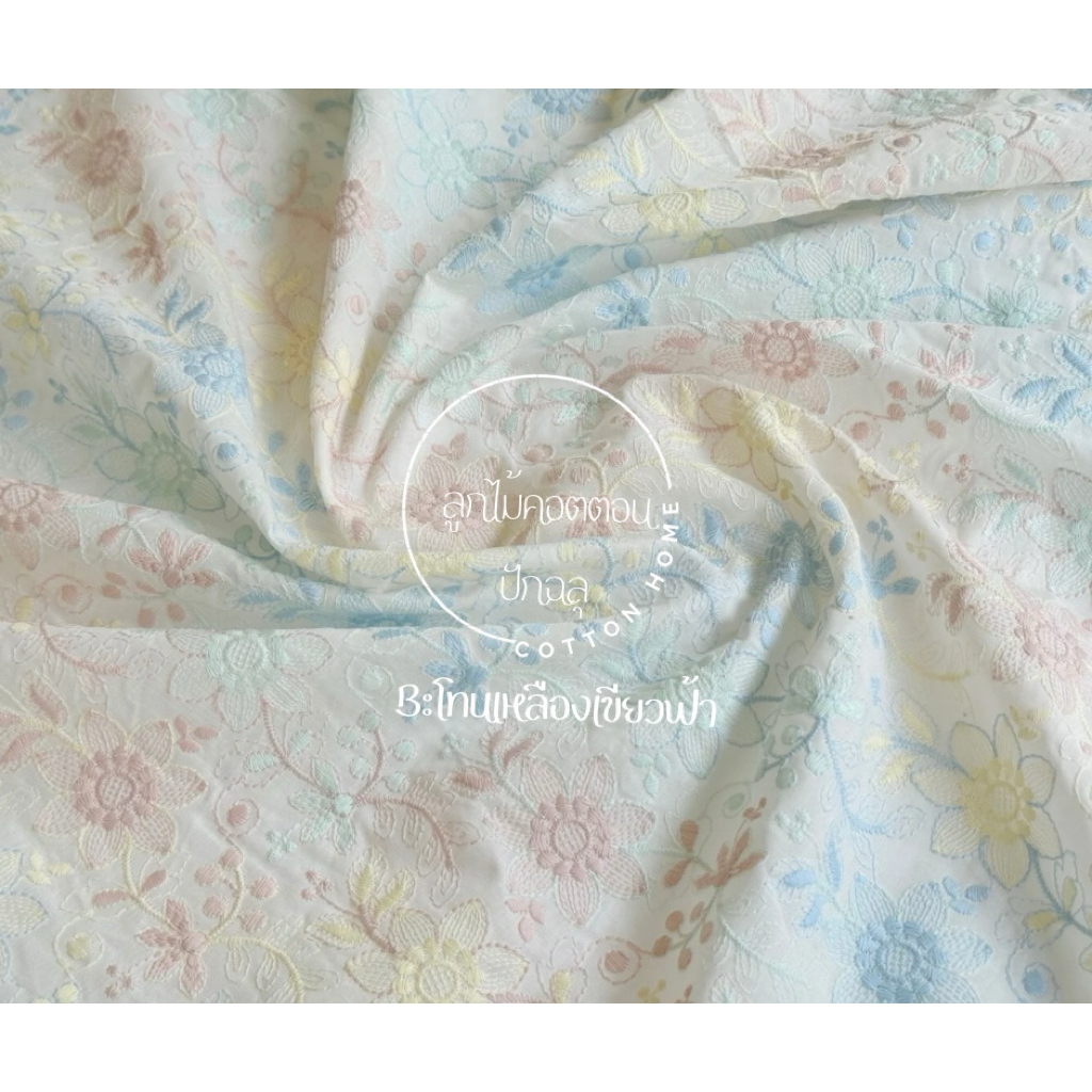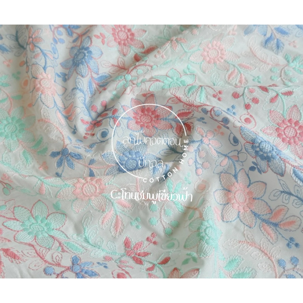 ผ้าตัดชุด ลูกไม้ปัก ผ้าป่านปักลายดอกไม้ สีสวน หน้ากว้าง40-42นิ้ว พร้อมส่ง
