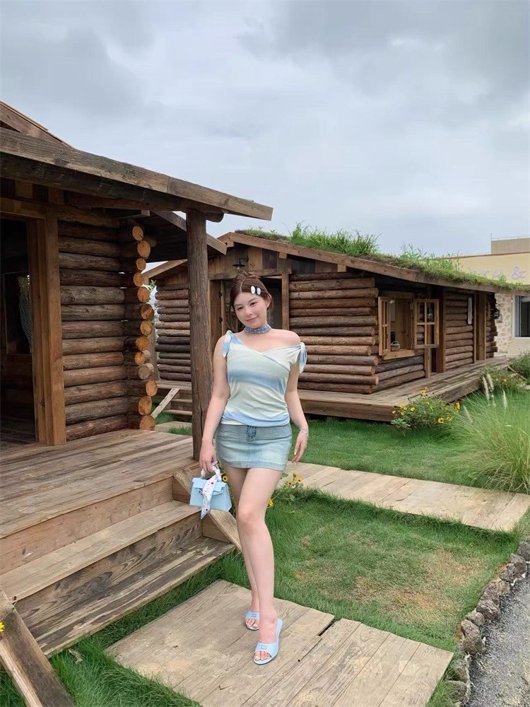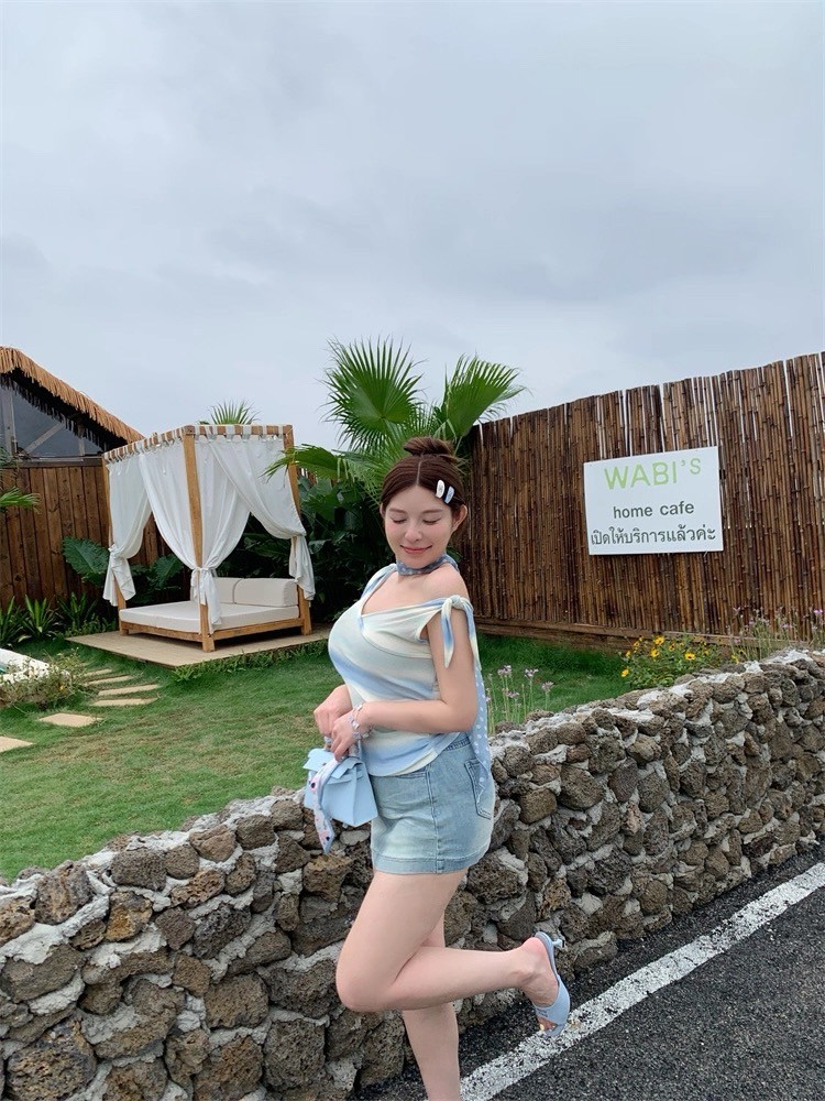 CiCi Plus+(H8895-1) เสื้อแขนกุดคอวี พิมพ์ลายไล่เส้นสี จั้มเอวผ้าโปร่งยืด ดีเทลผูกโบว์ตรงแขนน่ารักๆ สไตล์ไม่ซ้ำใคร