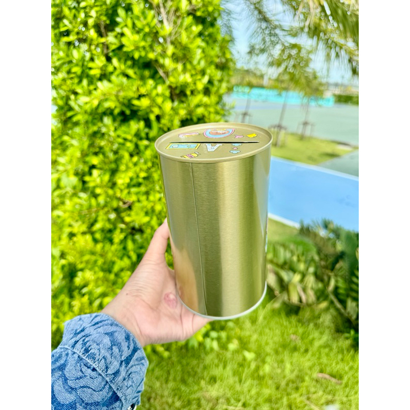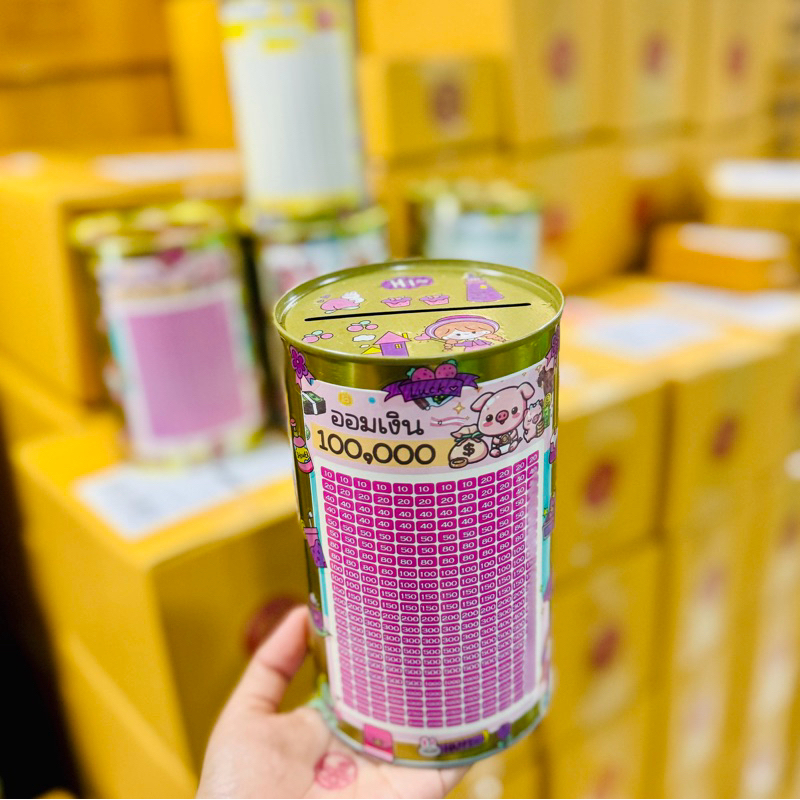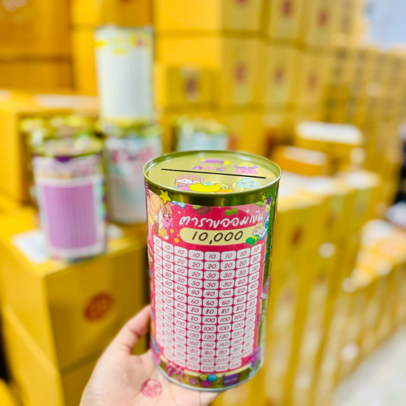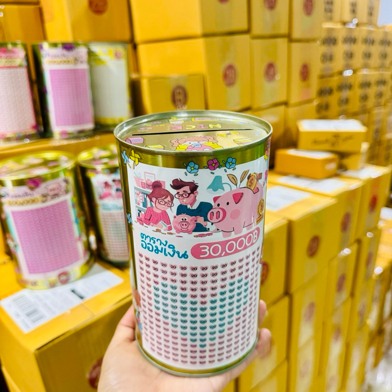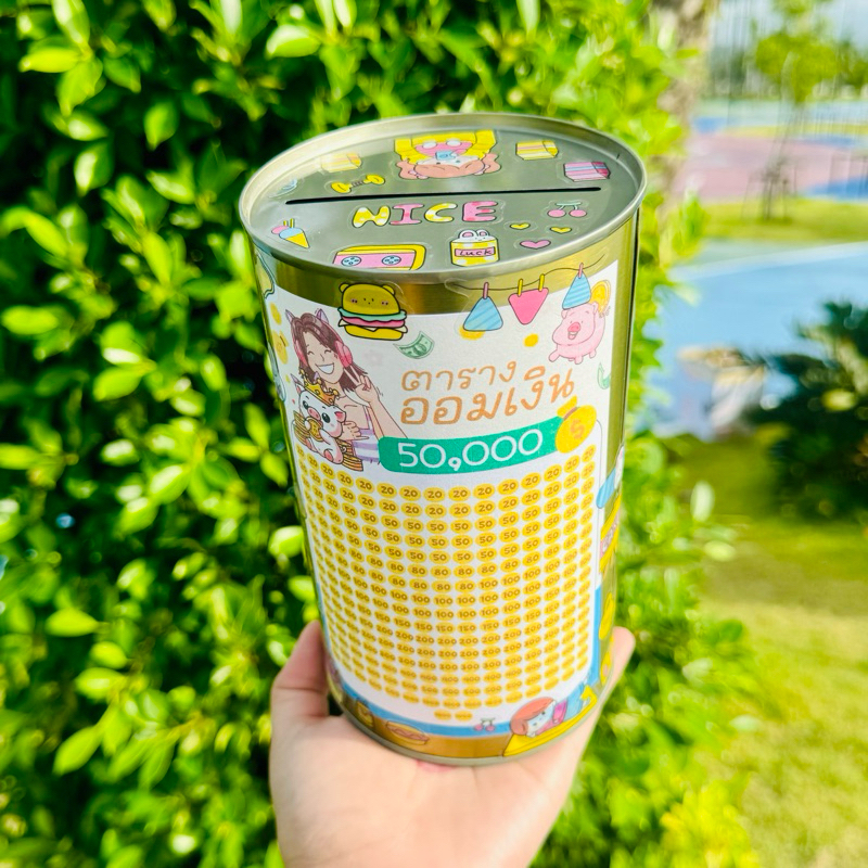 กระปุกออมสินปี๊บทรงกลมเล็ก พร้อมตารางออมและสติกเกอร์ตกแต่ง