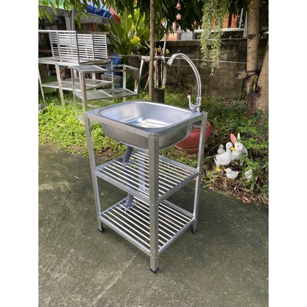 ซิงค์ล้างจาน อ่างล้างจานอลูมิเนียม 1 หลุม 3 ชั้น + ก็อกน้ำทรงโค้ง ดีไซน์สวย ทันสมัย