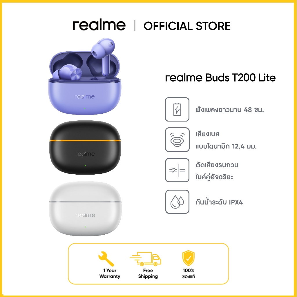 realme bud T200 lite ไดร์เวอเบสไดนามิก 12.4 mm ไมค์ AI คู่ bluetooth 5.4ใช้งานยาวนานสูงสุด 48 ชั่วโมง