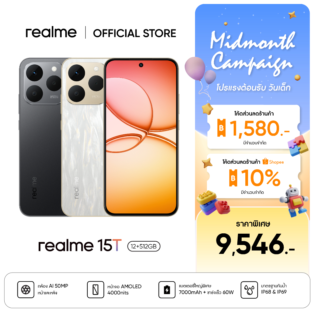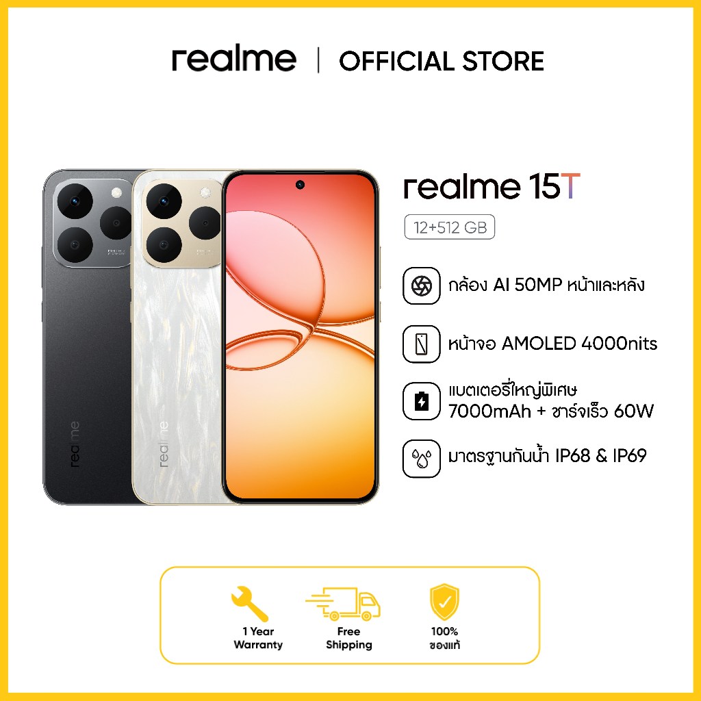 [New]realme 15 T [12+512] |ชิปเซ็ต MTK 6400 Max กล้องAI หน้า+หลัง 50MP ชาร์จไว 60w IP69 แบตเตอรี่ 7,000 mAh
