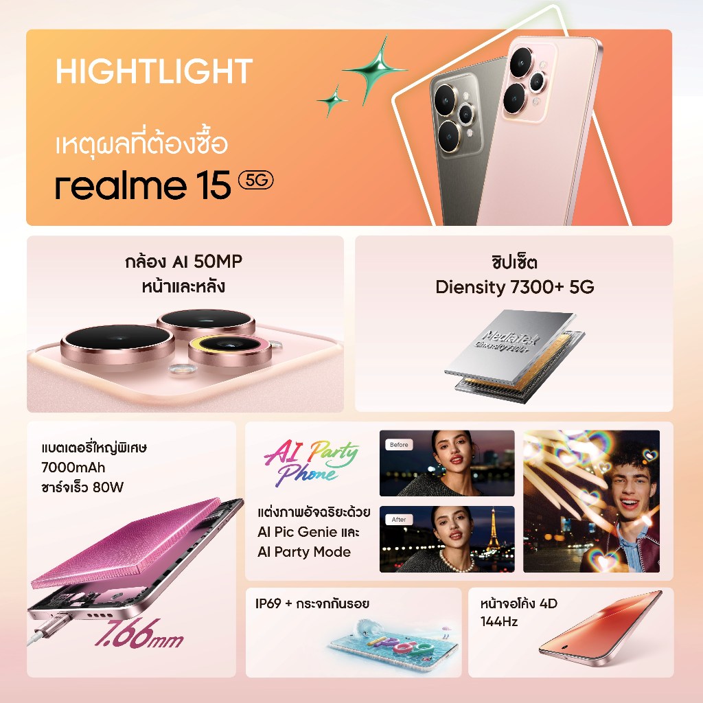 [New]realme 15 5g [12+256] |ชิปเซ็ต Dimensity 7300+ 5g กล้องAI หน้า+หลัง 50MP ชาร์จไว 80w IP69 แบตเตอรี่ 7,000 mAh