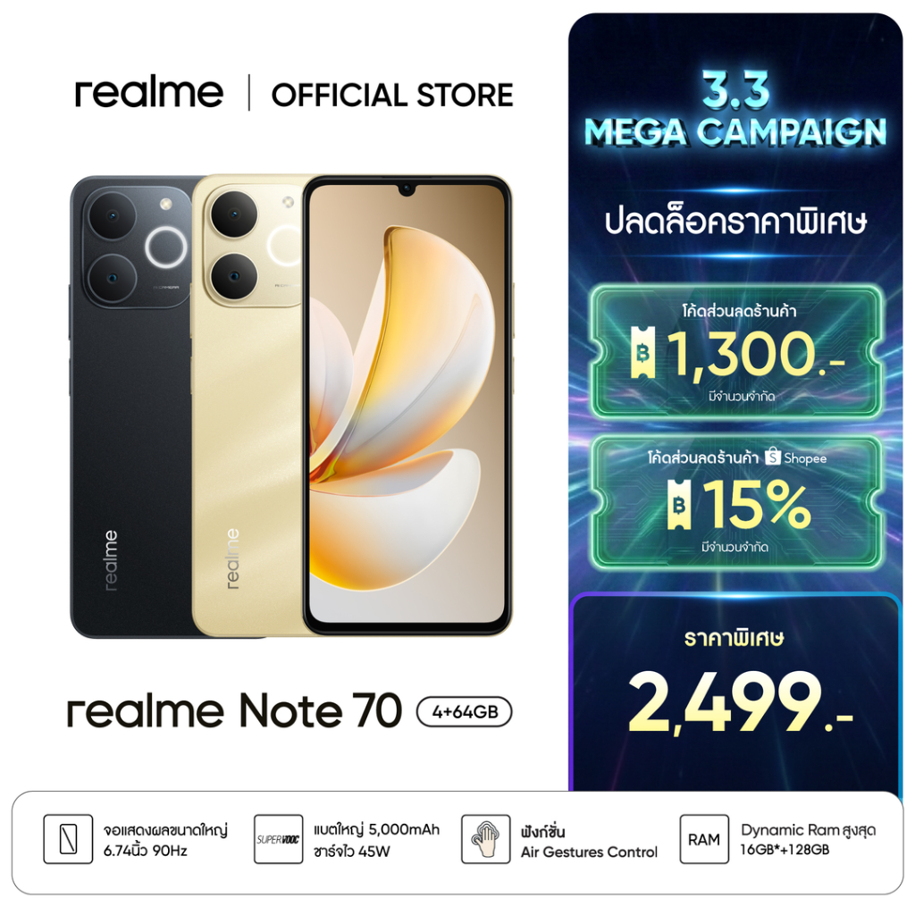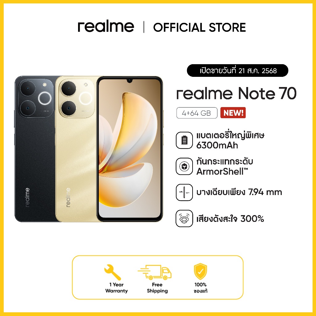 [New] realme Note 70 (4+64) | สมาร์ทโฟนทนการกระแทก กันน้ำกันฝุ่น IP54 ใช้งานราบลื่นไหล แบตเตอรี่ 6300 mAh