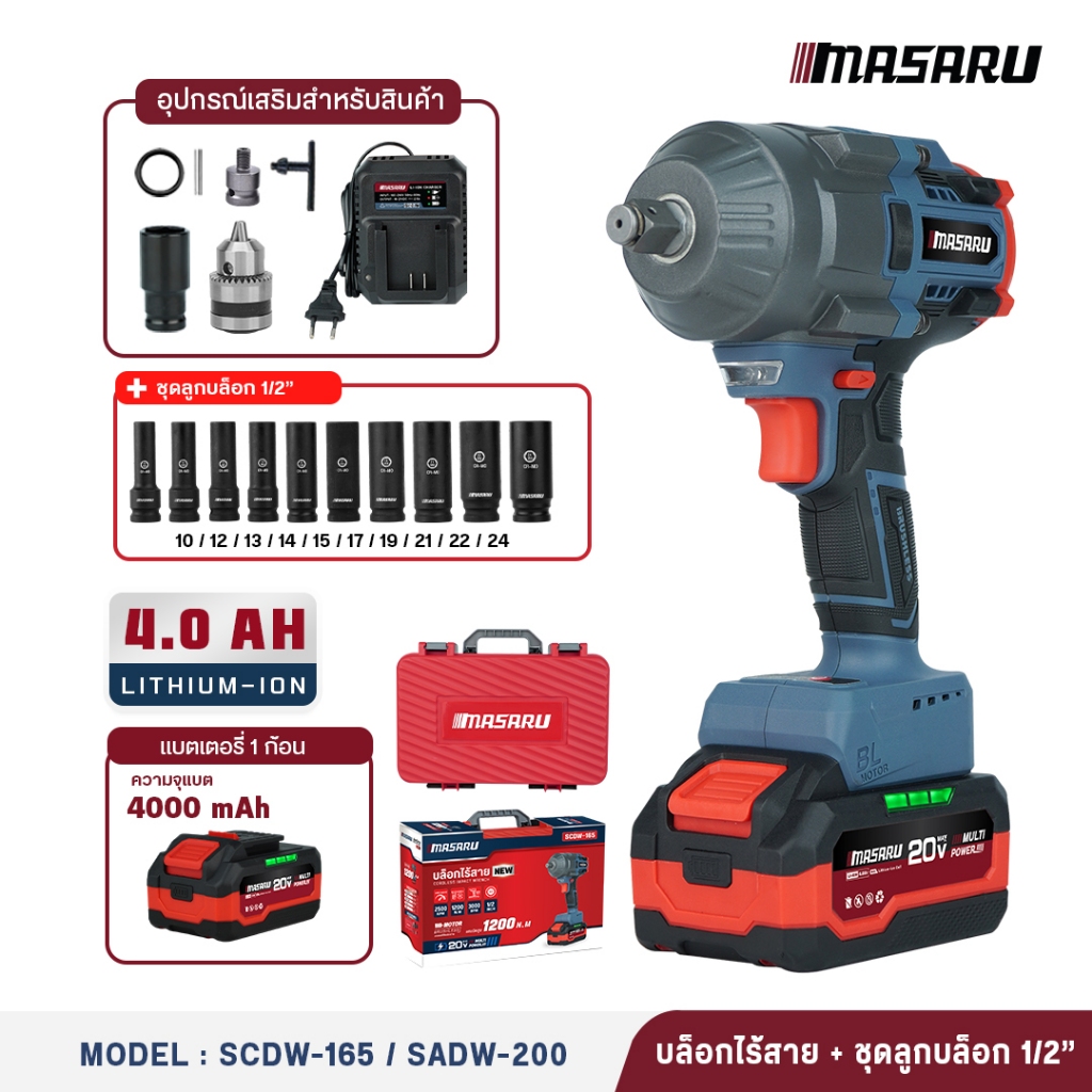 MASARU SCDW-130/160/165 บล็อกแบตเตอรี่ไร้สาย บล็อคไฟฟ้าไร้สาย 500/800/1200nm บล็อกไฟฟ้า masaru