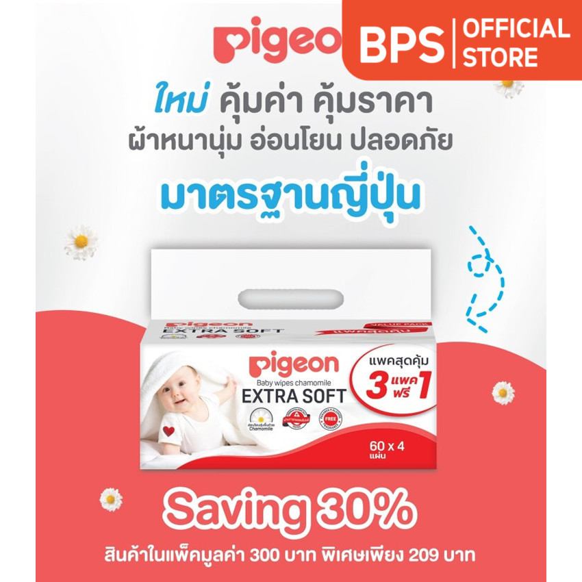 พีเจ้น เบบี้ไวพส์ กระดาษเย็น สูตรคาโมมายล์ ผ้าหนานุ่ม ห่อล่ะ 60 แผ่น แพ็ค 3+1 ห่อ PIGEON BABY WIPES CHAMOMILE 60 SHEETS